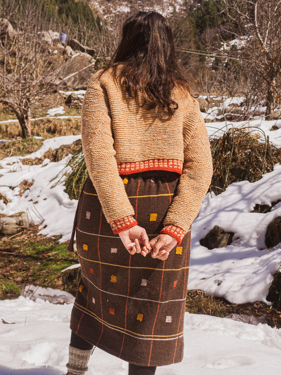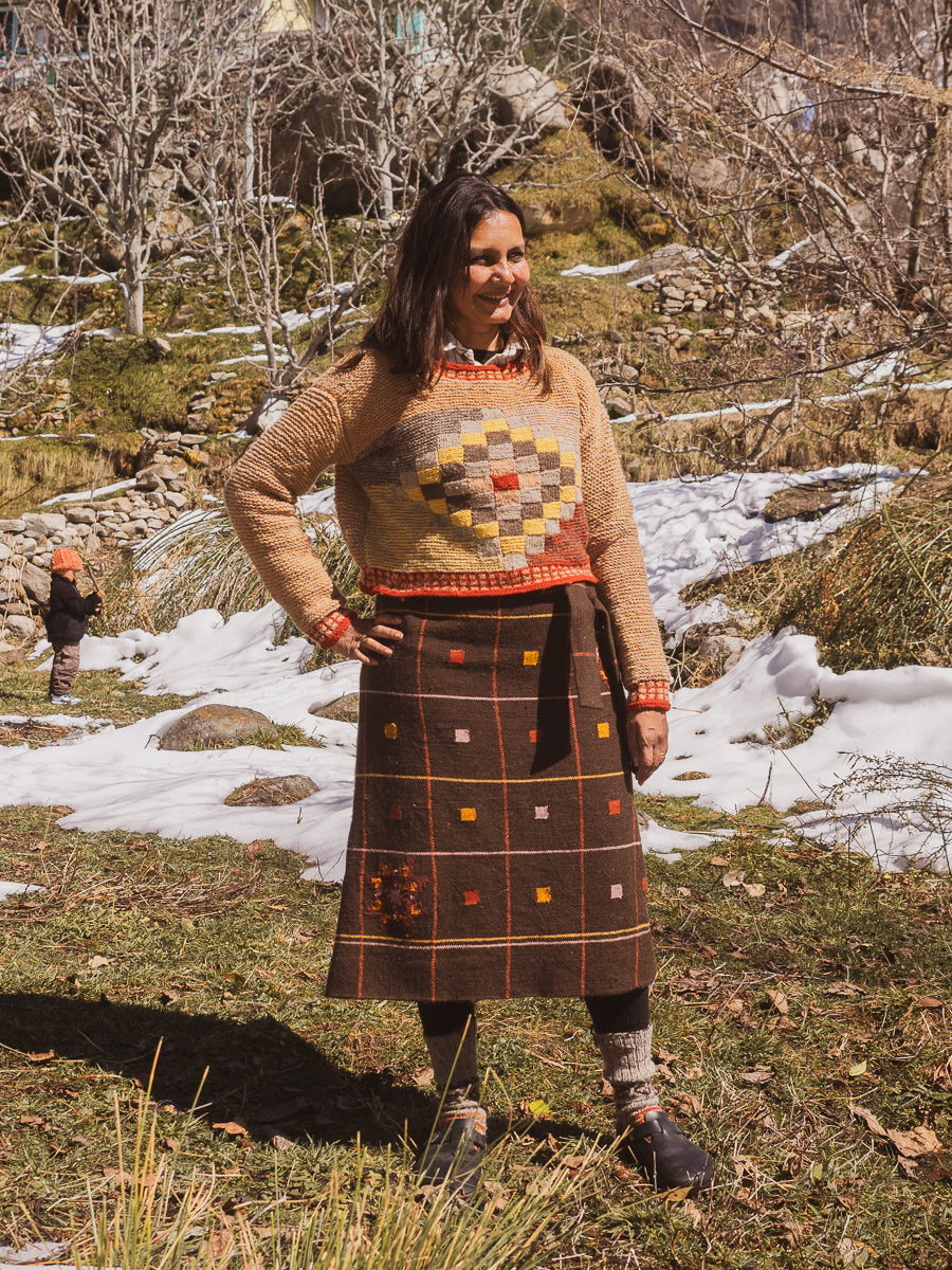 In collaboration with the Gaddis to procure their indigenous wool, this pastoral tribe of the Himalayas known for their unique shepherding practices. They traverse the high Himalayan ranges annually, covering thousands of kilometers with their sheep to migrate to traditional pastures. Each Kullvi Whims piece embodies the essence of the mountains as every piece undergoes a natural dyeing process with colours derived from local native flora. Every knitted or woven piece serves not only as a beautiful creation but also narrates the stories of its maker and the journeys undertaken across the breathtaking Himalayan landscape.