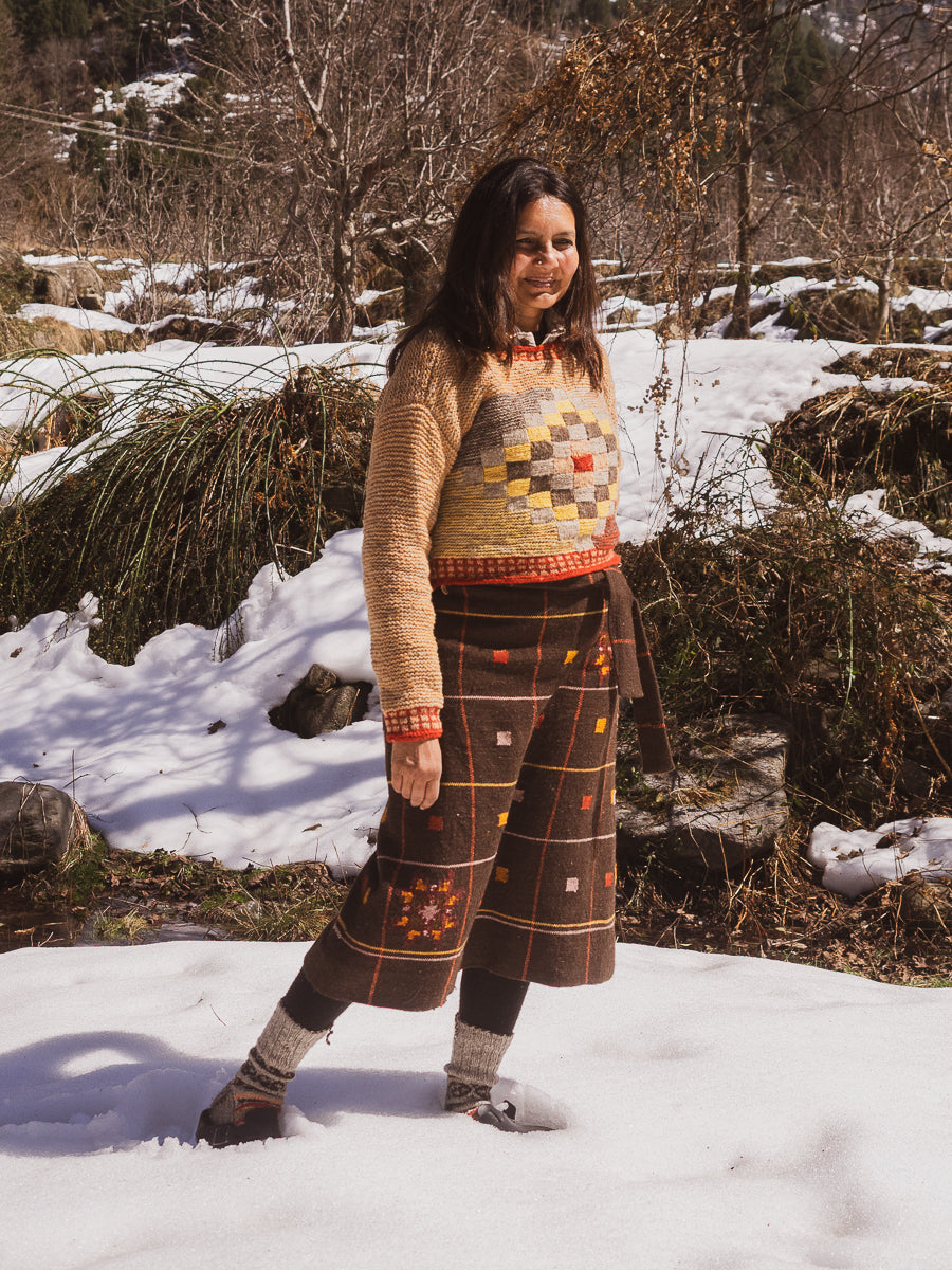 In collaboration with the Gaddis to procure their indigenous wool, this pastoral tribe of the Himalayas known for their unique shepherding practices. They traverse the high Himalayan ranges annually, covering thousands of kilometers with their sheep to migrate to traditional pastures. Each Kullvi Whims piece embodies the essence of the mountains as every piece undergoes a natural dyeing process with colours derived from local native flora. Every knitted or woven piece serves not only as a beautiful creation but also narrates the stories of its maker and the journeys undertaken across the breathtaking Himalayan landscape.