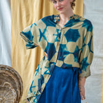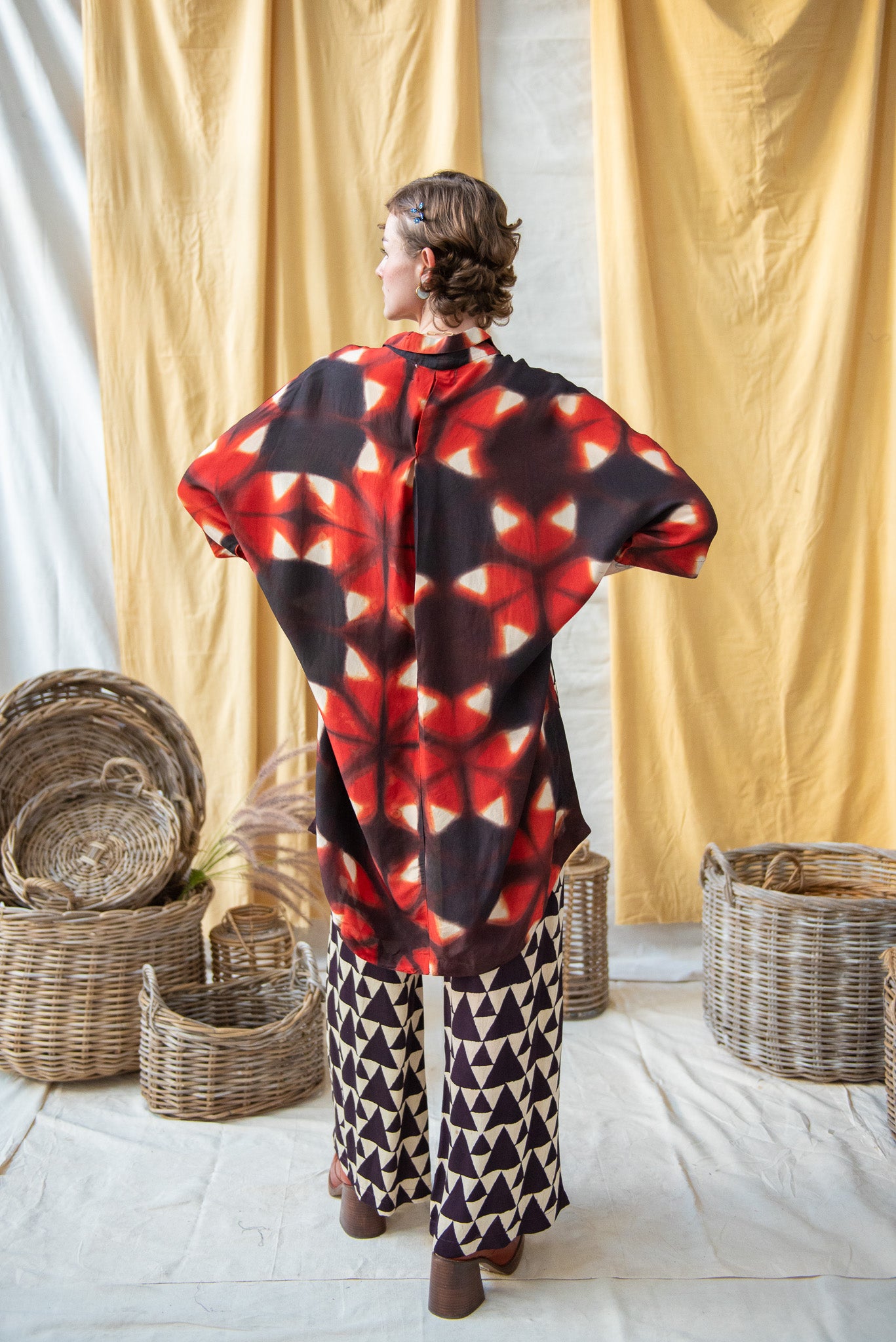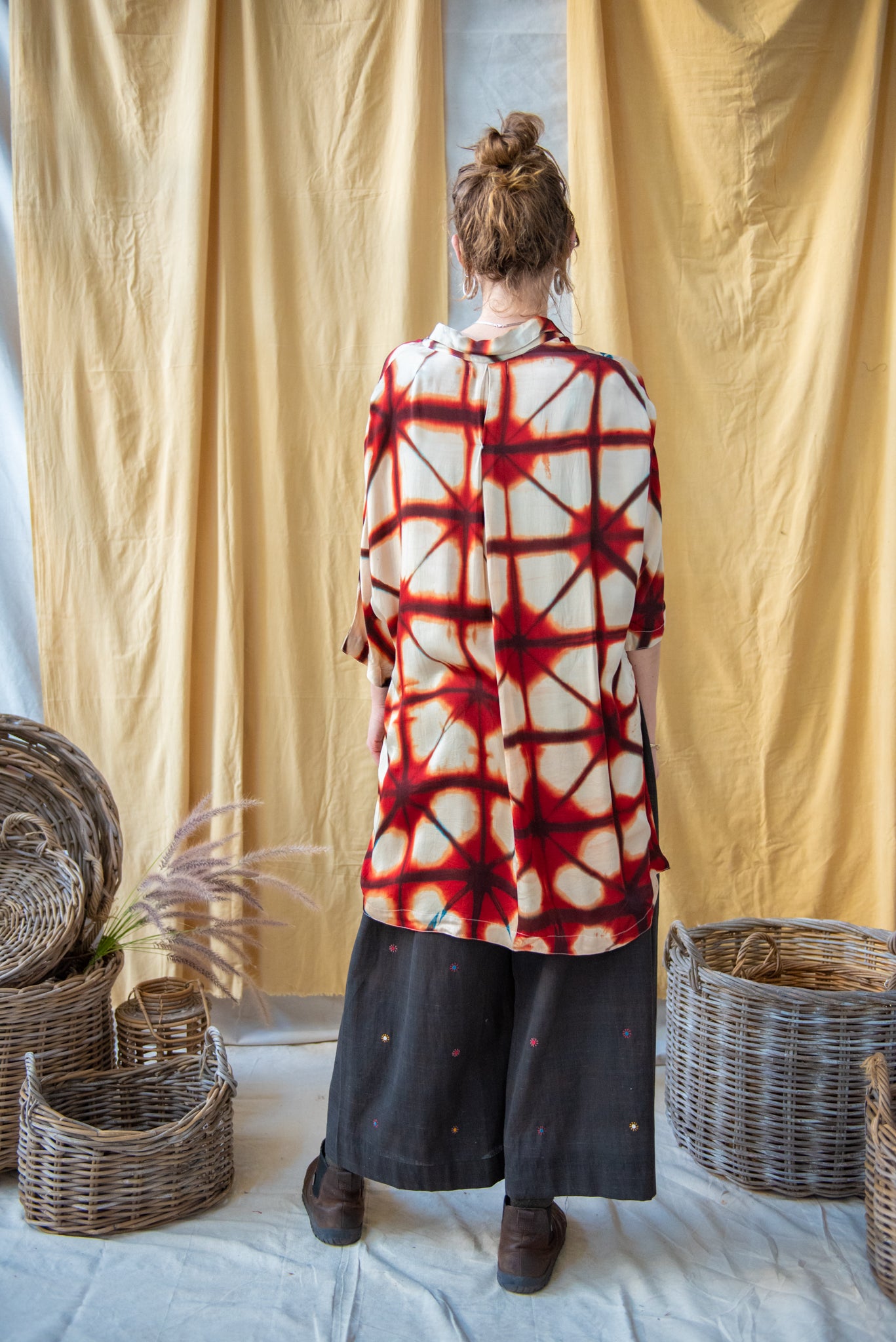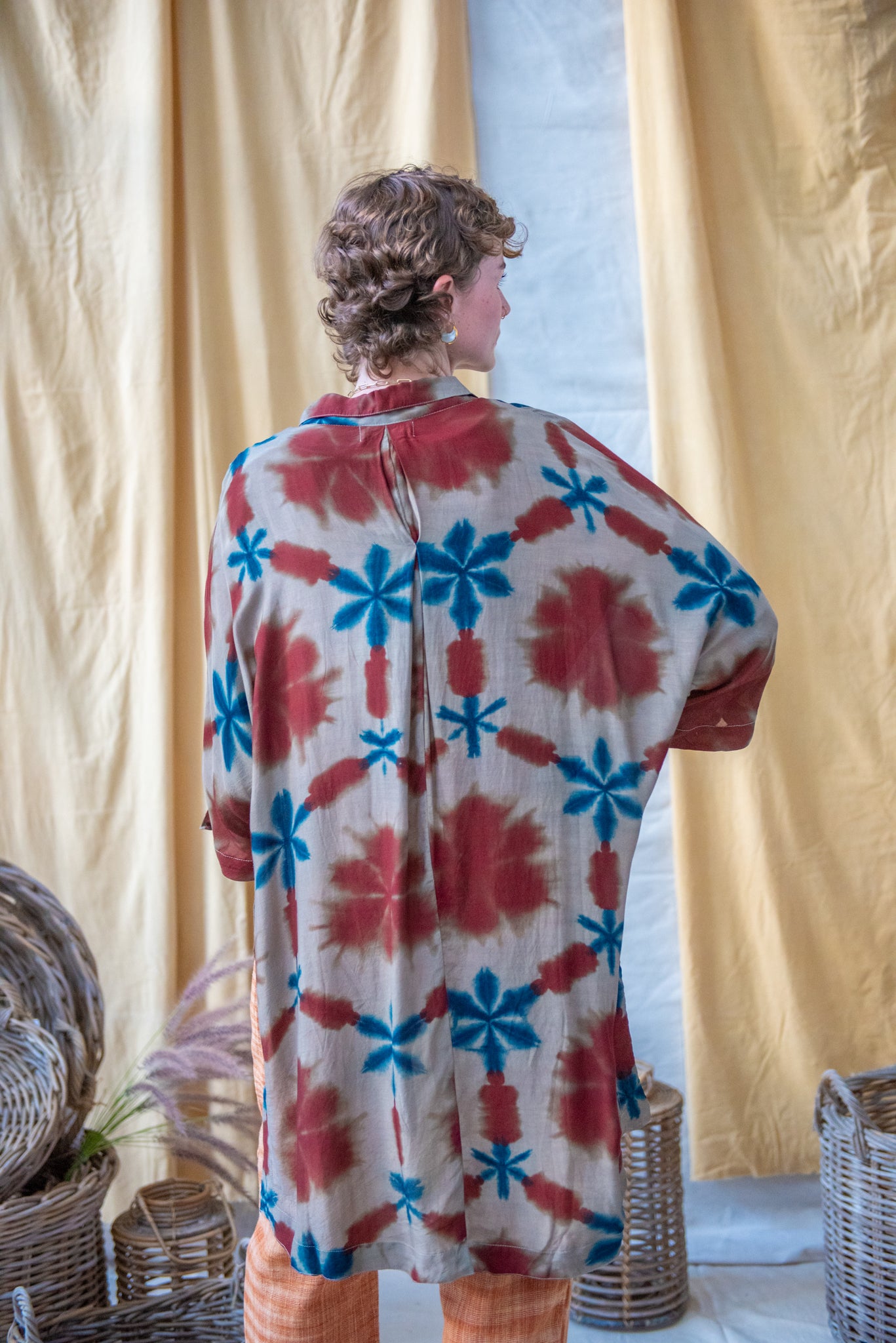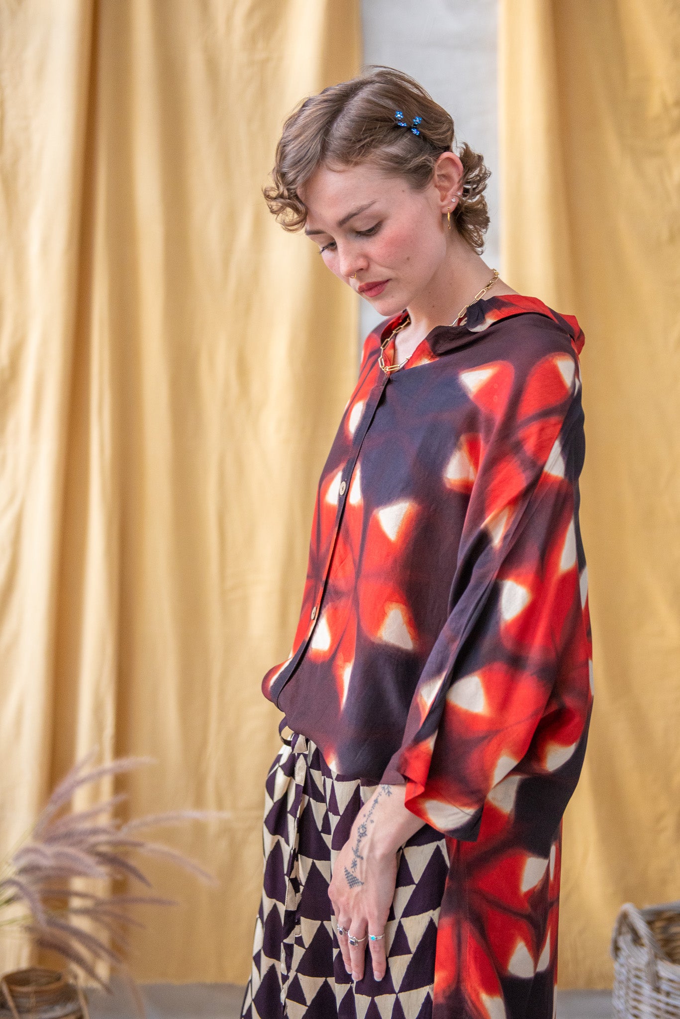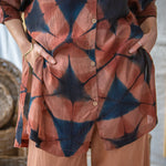 Introducing our Ajrakh Clamp Dyed Modal Silk Oversized Shirt, an exquisite addition to our Silk Velvet Ajrakh Collection, thoughtfully crafted by master artisan Suffyian Kathri in Kutch, India. Designed with a  relaxed silhouette and an oversized fit, this shirt ensures all-day comfort while maintaining a modern, stylish appearance that works for any occasion.