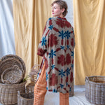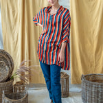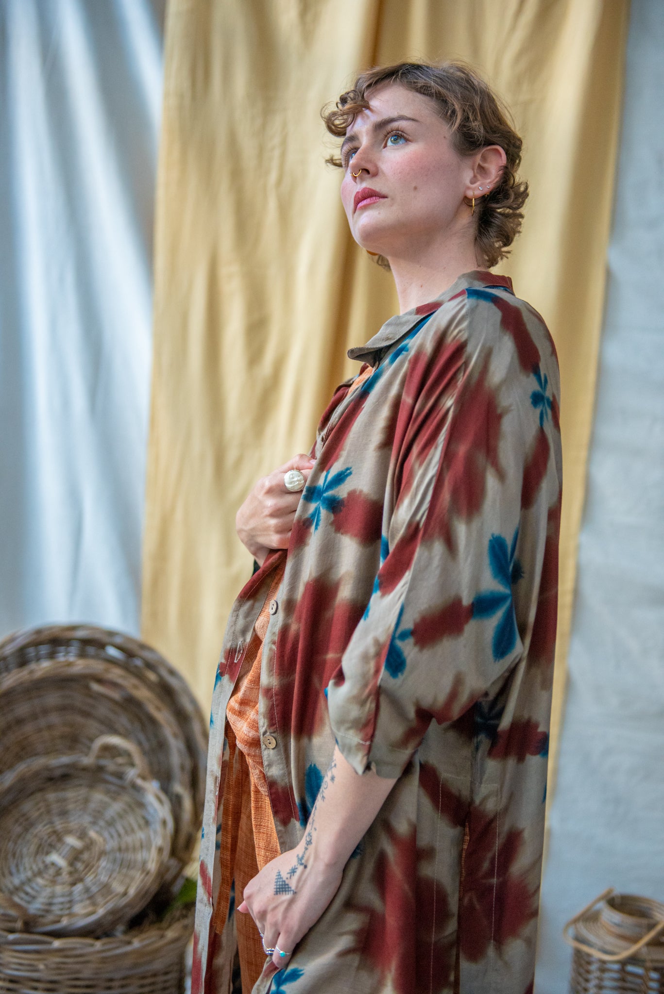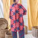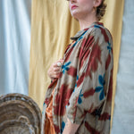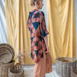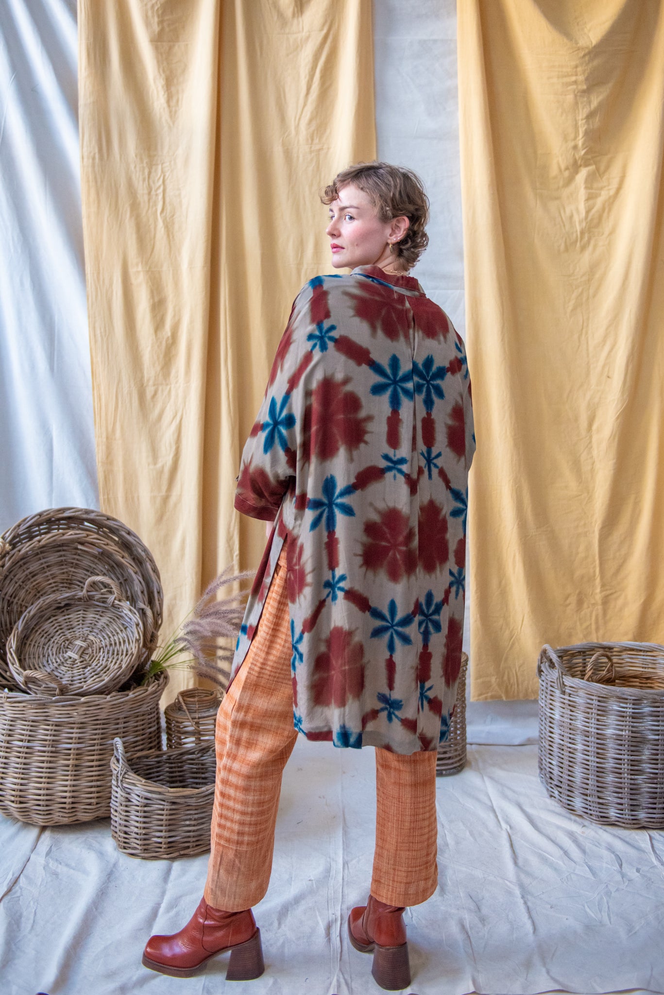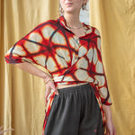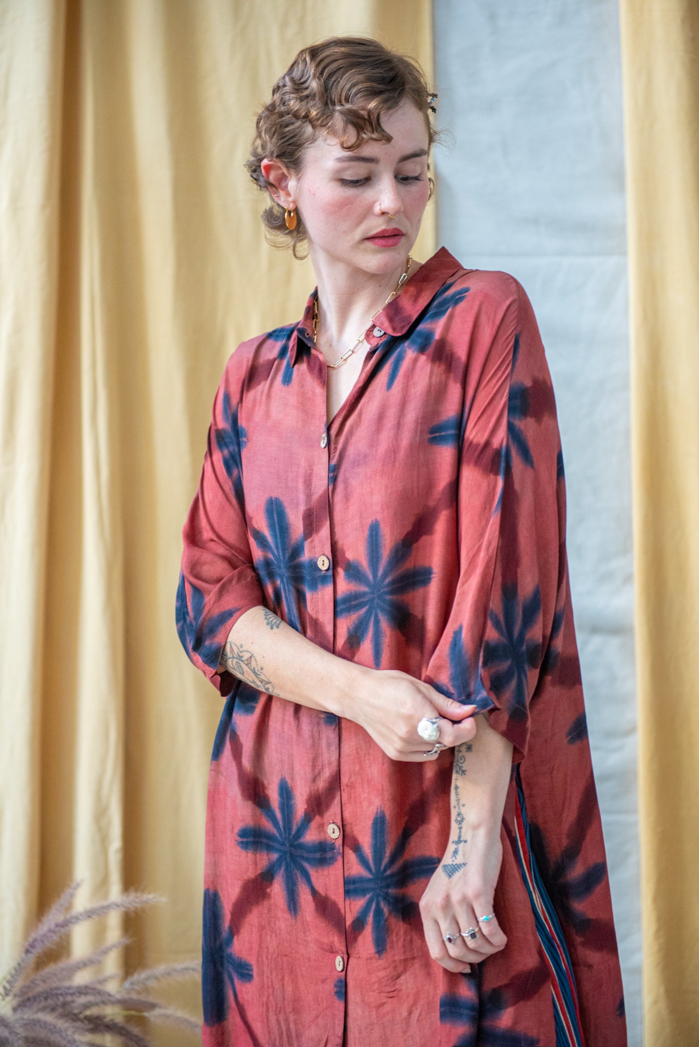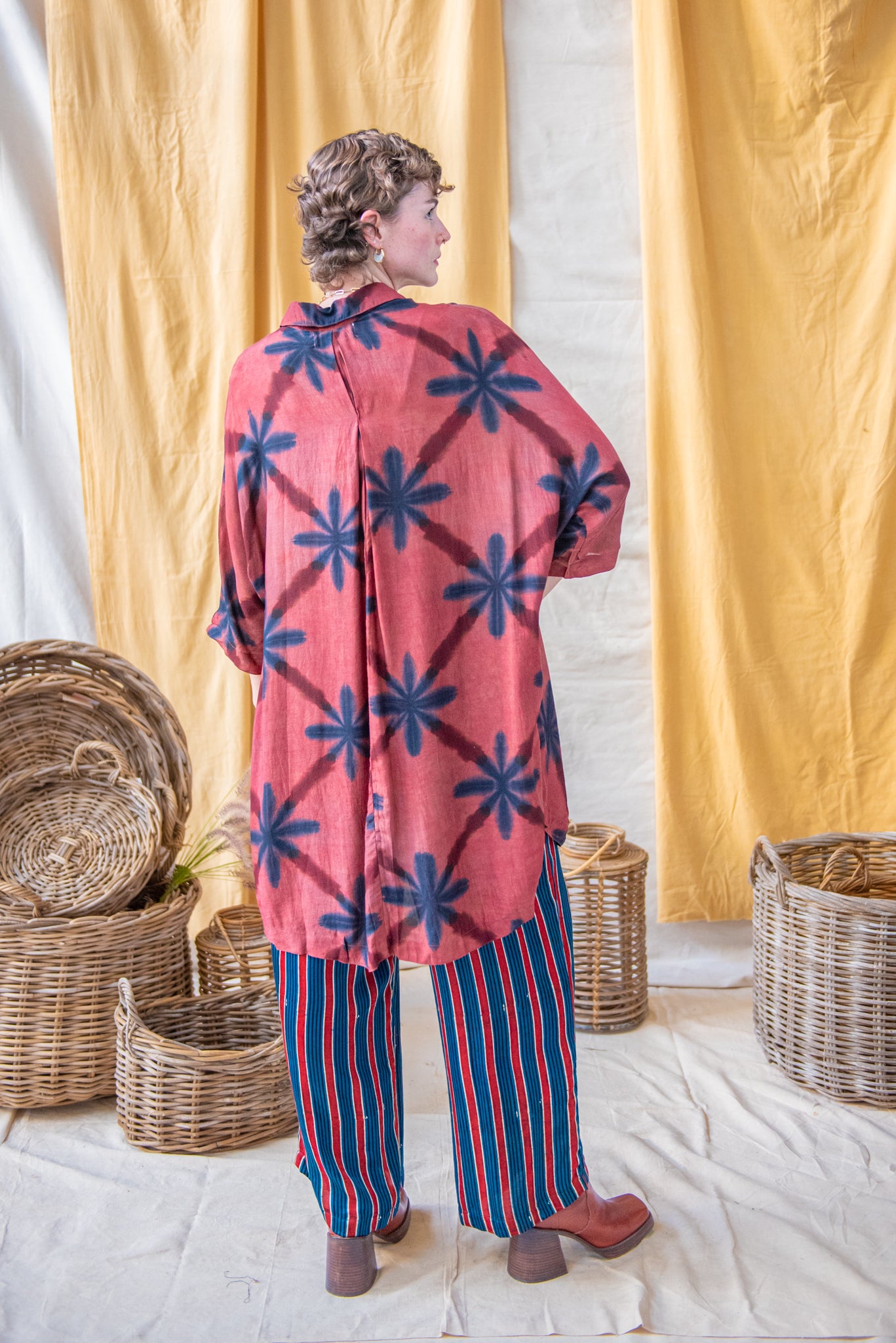 Introducing our Ajrakh Clamp Dyed Modal Silk Oversized Shirt, an exquisite addition to our Silk Velvet Ajrakh Collection, thoughtfully crafted by master artisan Suffyian Kathri in Kutch, India. Designed with a  relaxed silhouette and an oversized fit, this shirt ensures all-day comfort while maintaining a modern, stylish appearance that works for any occasion.