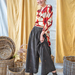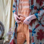 After washing, avoid wringing it out to preserve the delicate textile quality and lay it flat or hang to air dry in a shaded area to prevent fading and protect the fabric from the harsh effects of direct sunlight. Only iron on low heat.