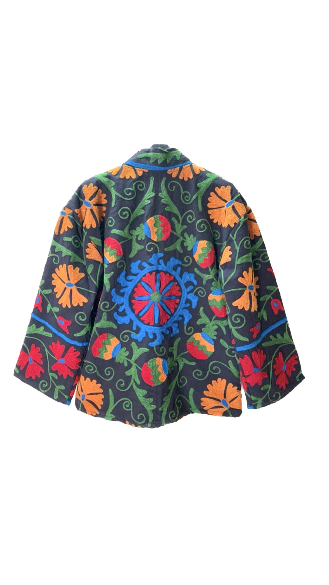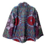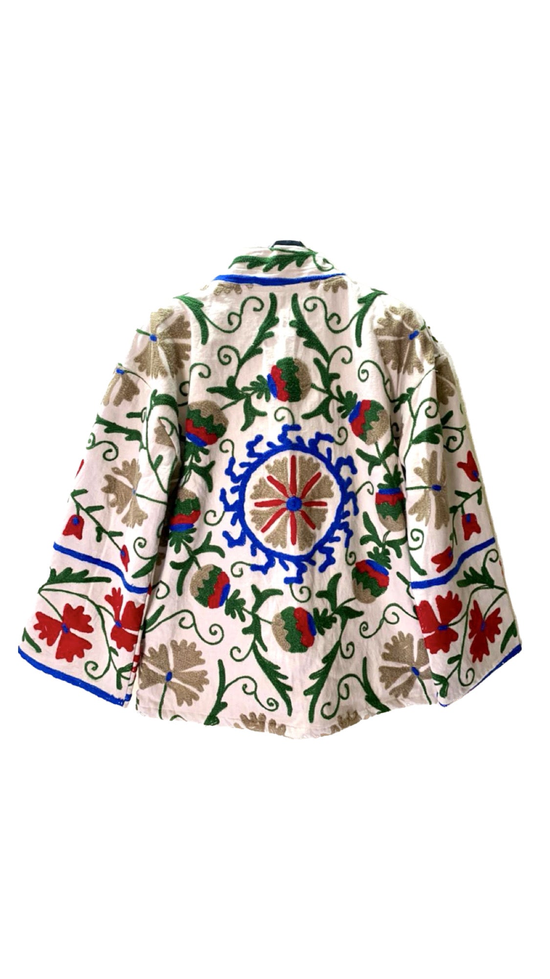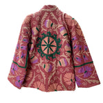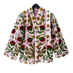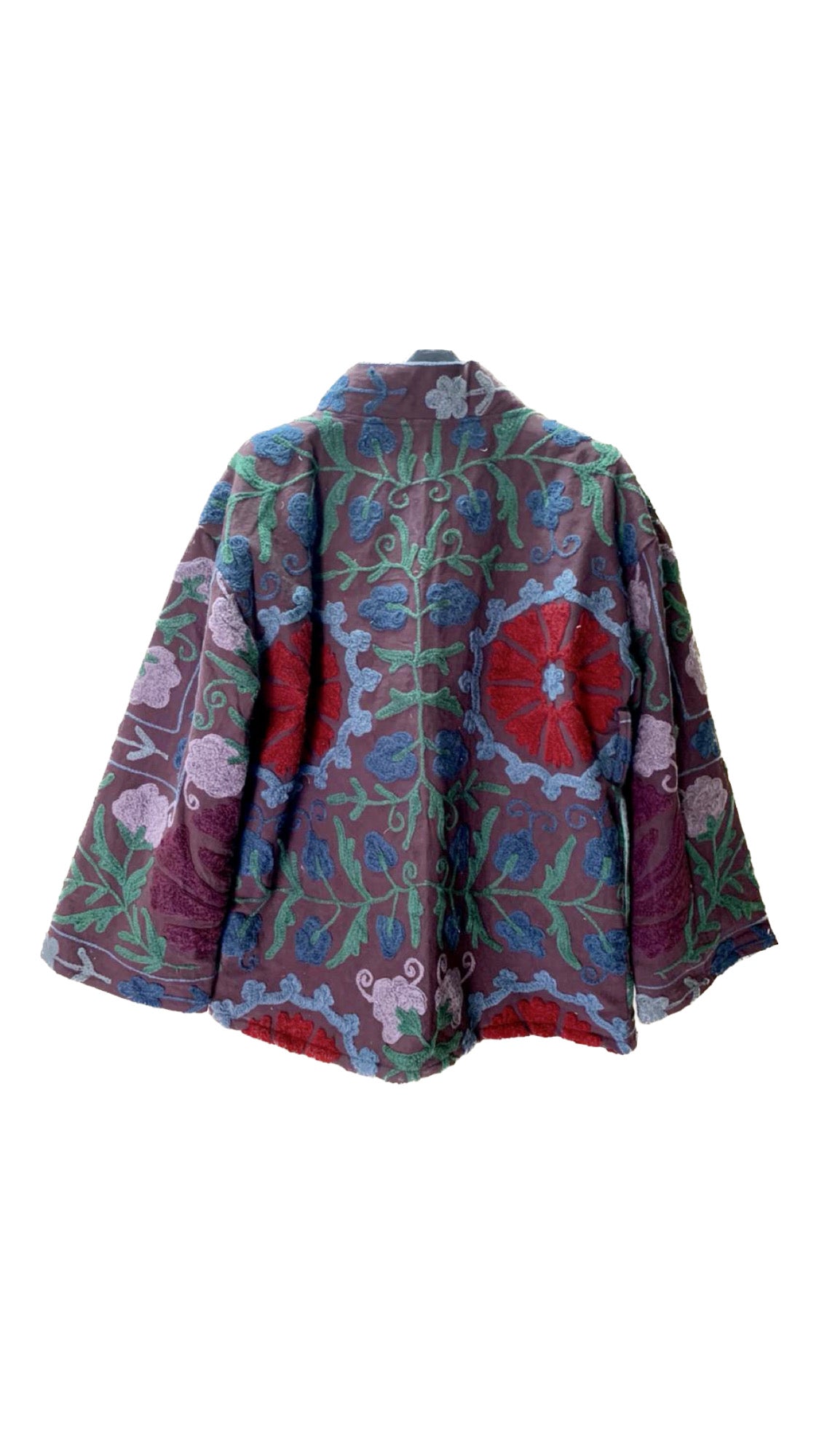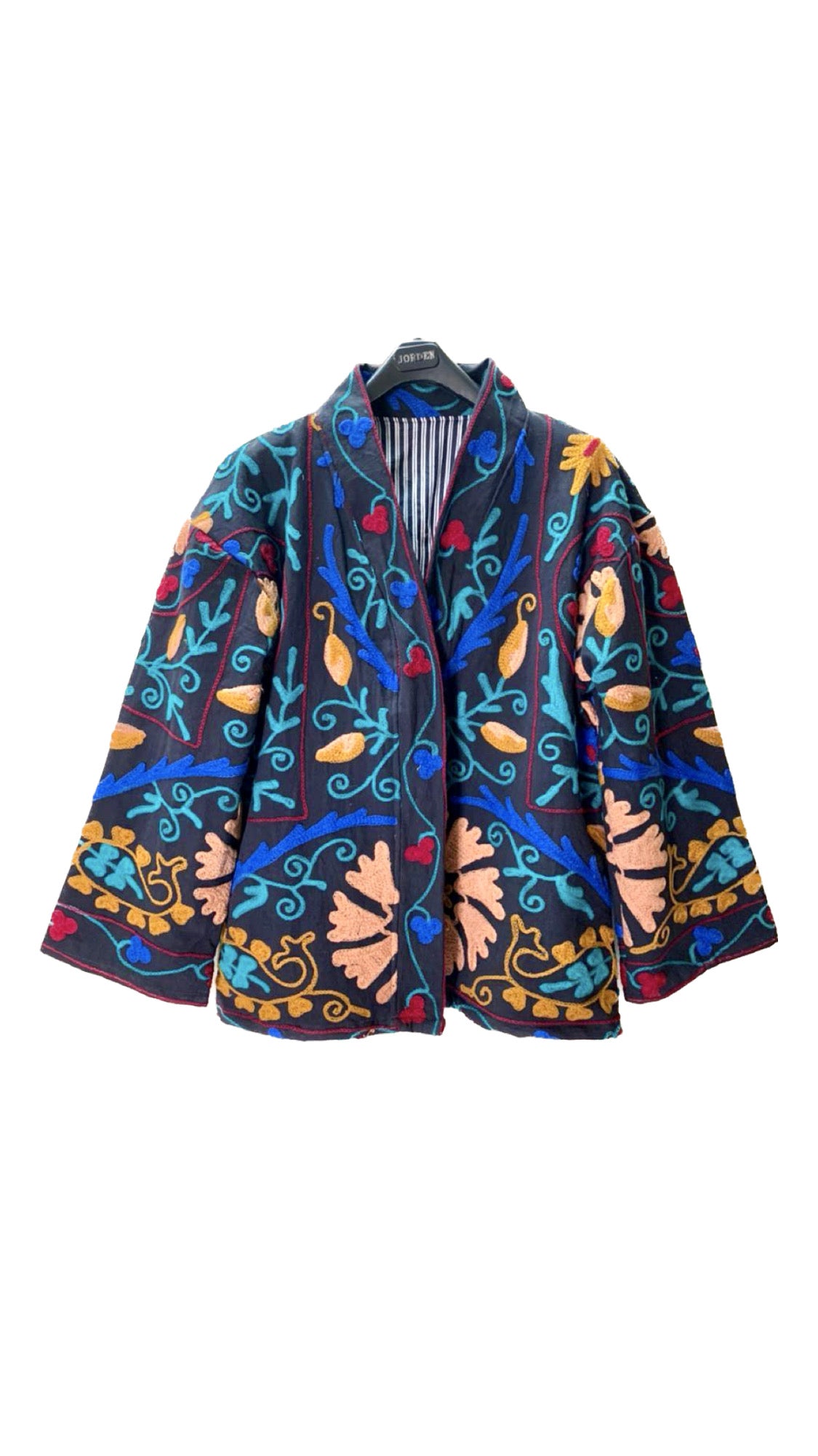 These upcycled Suzani Coats are a dream come true for any textile lover. The Machine Embroidered Jacket, pictured, falls just below the hips depending on how tall you are. It features beautiful craftsmanship - a belt to tie at the waist or leave loose at the back, pockets of course for practicality, and beautiful cuffs on the sleeves to roll up or keep them down for the oversized campsite look. Fully lined, each jacket’s maker has thoughtfully used the Suzani to feature its original border on the front lapel of the garment, and its original centre as a feature piece placement of the back of the Jacket.