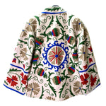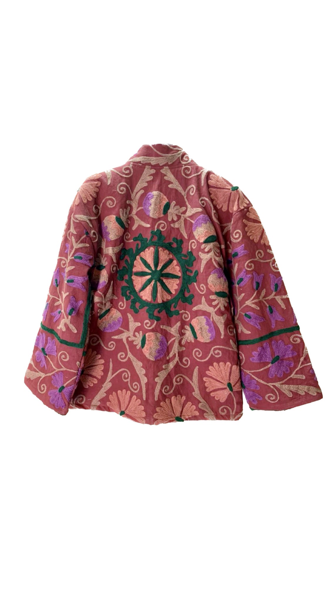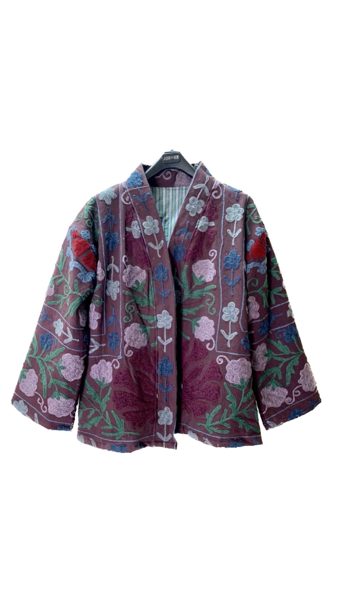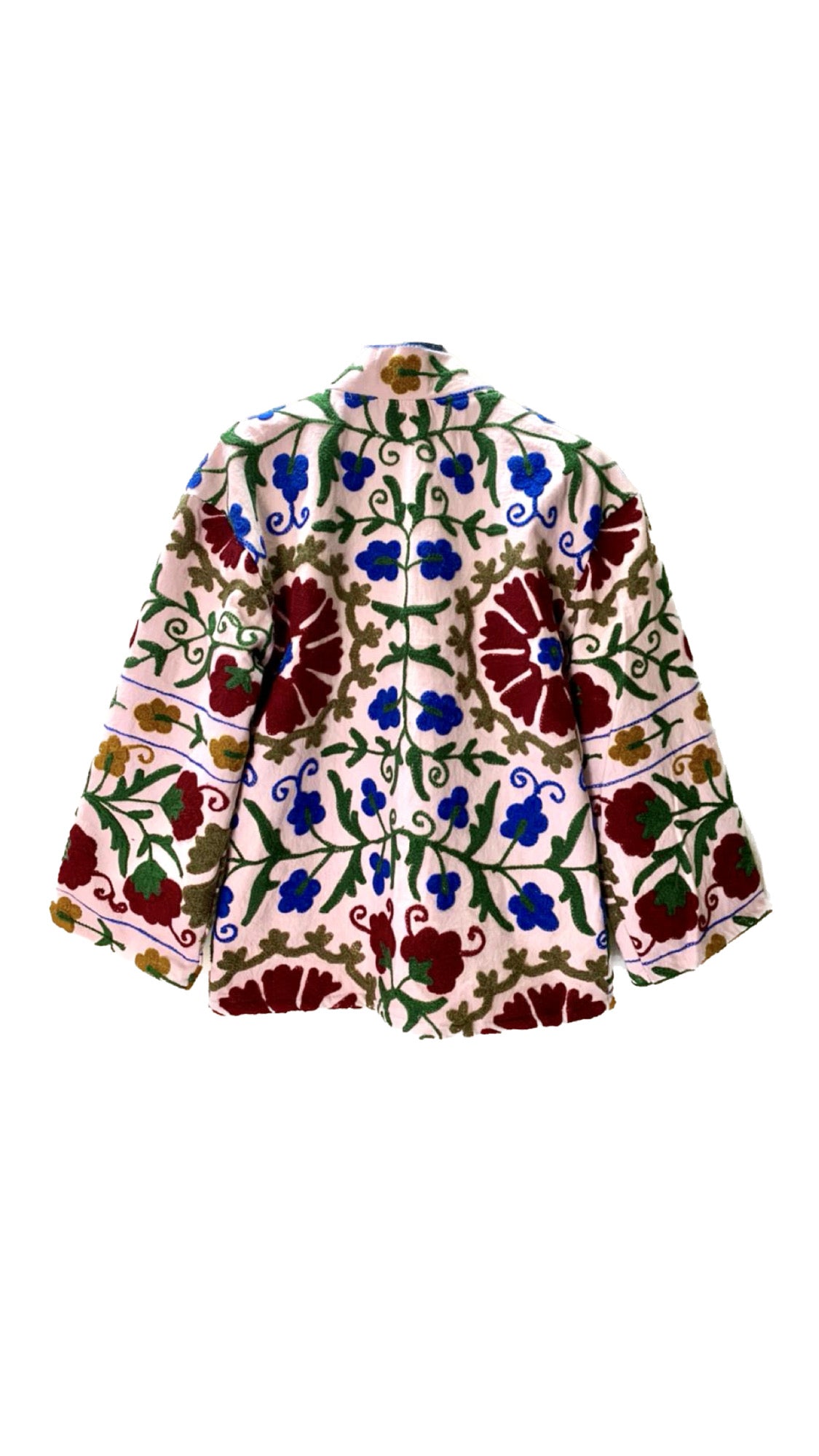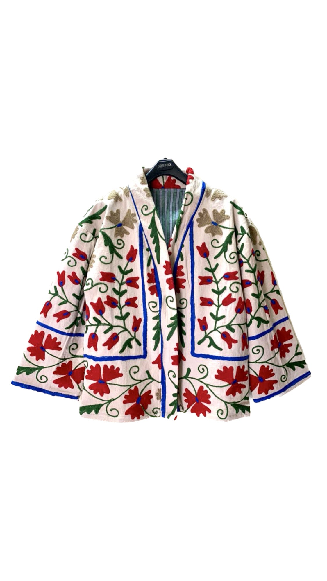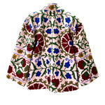 These upcycled Suzani Coats are a dream come true for any textile lover. The Machine Embroidered Jacket, pictured, falls just below the hips depending on how tall you are. It features beautiful craftsmanship - a belt to tie at the waist or leave loose at the back, pockets of course for practicality, and beautiful cuffs on the sleeves to roll up or keep them down for the oversized campsite look. Fully lined, each jacket’s maker has thoughtfully used the Suzani to feature its original border on the front lapel of the garment, and its original centre as a feature piece placement of the back of the Jacket.