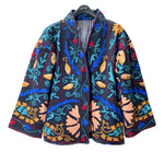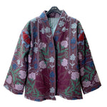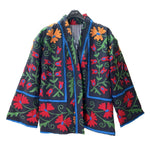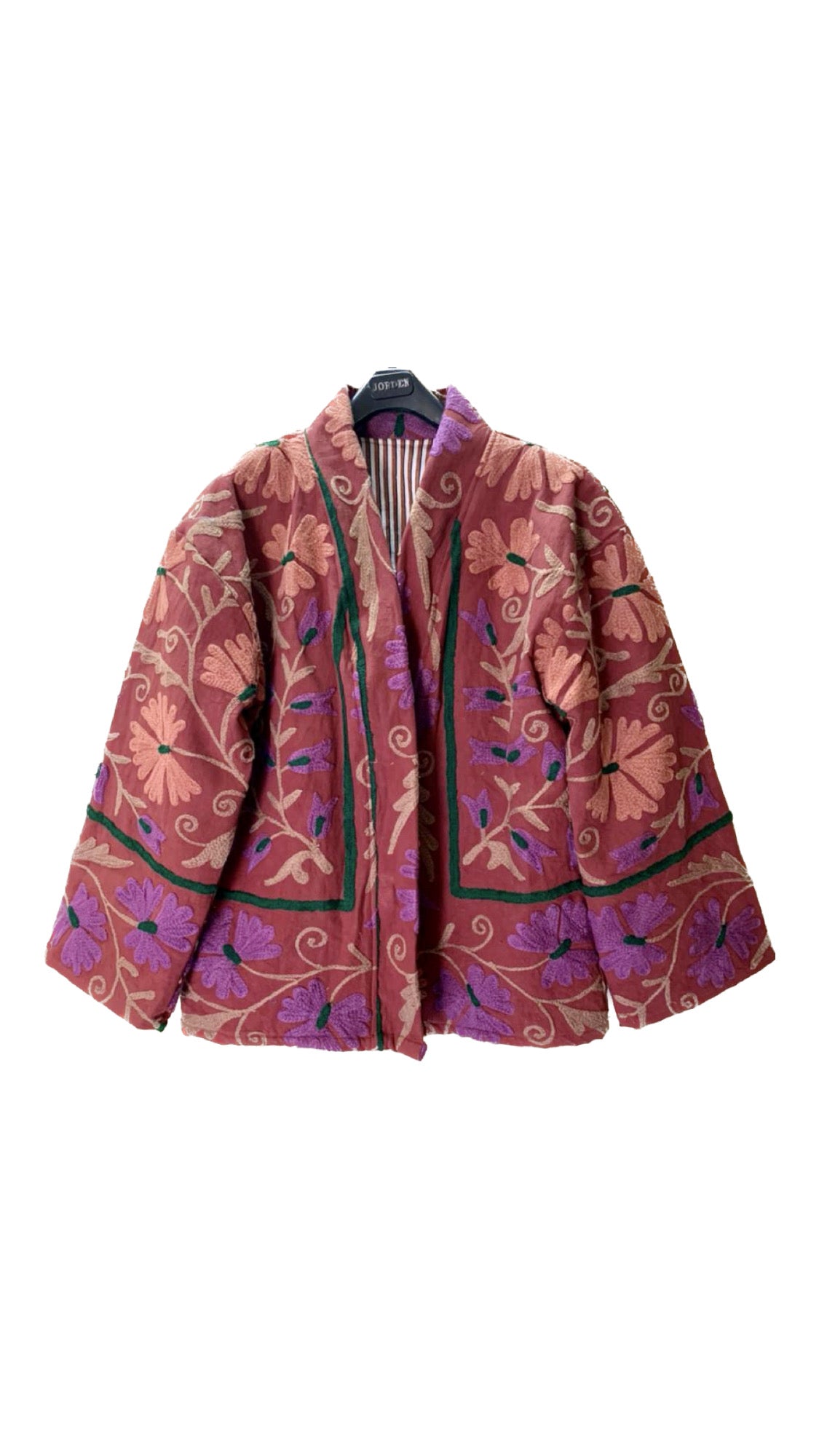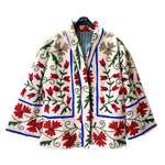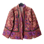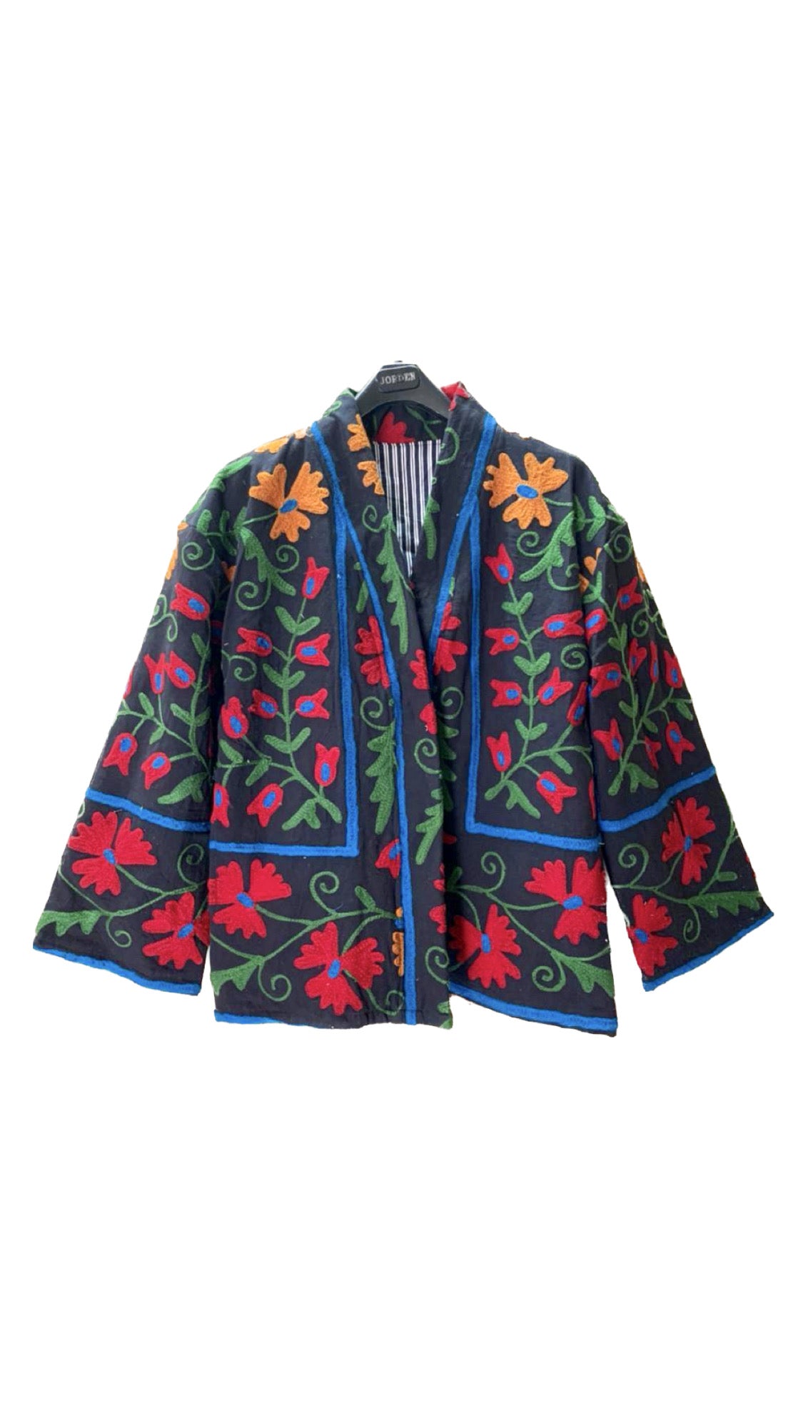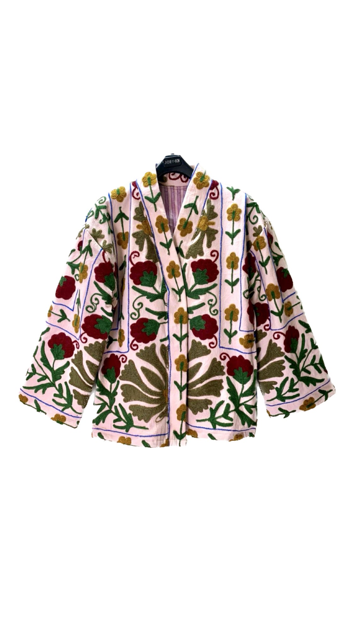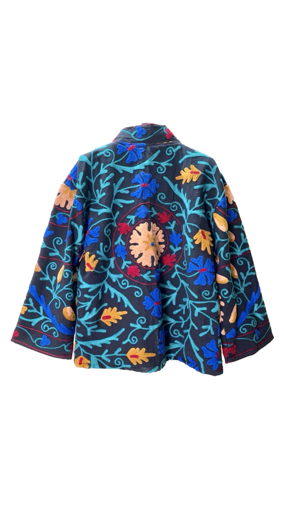 These upcycled Suzani Coats are a dream come true for any textile lover. The Machine Embroidered Jacket, pictured, falls just below the hips depending on how tall you are. It features beautiful craftsmanship - a belt to tie at the waist or leave loose at the back, pockets of course for practicality, and beautiful cuffs on the sleeves to roll up or keep them down for the oversized campsite look. Fully lined, each jacket’s maker has thoughtfully used the Suzani to feature its original border on the front lapel of the garment, and its original centre as a feature piece placement of the back of the Jacket.