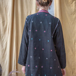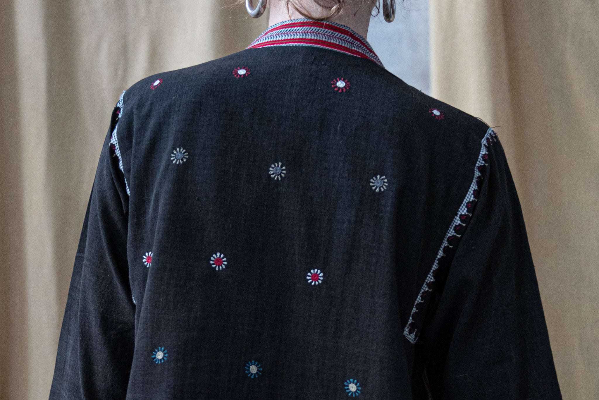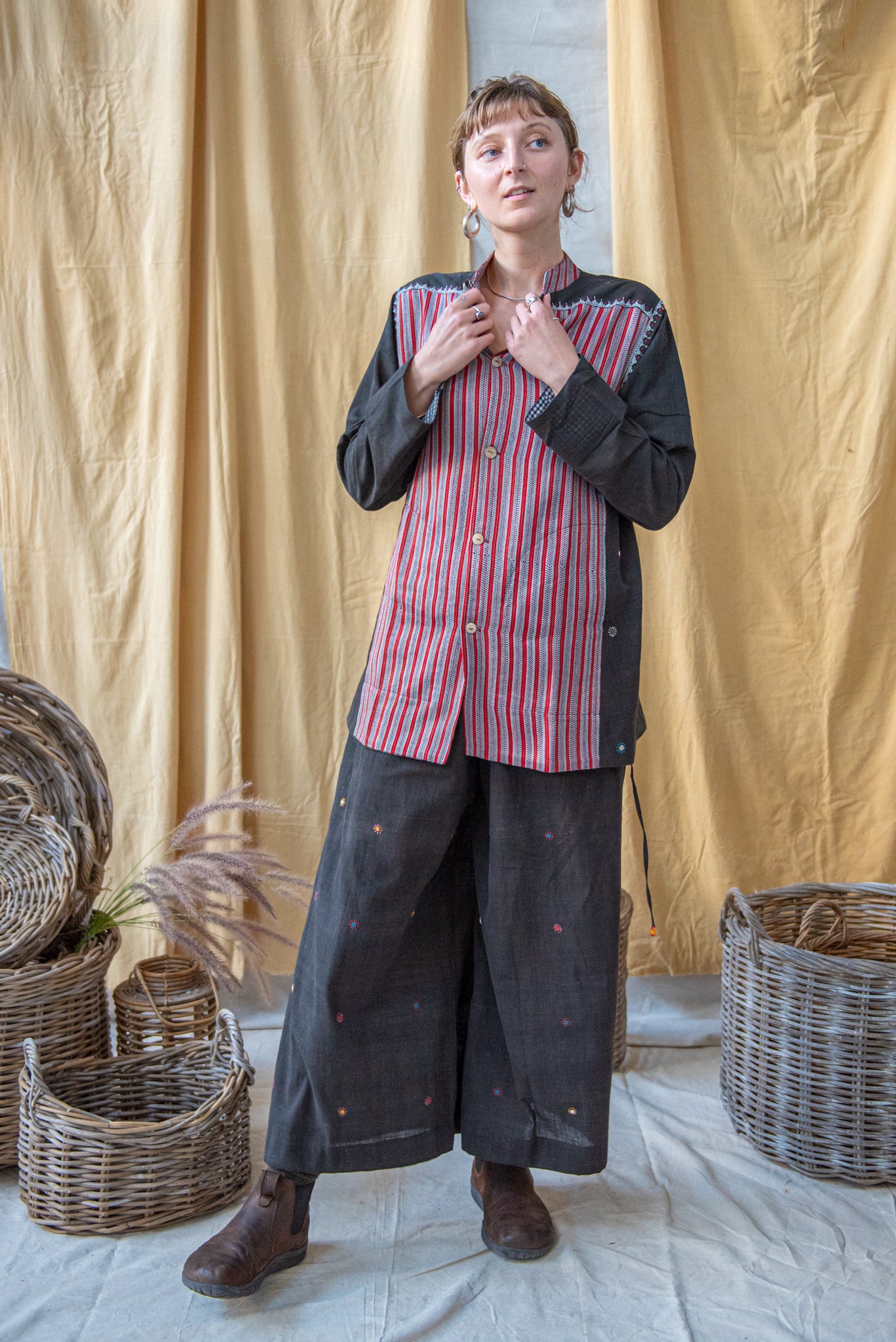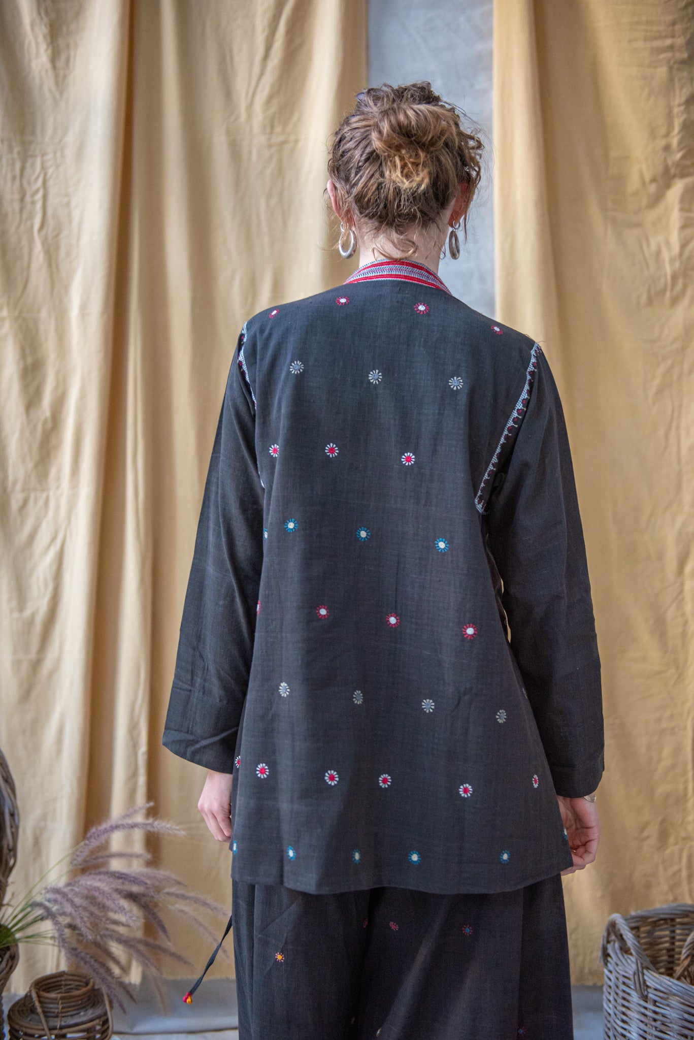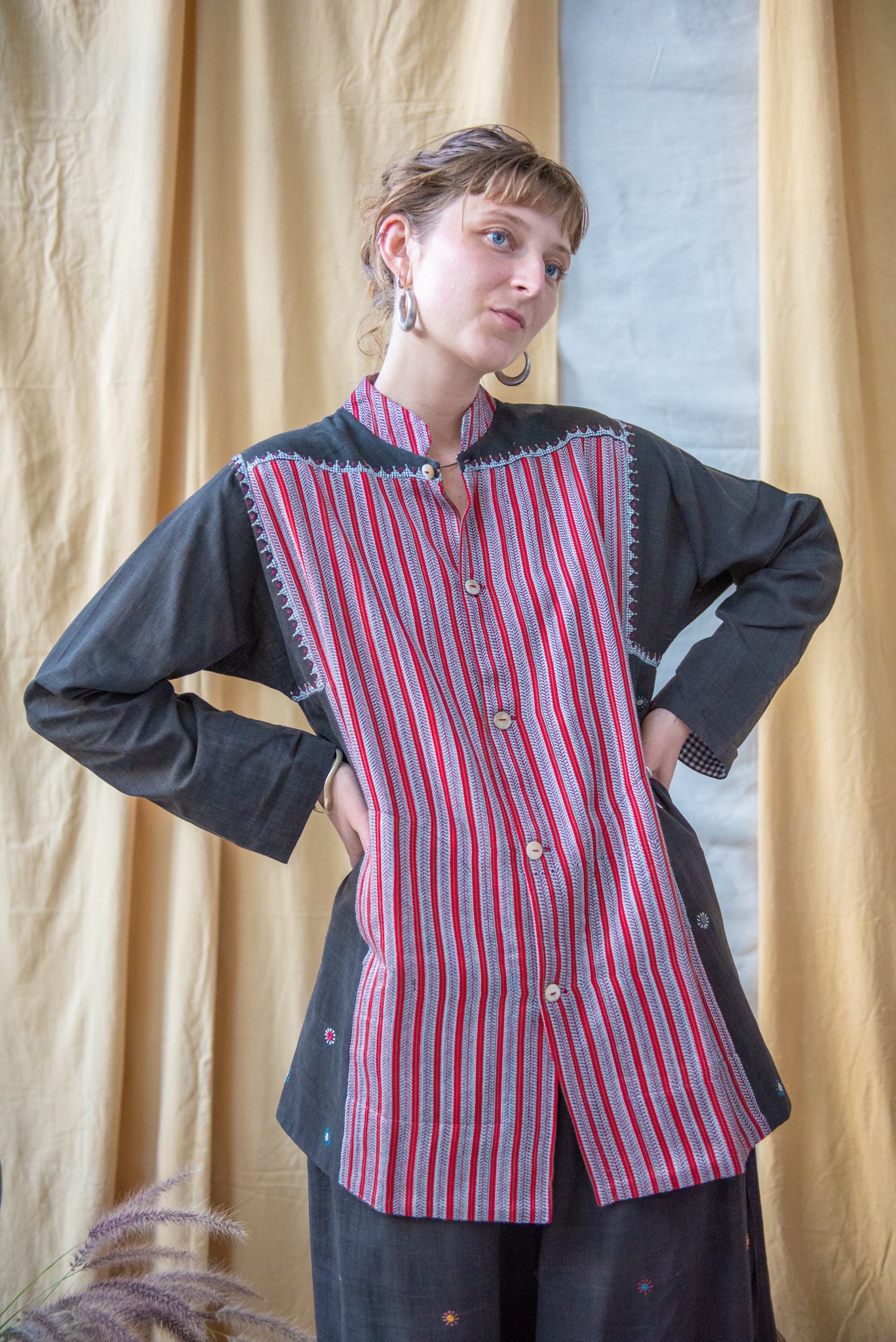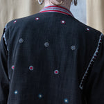Elevate your outerwear collection with our Collared Jacket, a stunning piece from the Porgai Artisan Collection. This jacket beautifully marries traditional dyeing techniques with luxurious mashru silk accents. Featuring stunning mirror embroidery and thoughtful tailoring with contemporary silhouette, this jacket is perfect for the modern individual who values style and sustainability.