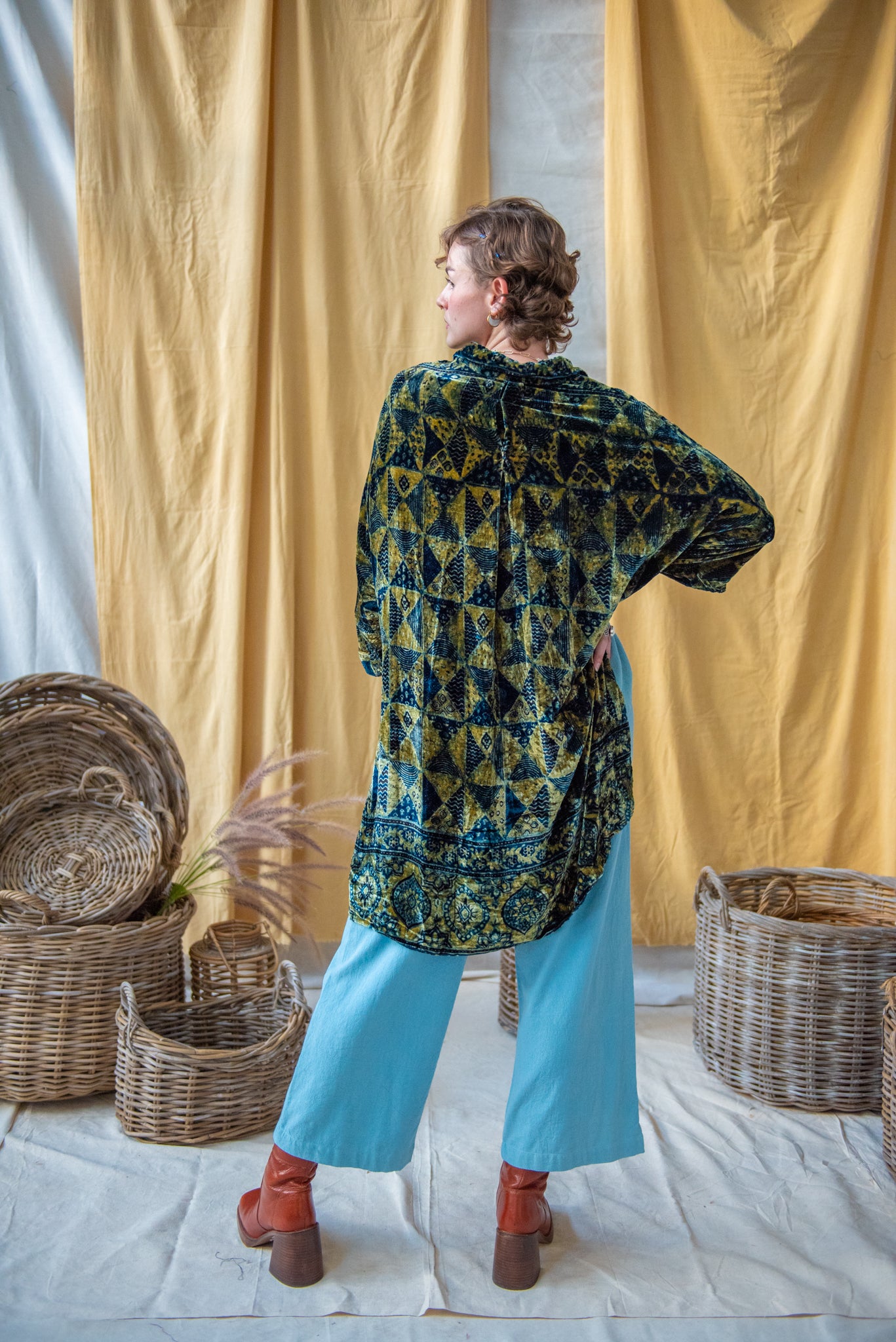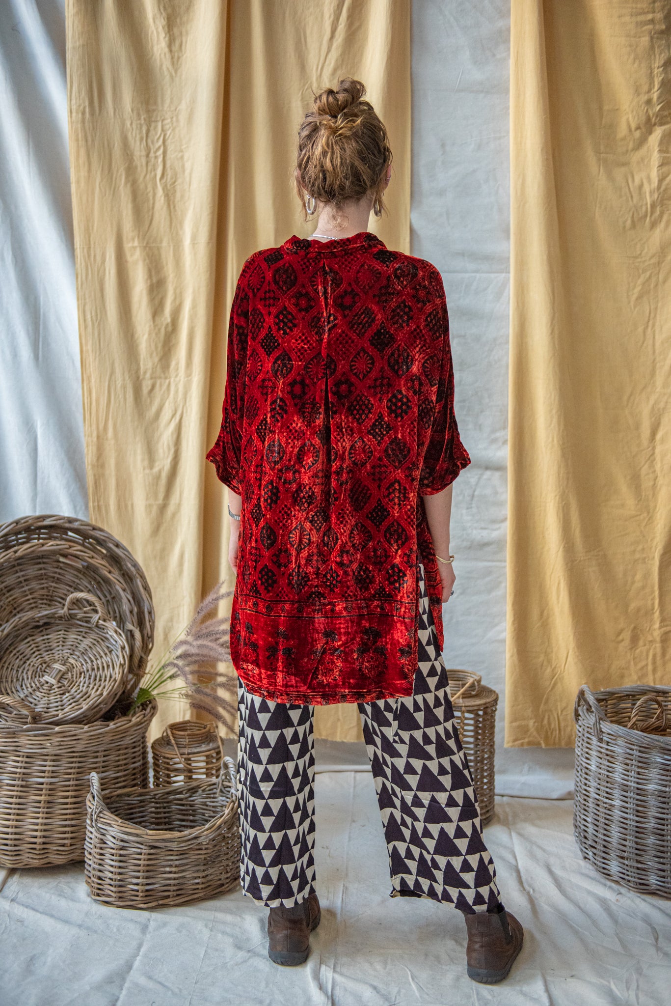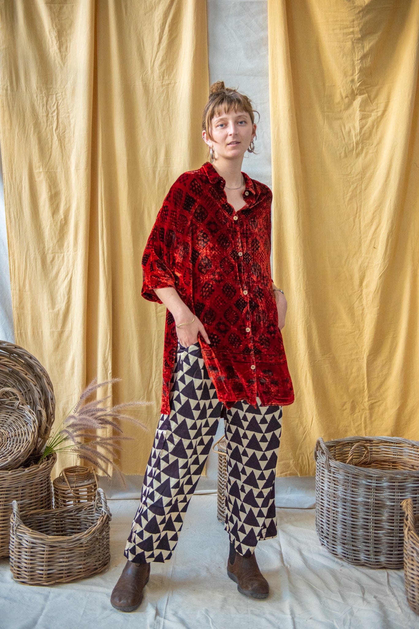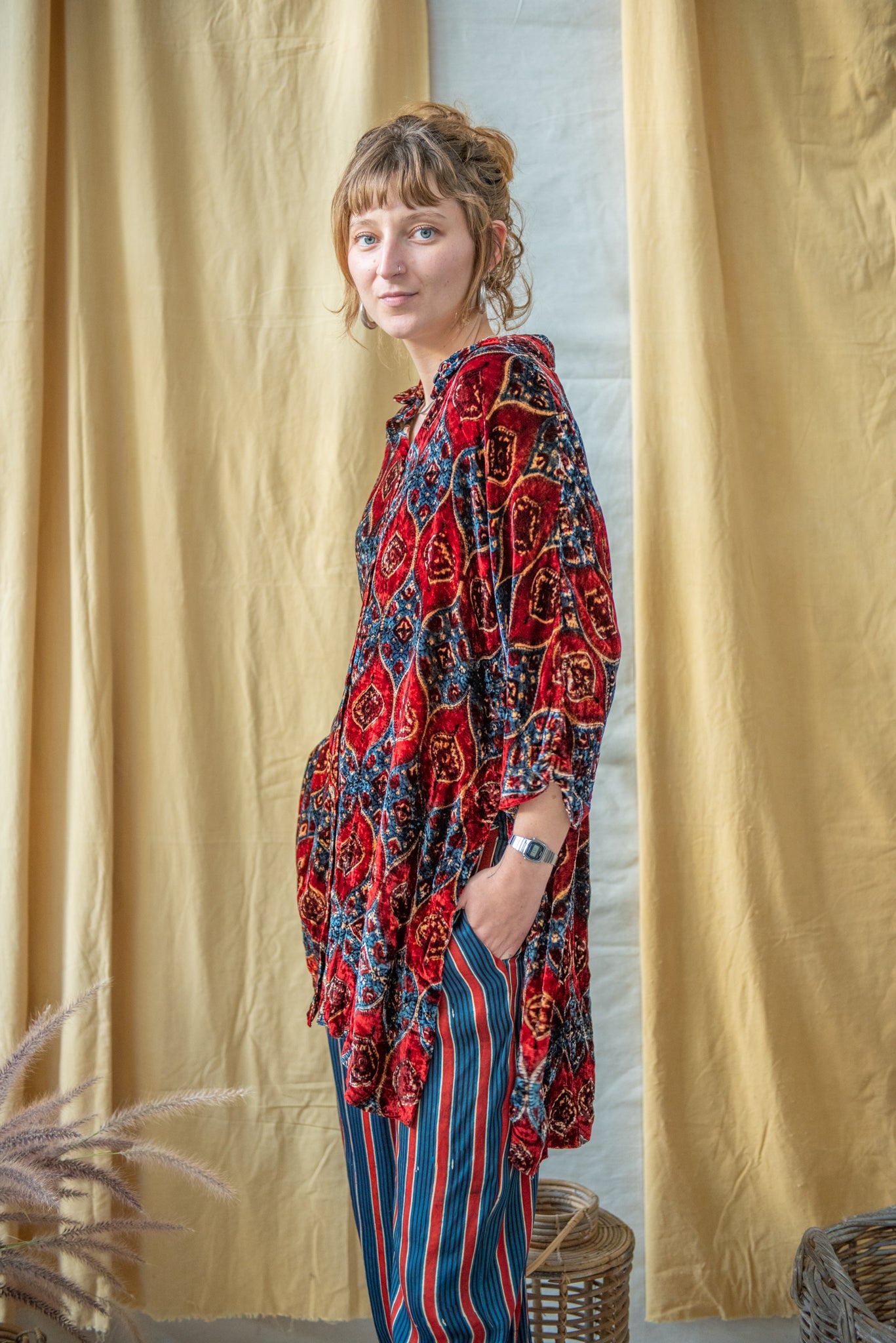 Indulge in the luxurious comfort of our Silk Velvet Oversized Shirt, a standout piece from our Ajrakh Collection, crafted by master printer Suffyian Khatri. Adaptable to any occasion, this oversized shirt features a relaxed silhouette that provides comfort and freedom of movement, perfect for layering or wearing on its own.