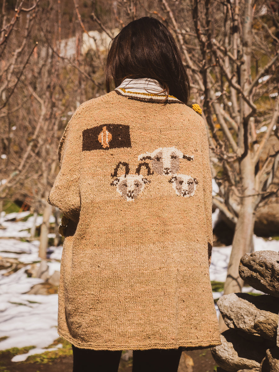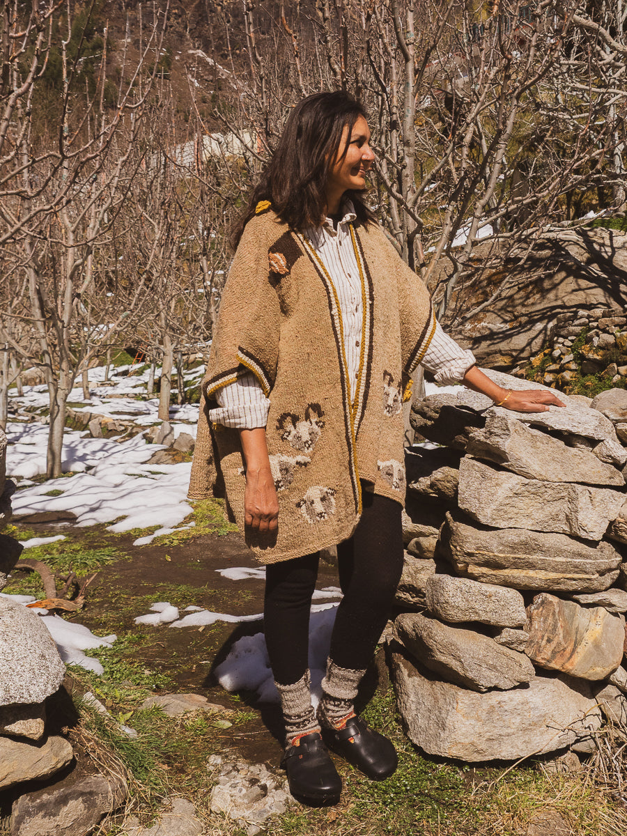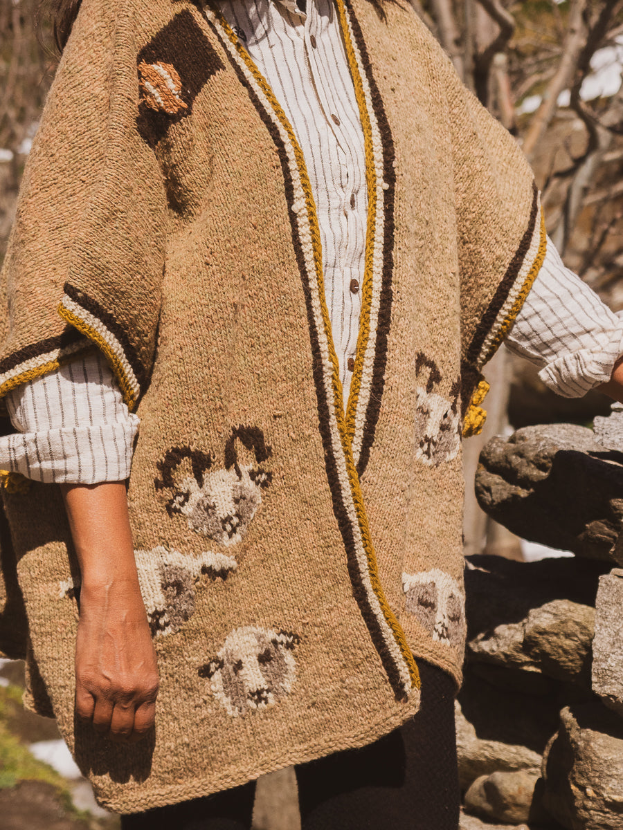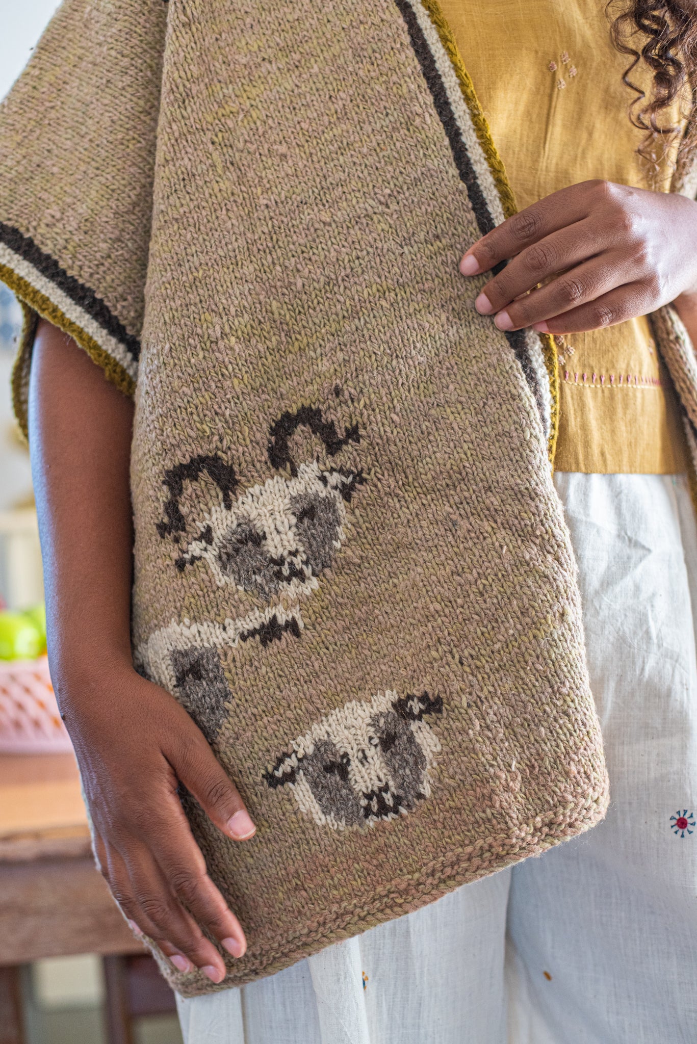 The Sheep's In The Meadows Overlay, this playful storytelling overlay captures the charm of Himalayan flocks grazing in serene meadows, with unexpected marigolds peeking out and walnuts dotting the landscape. Handcrafted with care, its versatile fit and open design make it perfect for layering.