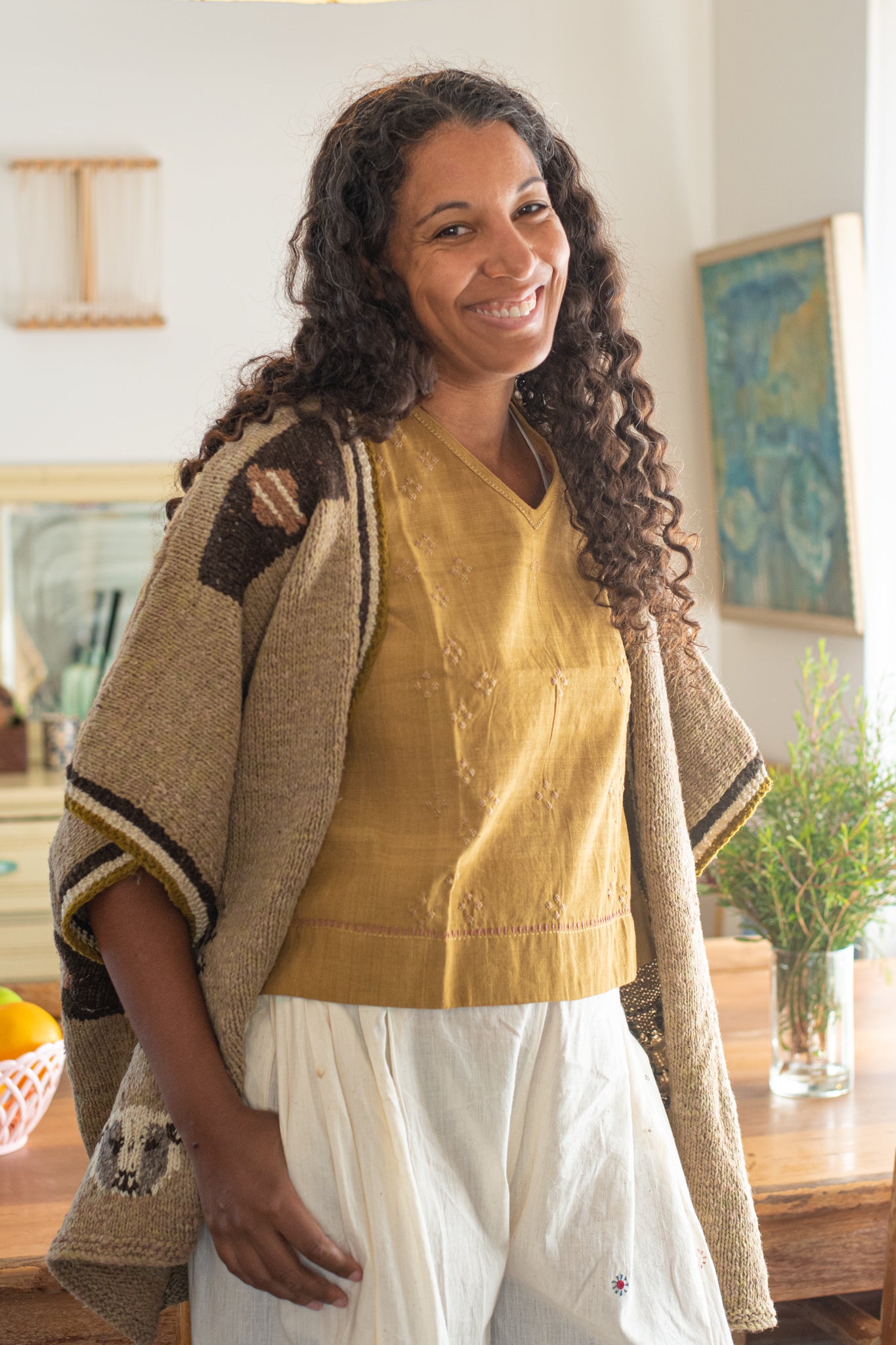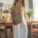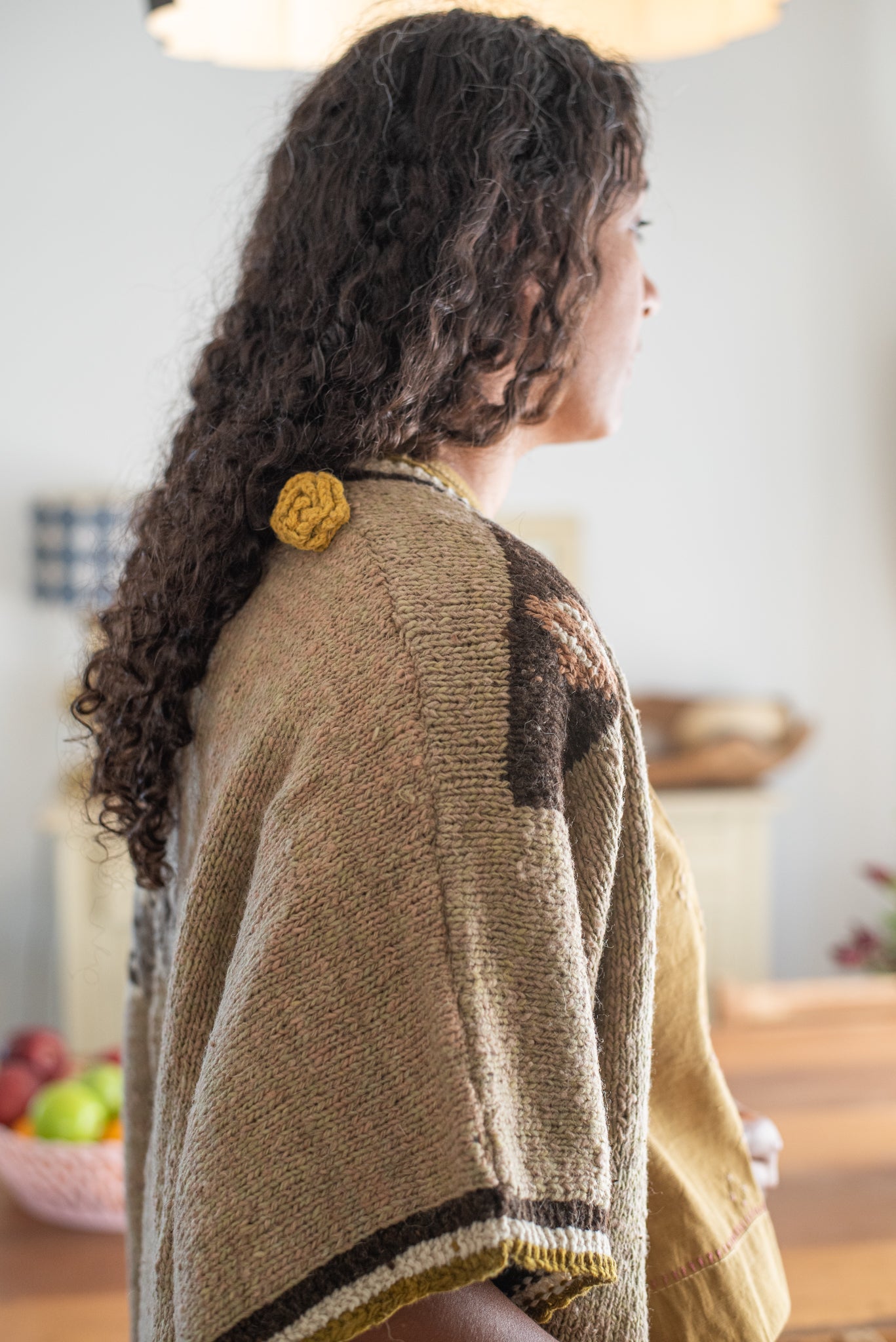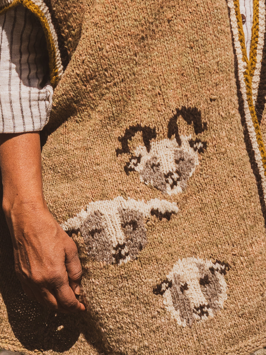 The Sheep's In The Meadows Overlay, this playful storytelling overlay captures the charm of Himalayan flocks grazing in serene meadows, with unexpected marigolds peeking out and walnuts dotting the landscape. Handcrafted with care, its versatile fit and open design make it perfect for layering.