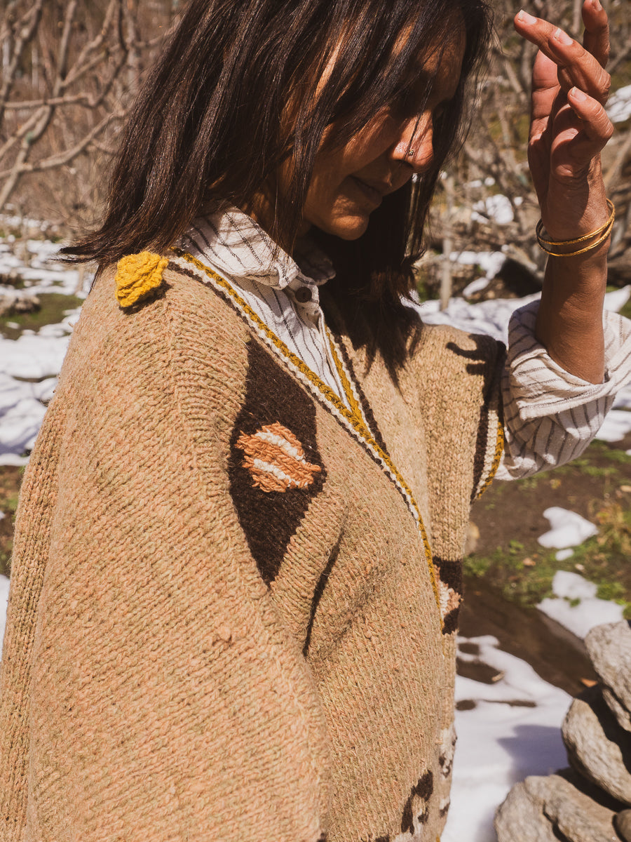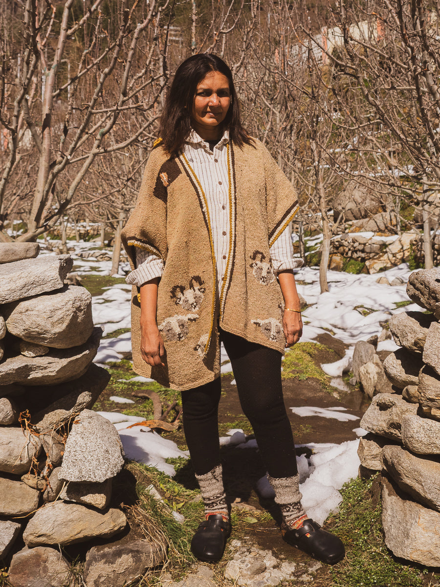 In collaboration with the Gaddis to procure their indigenous wool, this pastoral tribe of the Himalayas known for their unique shepherding practices. They traverse the high Himalayan ranges annually, covering thousands of kilometers with their sheep to migrate to traditional pastures. Each Kullvi Whims piece embodies the essence of the mountains as every piece undergoes a natural dyeing process with colours derived from local native flora. Every knitted or woven piece serves not only as a beautiful creation but also narrates the stories of its maker and the journeys undertaken across the breathtaking Himalayan landscape.