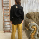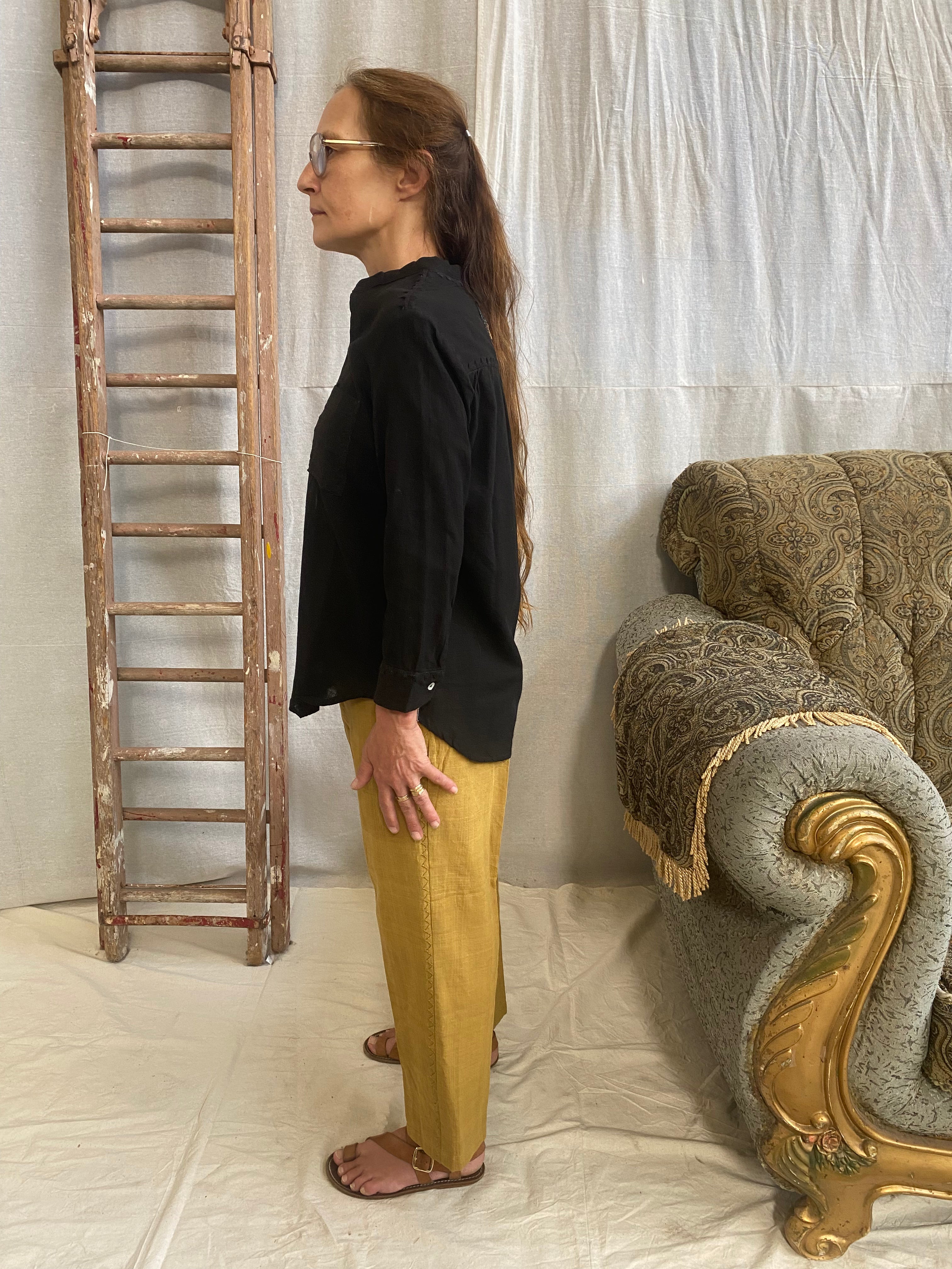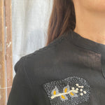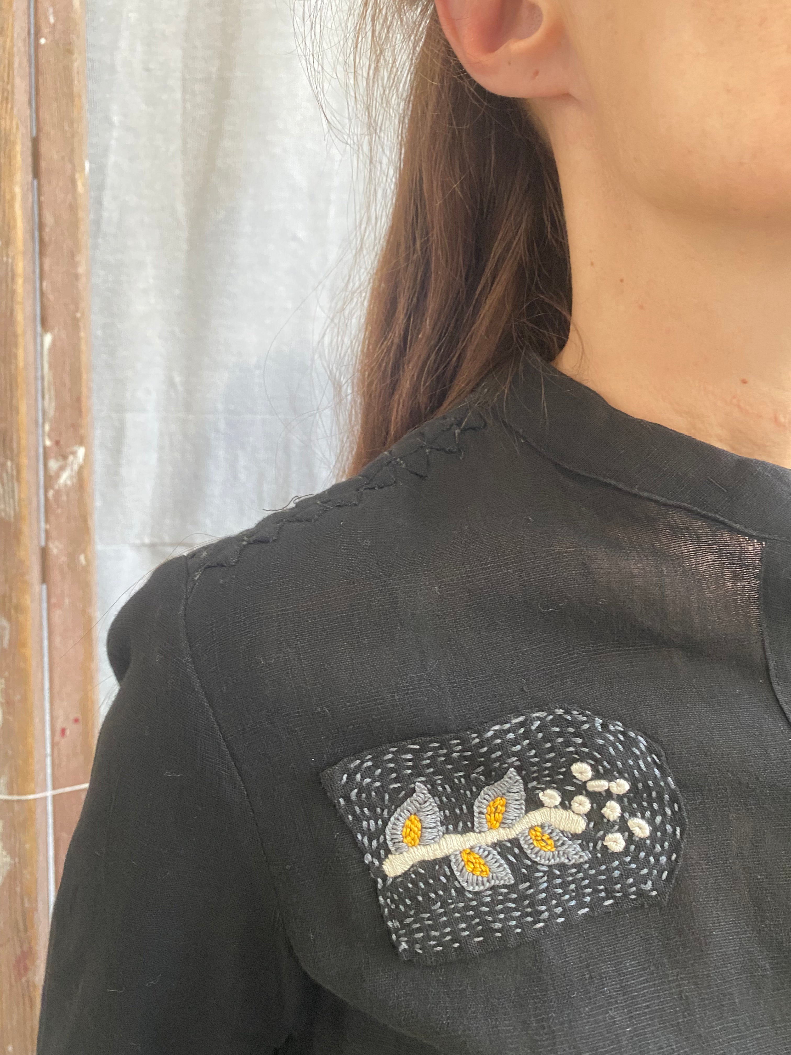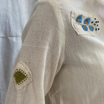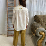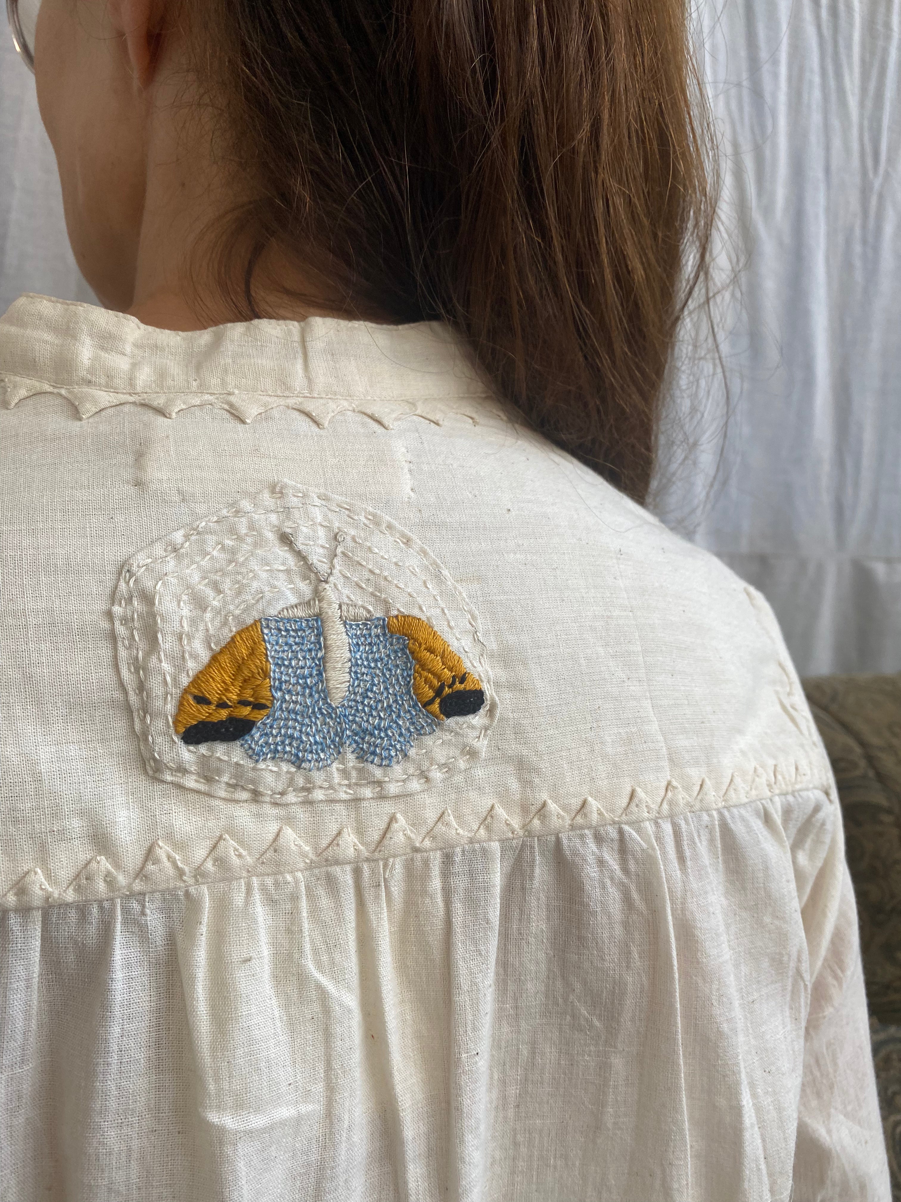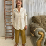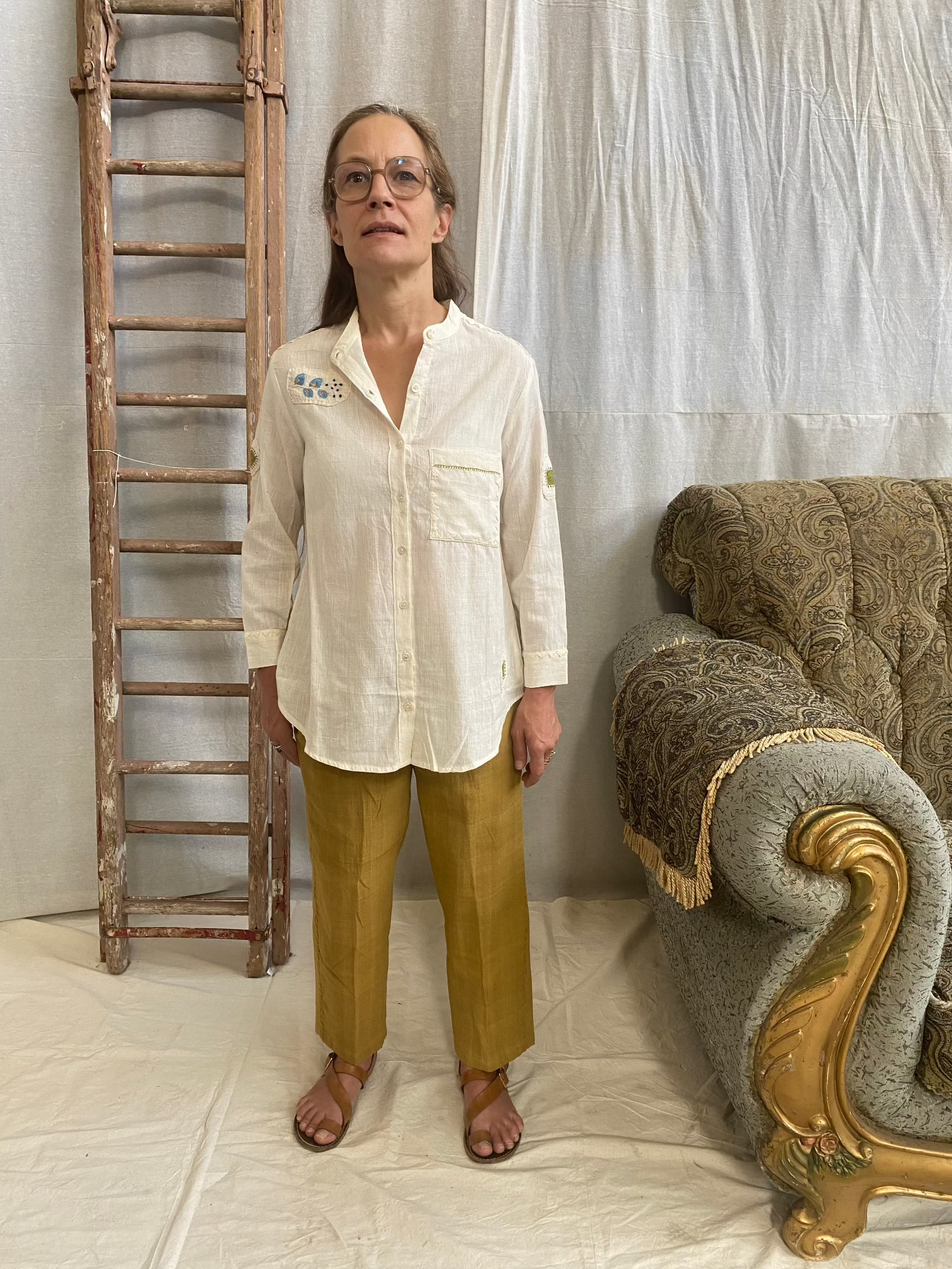 Fitting like a classic shirt – the Biodiversity Shirt has a unique semi circle godet on each side, allowing the shirt to have a more tailored shape on the hips. Equipped with a soft band collar, cuffs and feature buttons down centre front, the bottom hem beautifully falls to the hipline. Inspired from the natives in Sittilingi, where Porgai Artisans live and work, this shirt is adorned with hand embroidery features in various places, namely butterfly on the centre back of the yoke, flowers over the right breast as well zig zag blanket stitch binding on the front pocket and shoulder seams.