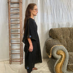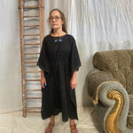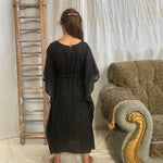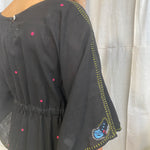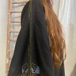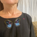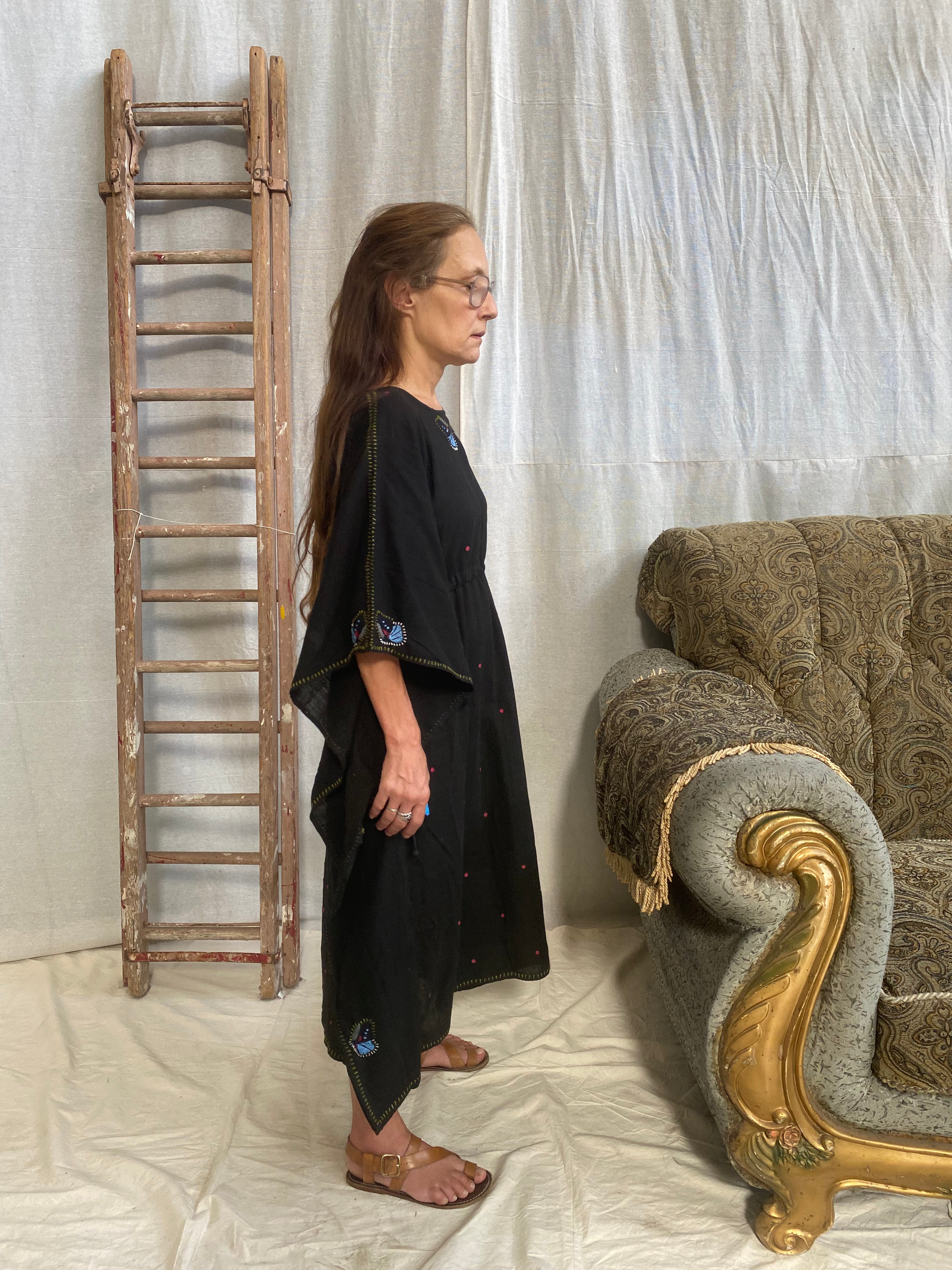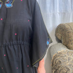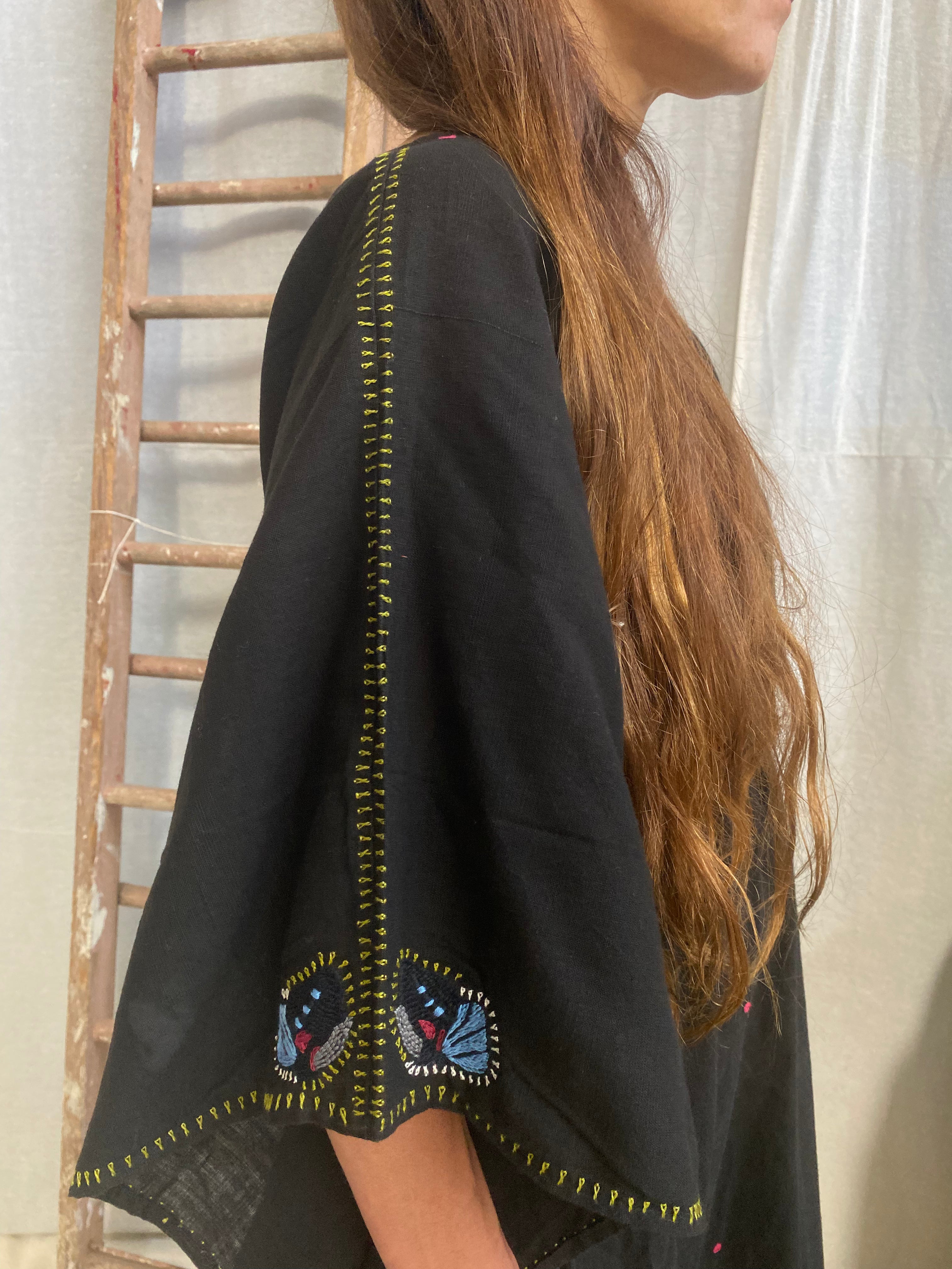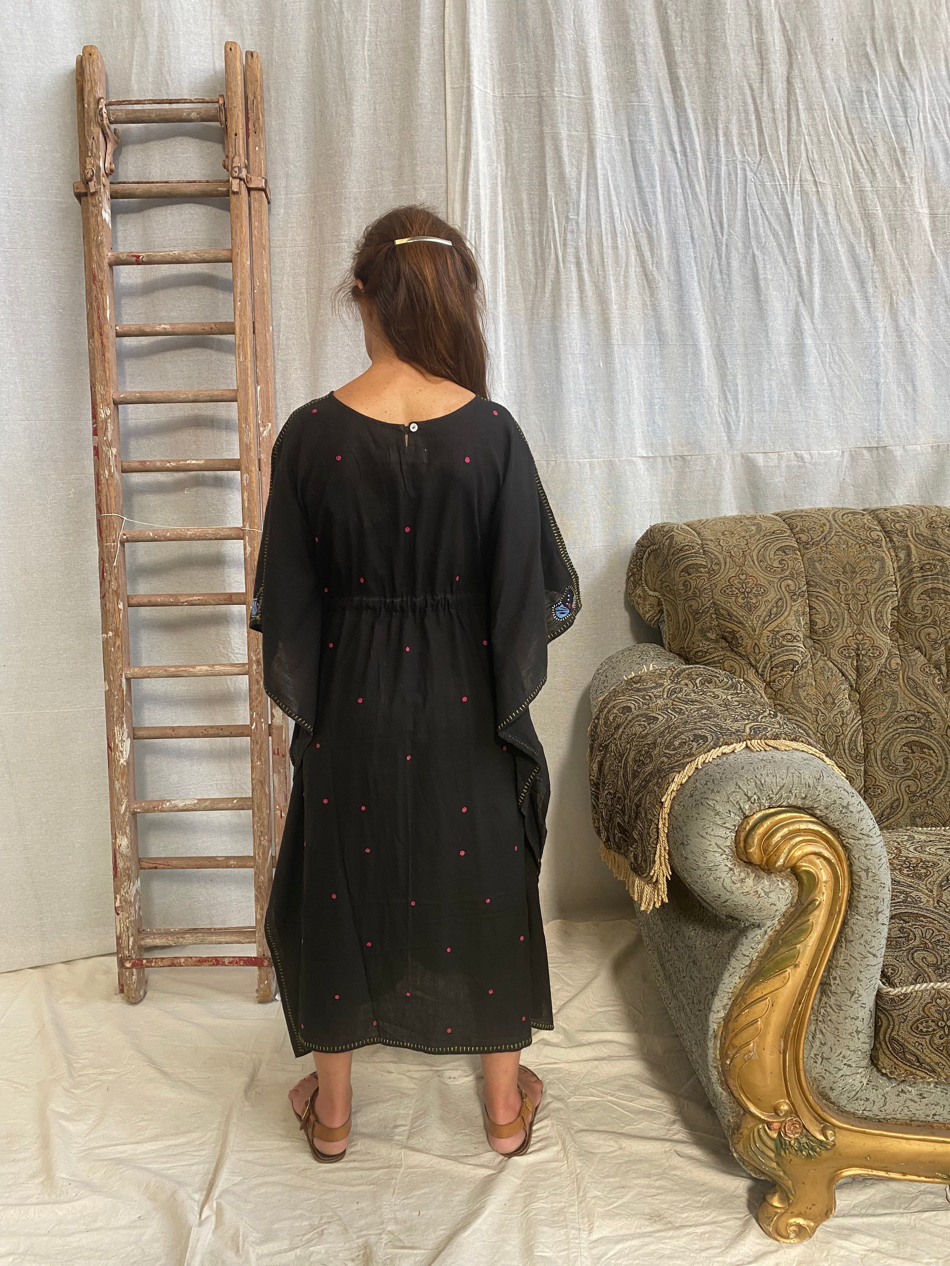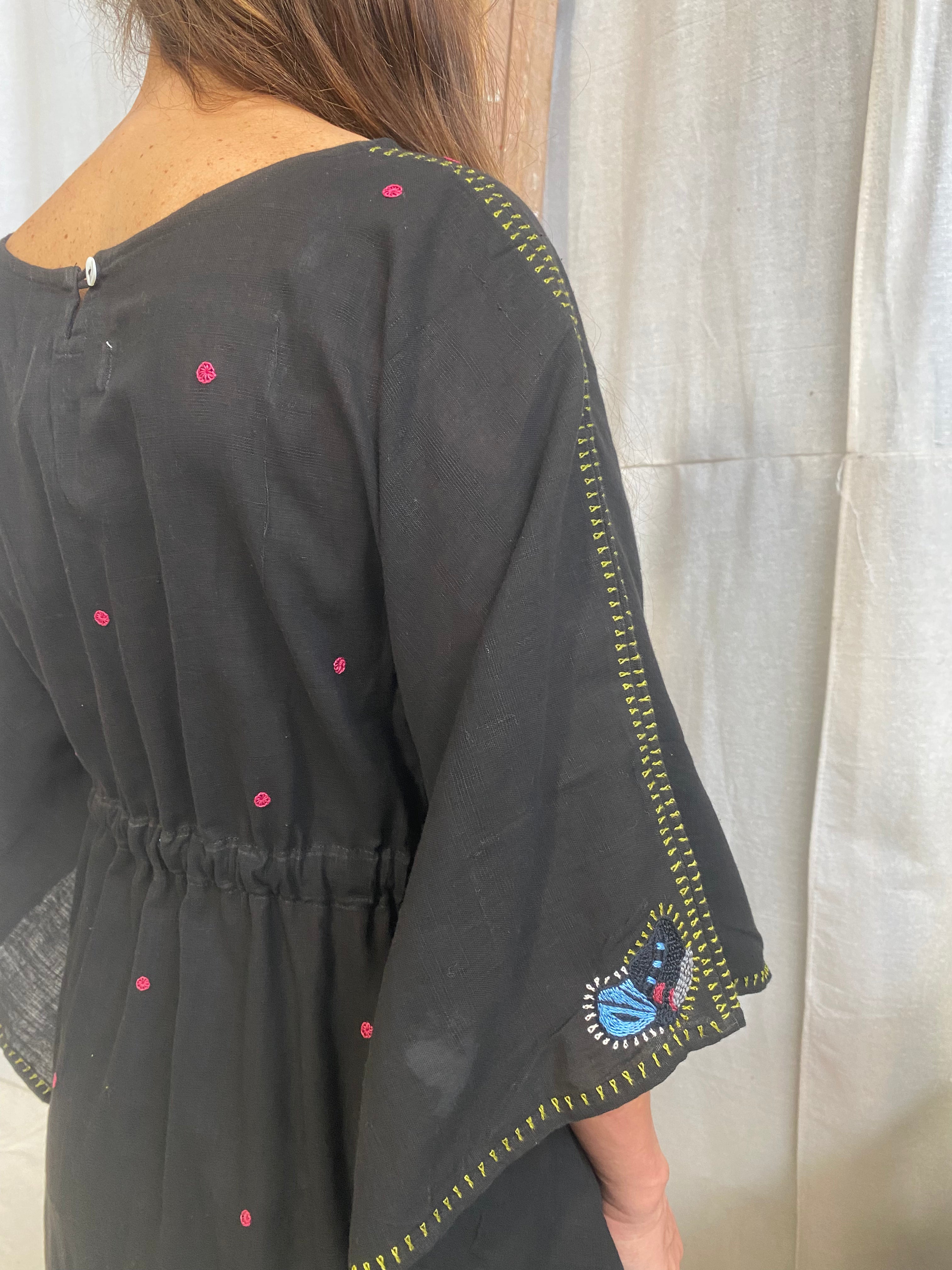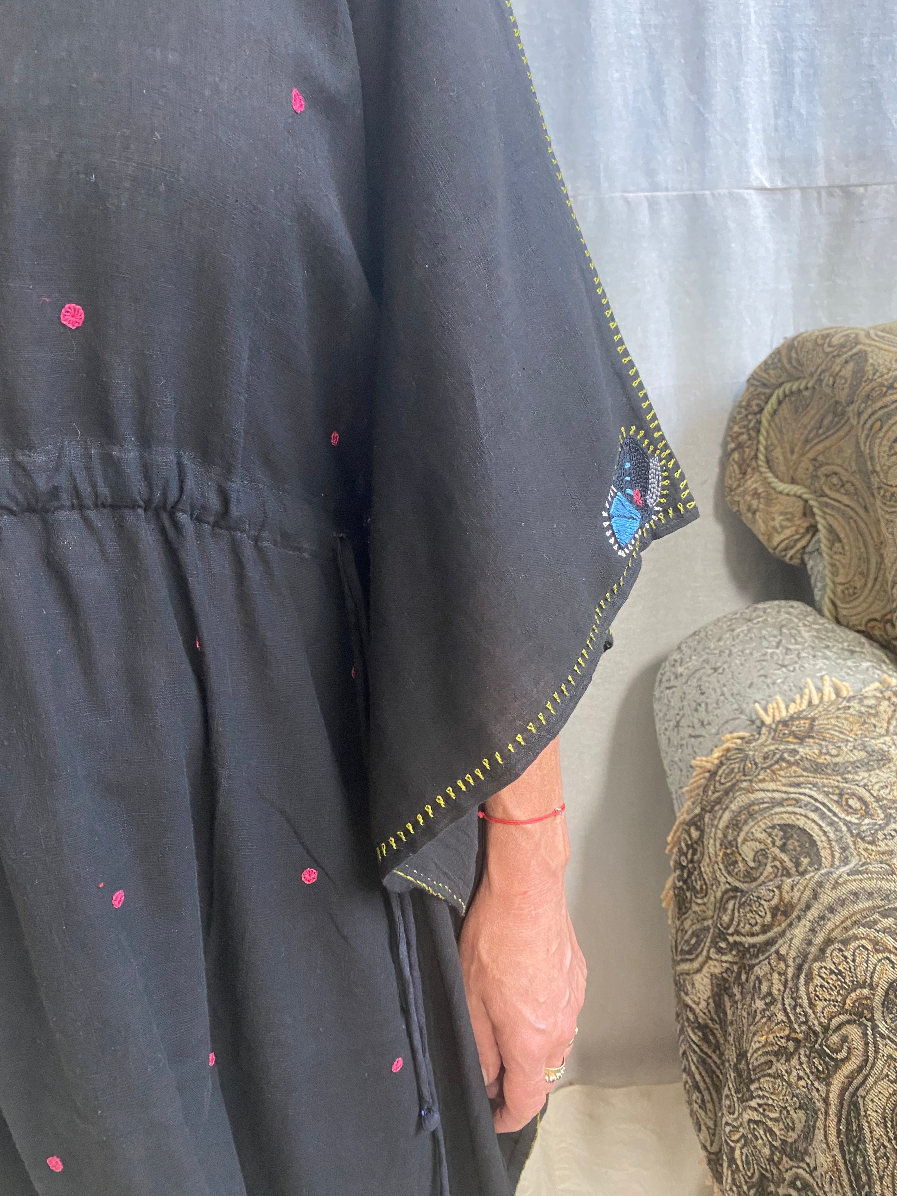- Crafted with meticulous attention to detail, the kaftan features hand embroidery throughout, showcasing charming polka dots and elegant borders along the hems. The pièce de résistance is the breathtaking Blue Mormon butterflies, which are intricately embroidered on the center front neckline and the tops of the sleeves, celebrating the artistry of the Porgai Artisans of Sittilingi.