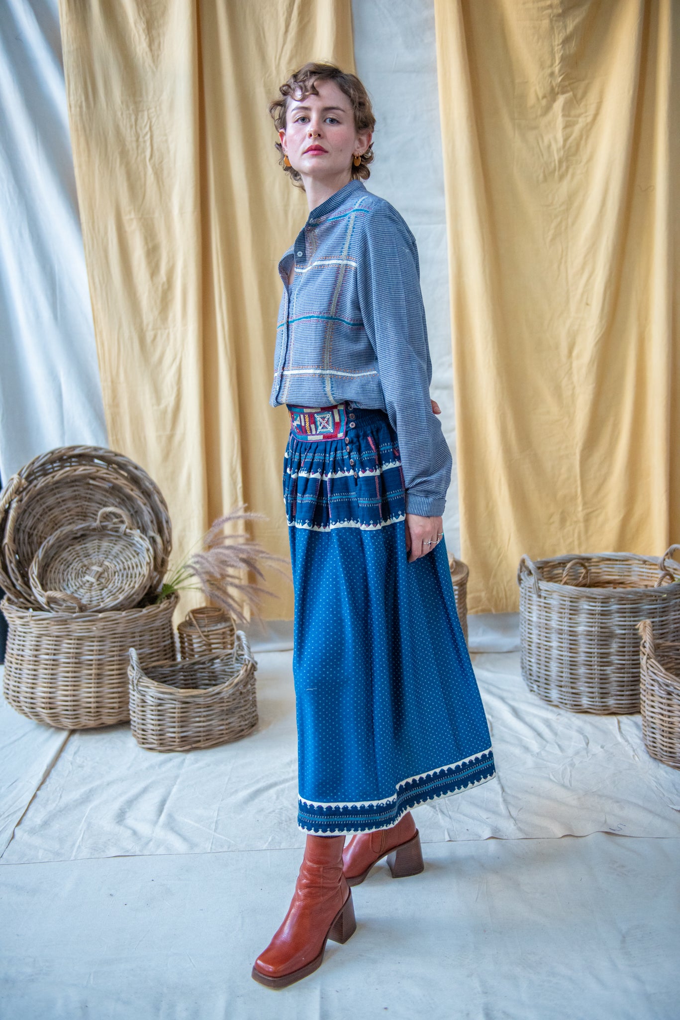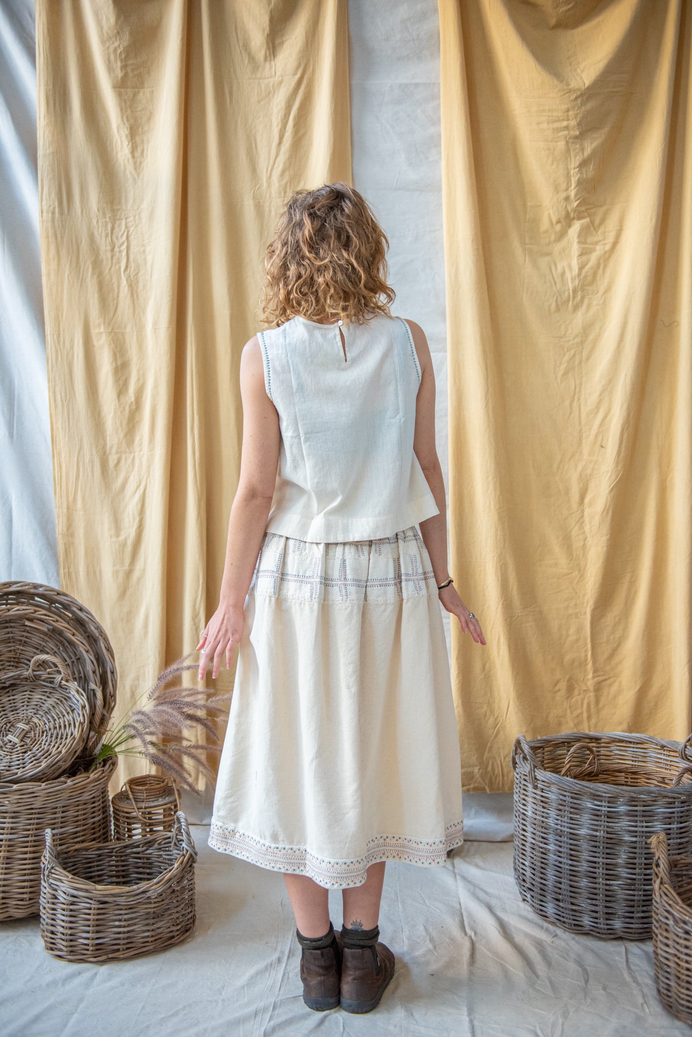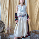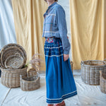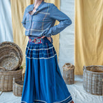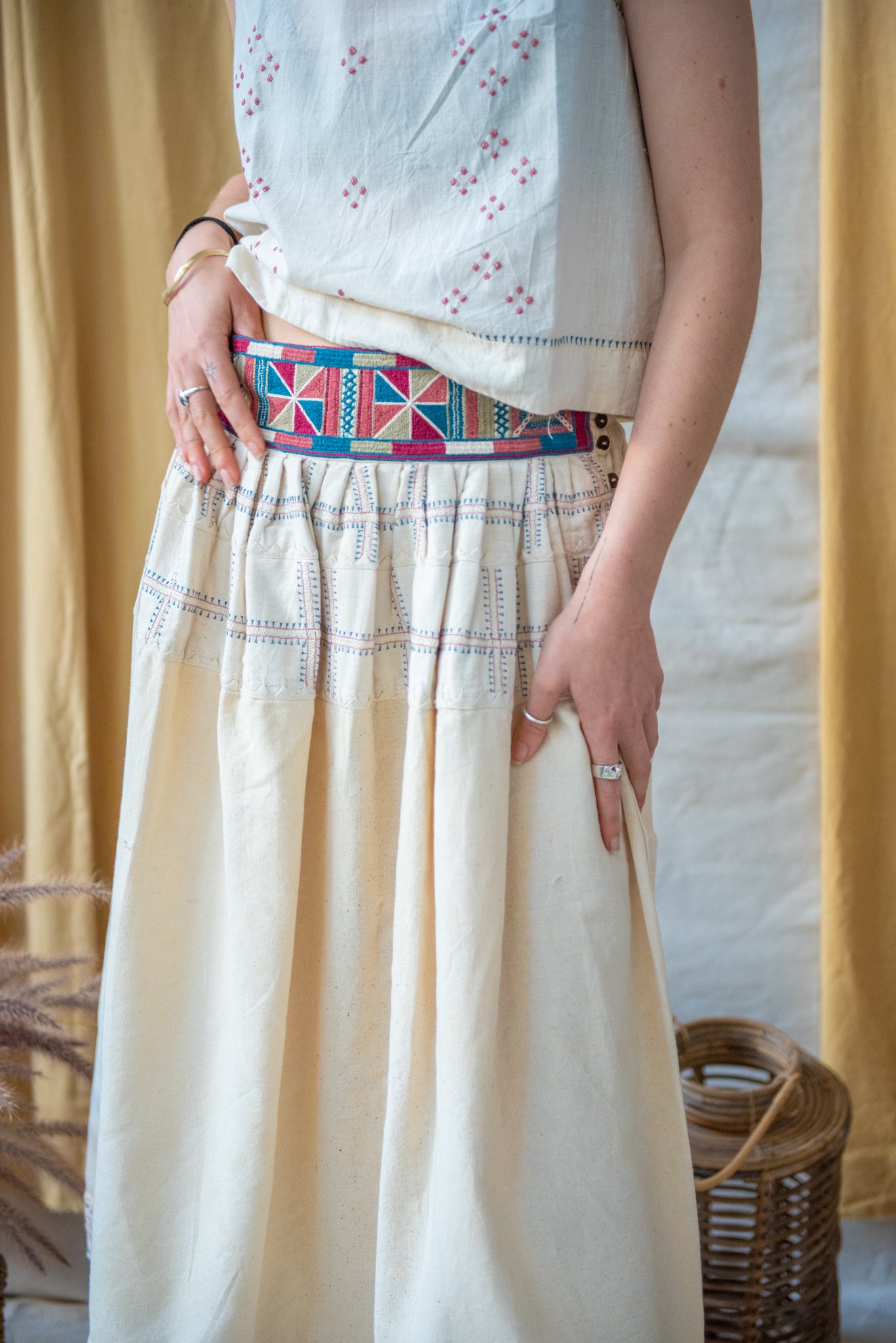 Inspired by a traditional vintage Lambadi skirt, this piece features an extensive embroidered belt waist detail combined with the luxurious texture of Mashru silk that adds not only a unique touch to its timeless design but also both versatile and comfortable to wear. Available in two colourways, Indigo and Natural.