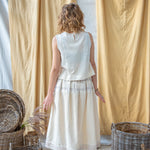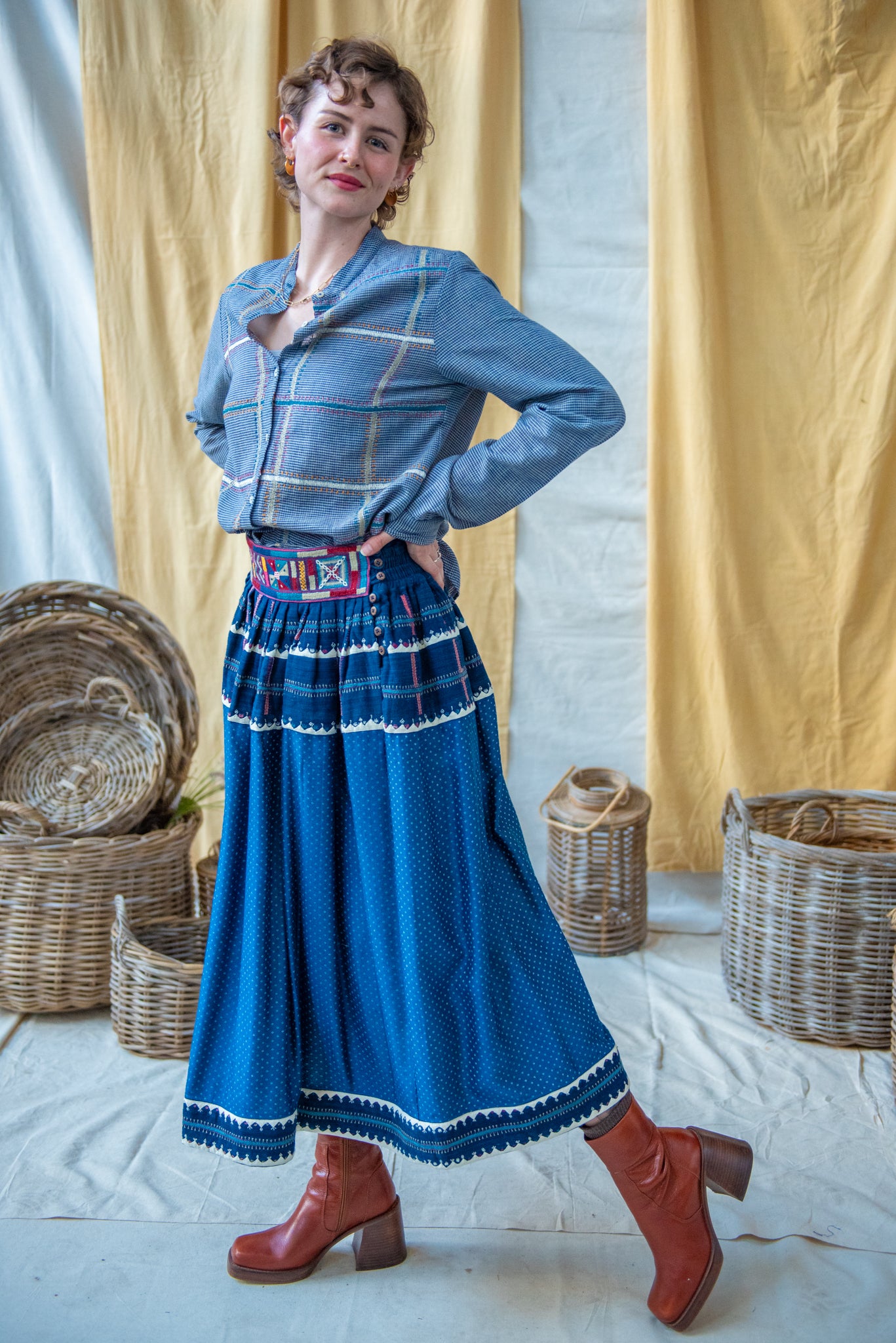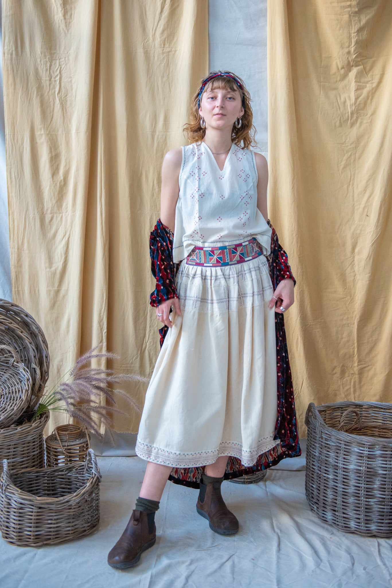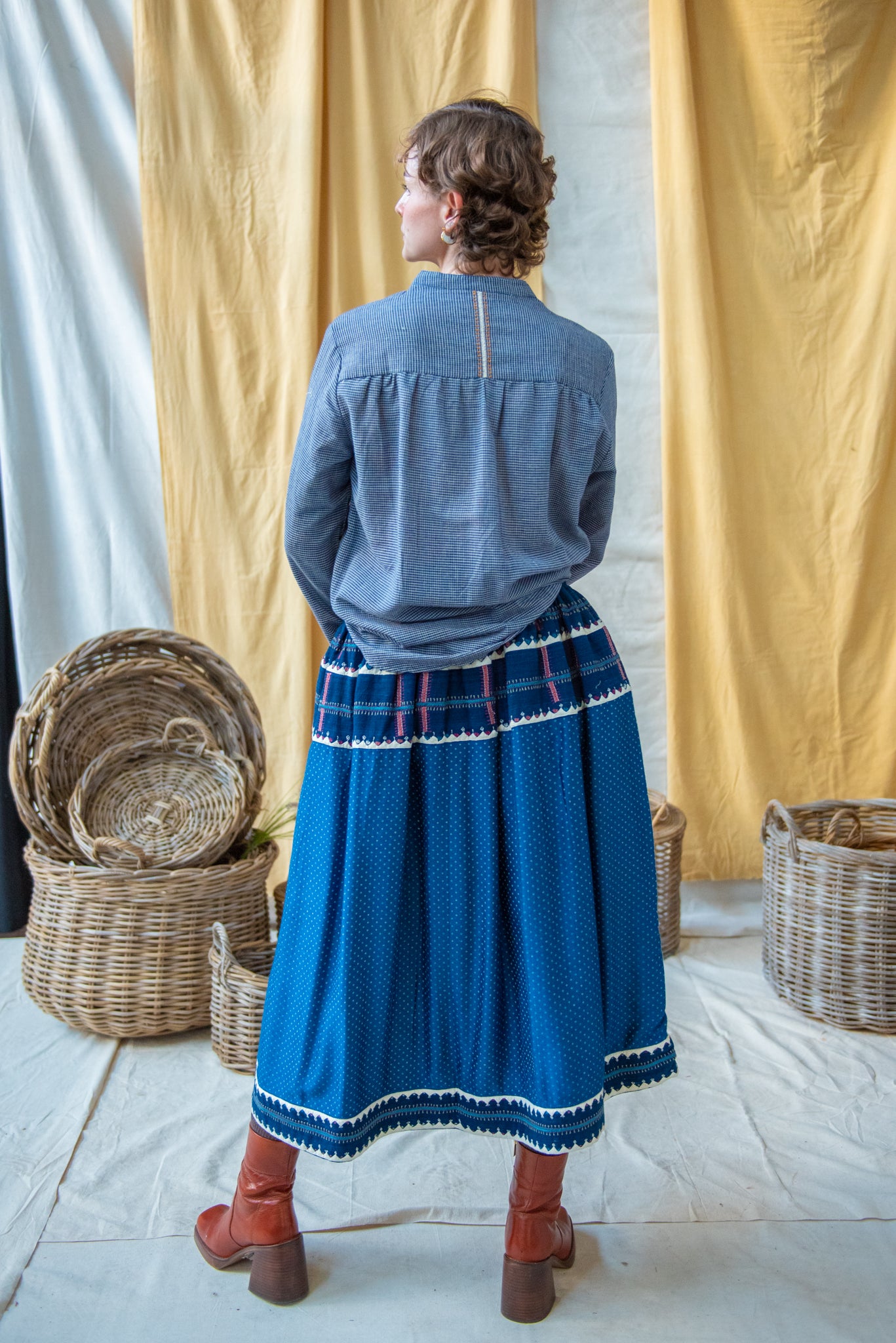 Inspired by a traditional vintage Lambadi skirt, this piece features an extensive embroidered belt waist detail combined with the luxurious texture of Mashru silk that adds not only a unique touch to its timeless design but also both versatile and comfortable to wear. Available in two colourways, Indigo and Natural.
