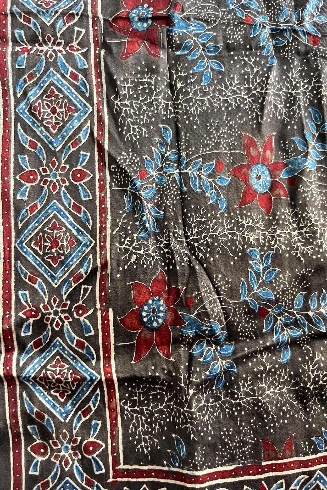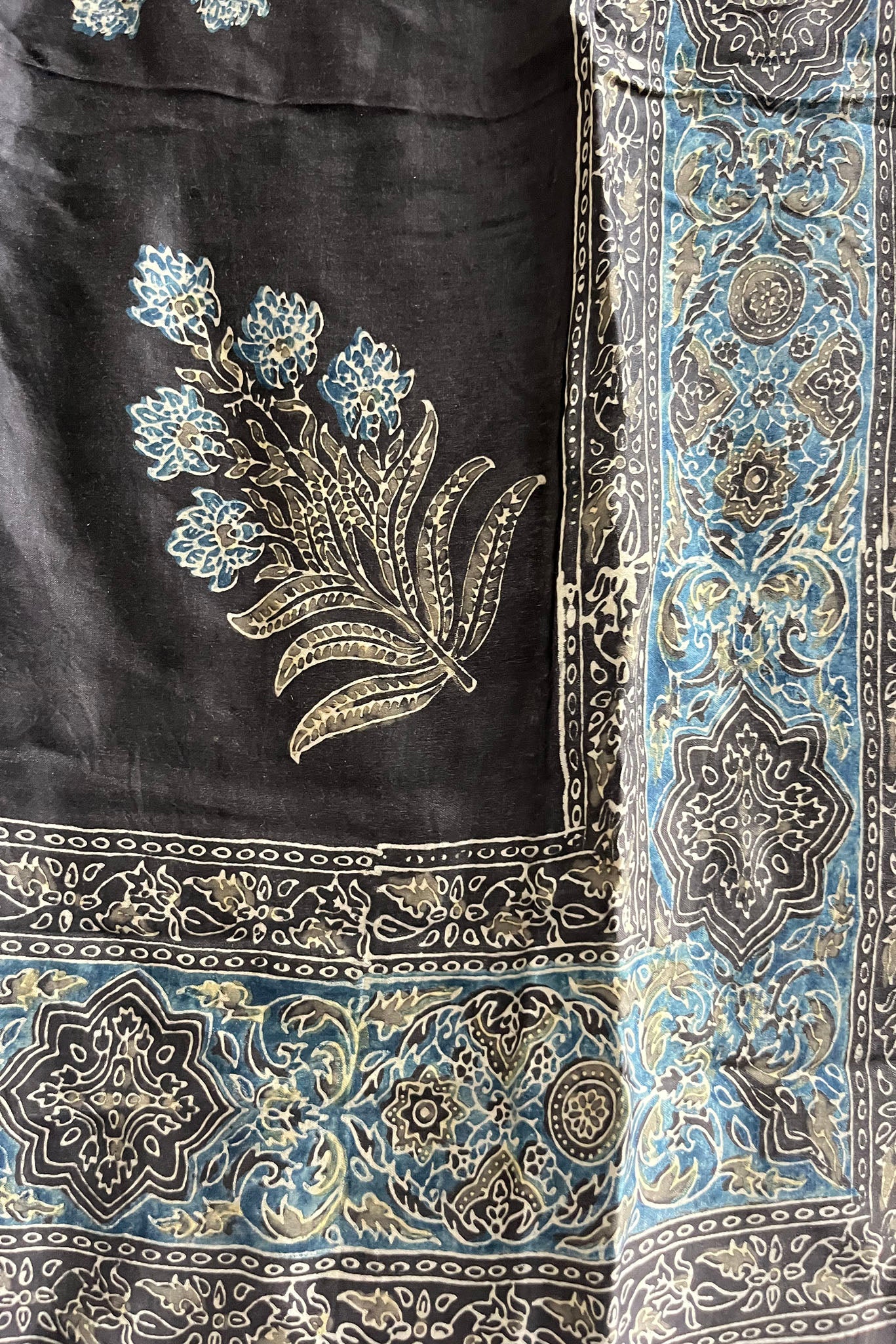 Ajrakh is a 4,500-year-old textile art, known for its intricate double-sided hand block printing and resist dyeing techniques. Using natural plant-based dyes like indigo and madder, each piece is created through a careful multi-step process, with layers of color added day by day using custom hand blocks to produce detailed, one-of-a-kind patterns.
