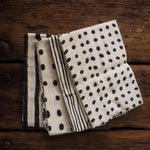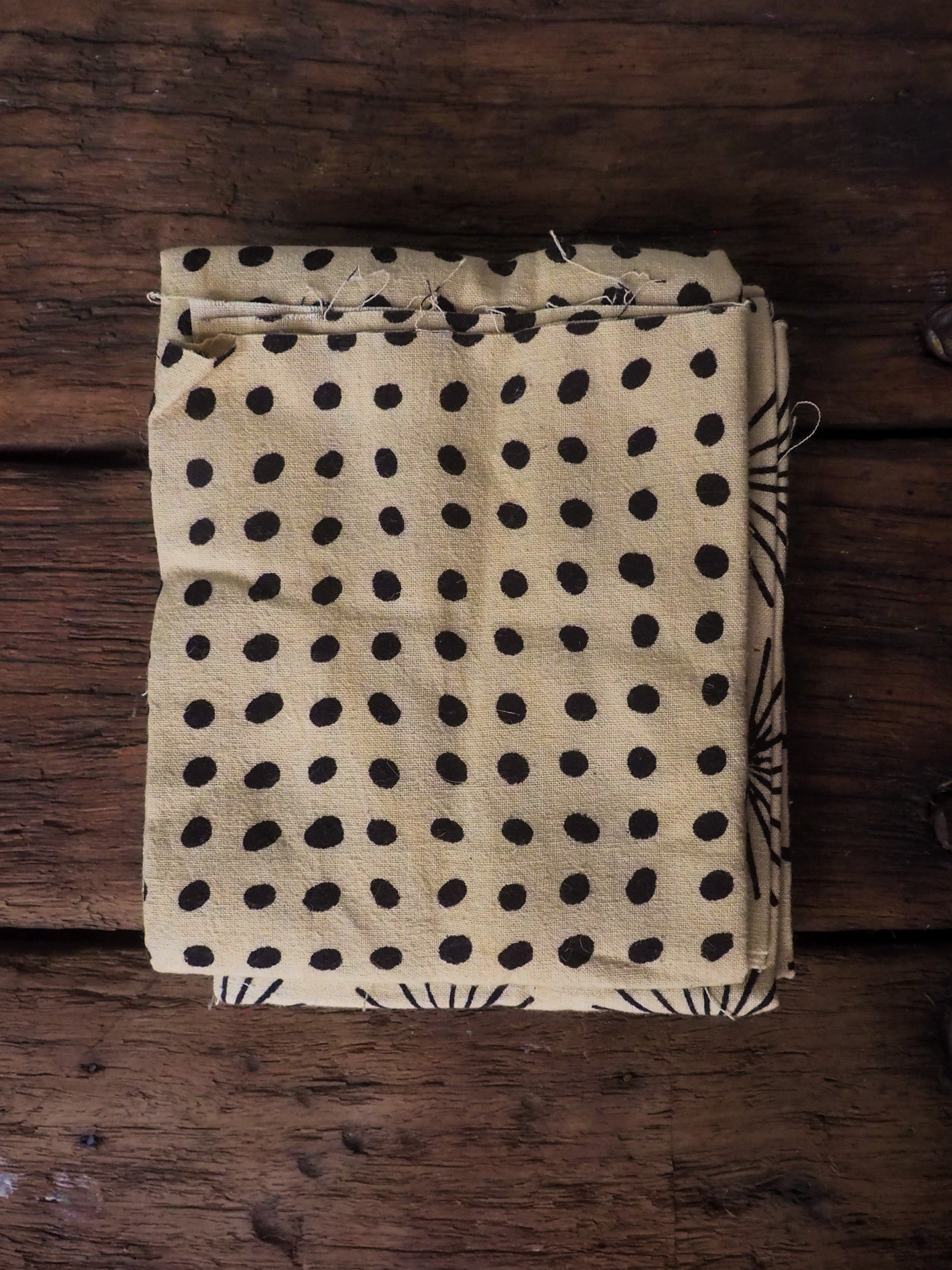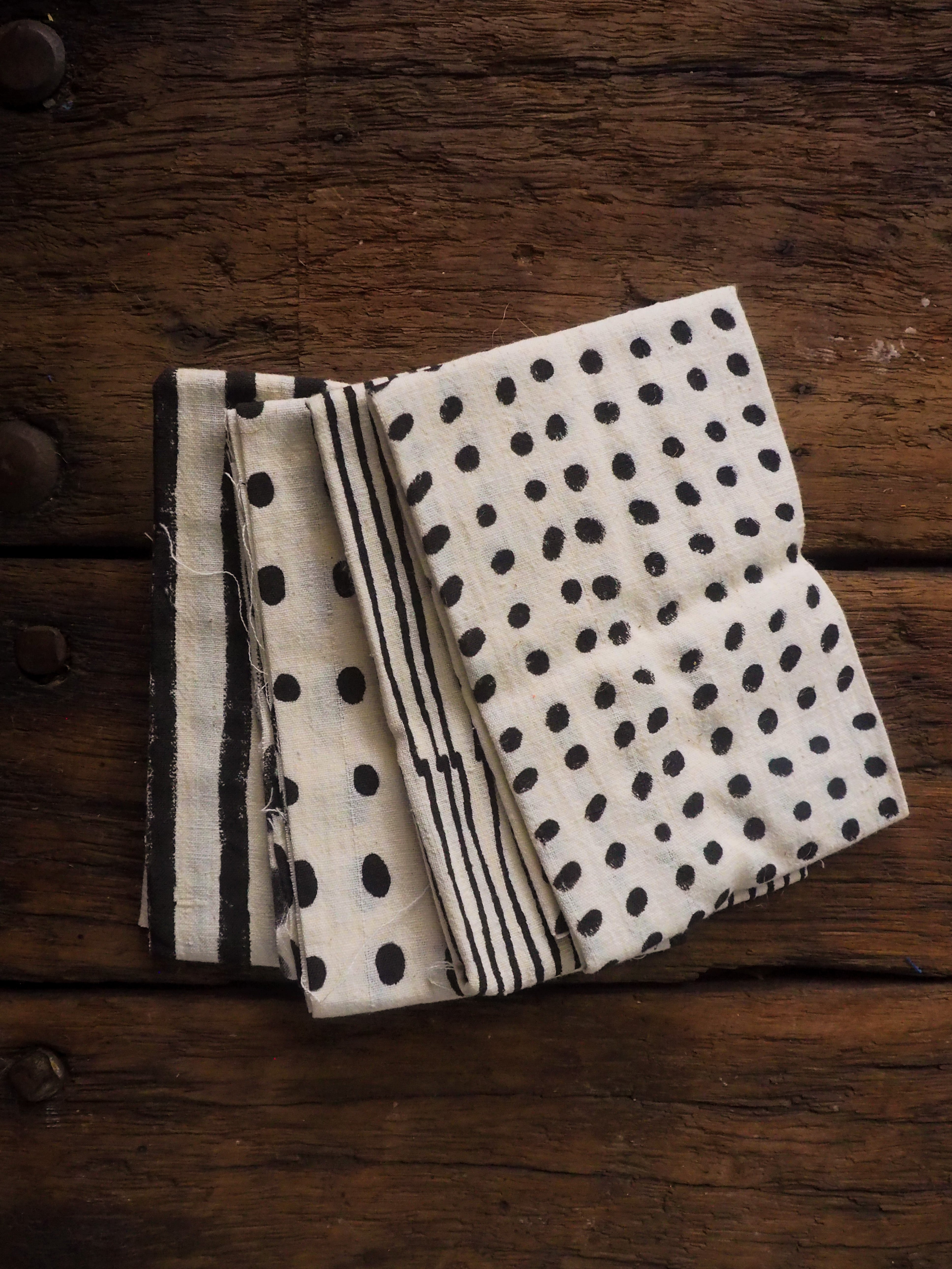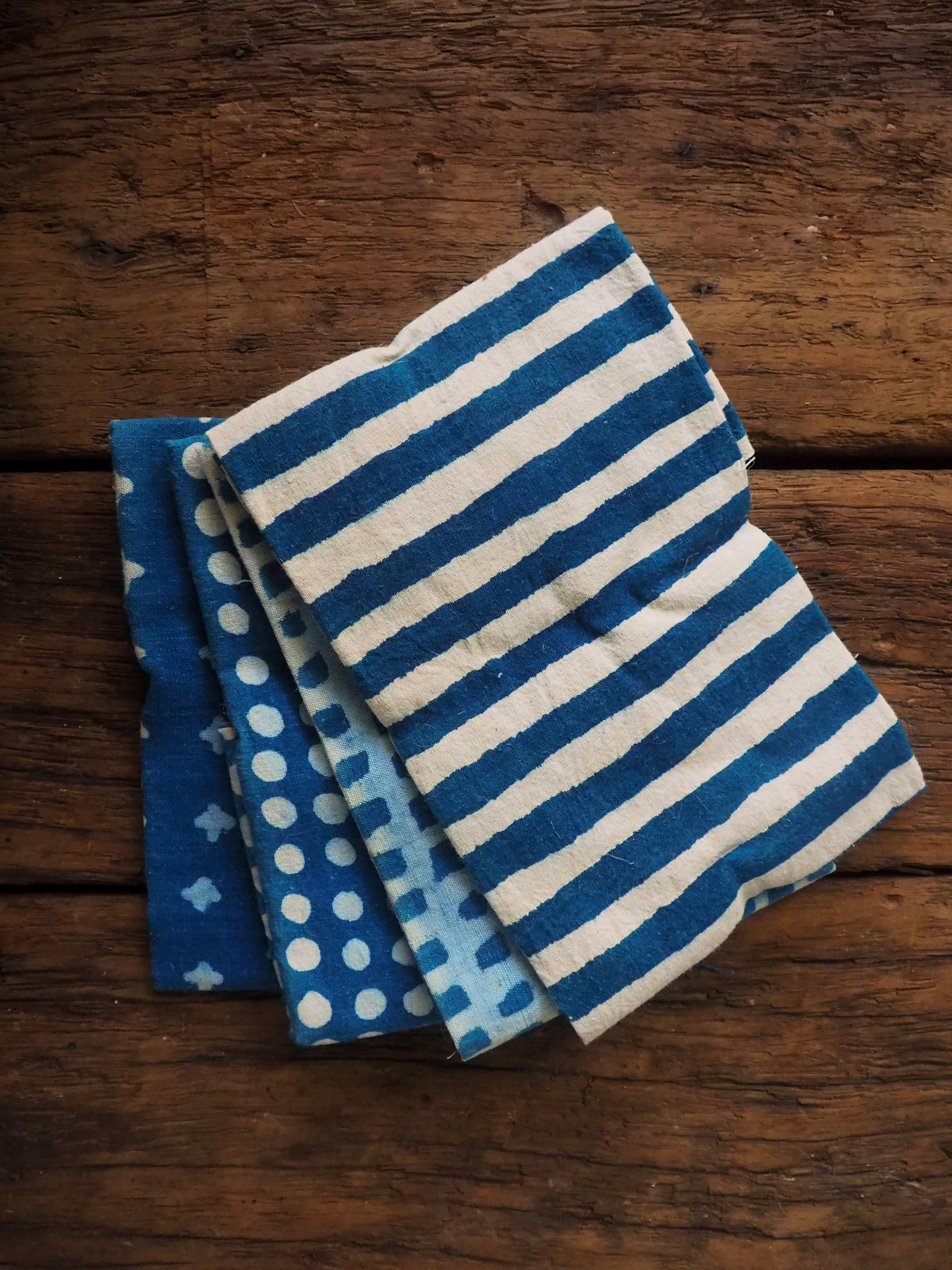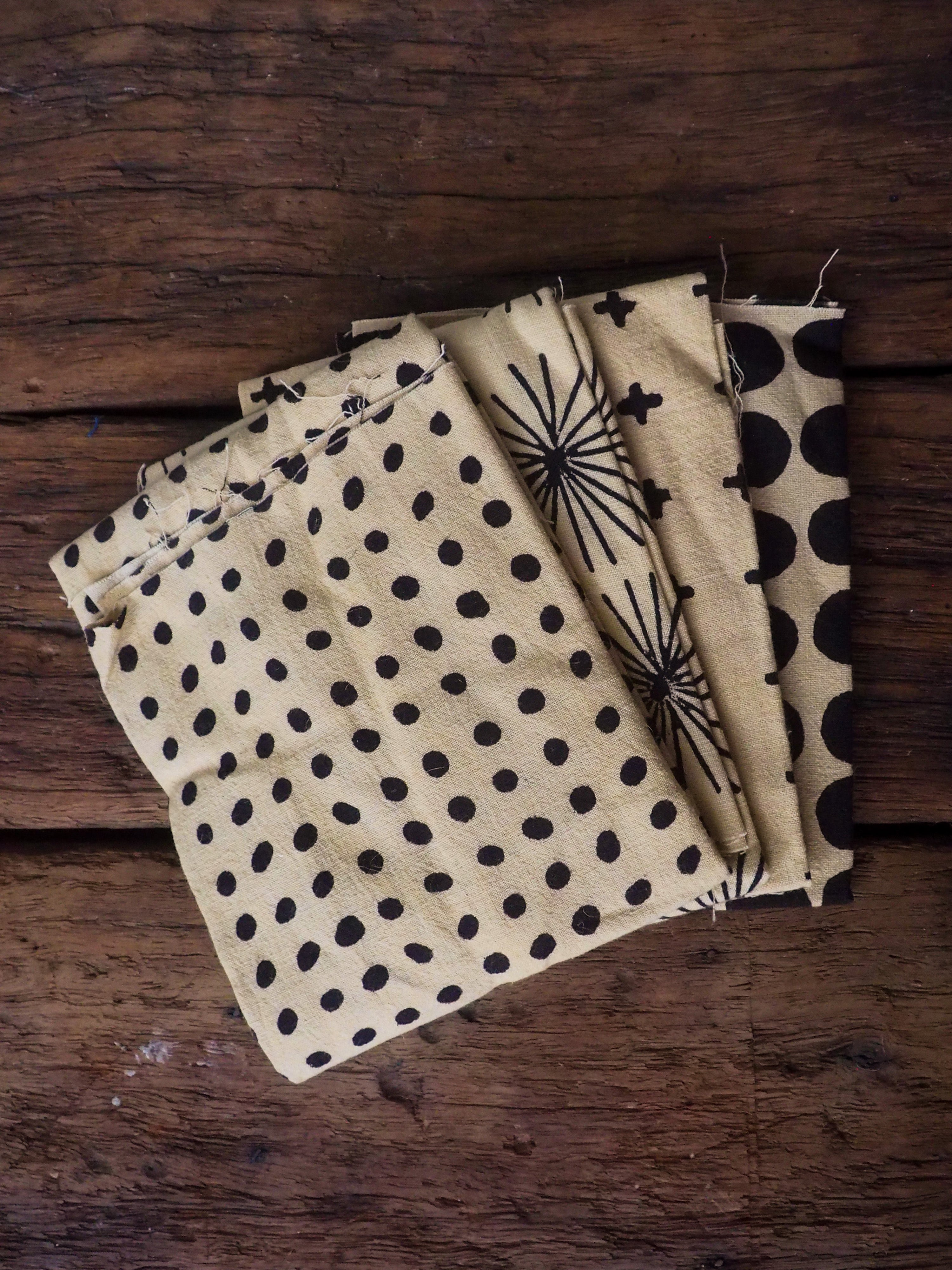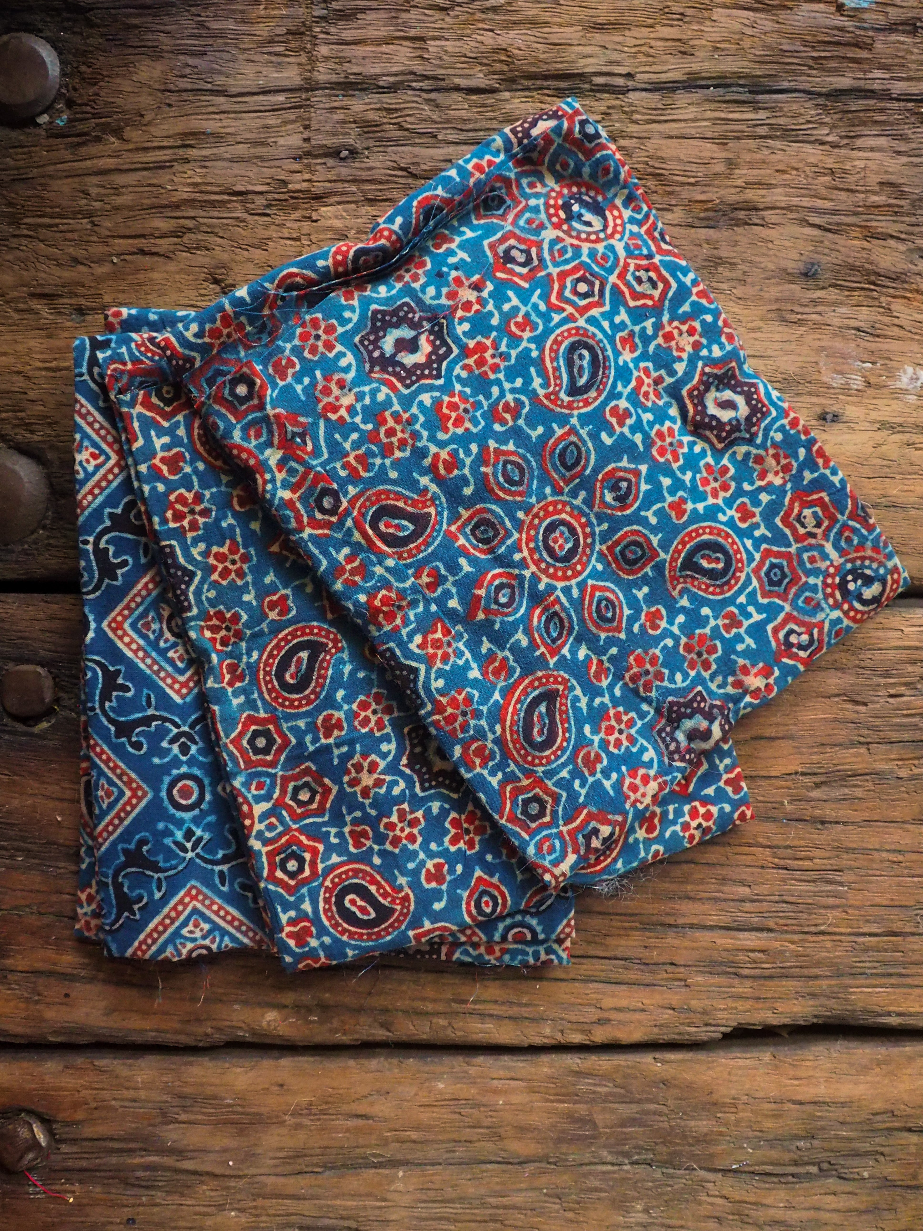 Khadi cotton is handspun, handwoven cloth made in Rural India with a distinct character of textured and unique handmade feel. Each quarter includes 4 pieces of unbleached, naturally dyed and block printed pieces, with measurements varies between 45 to 55cm in width and 50cm in length.