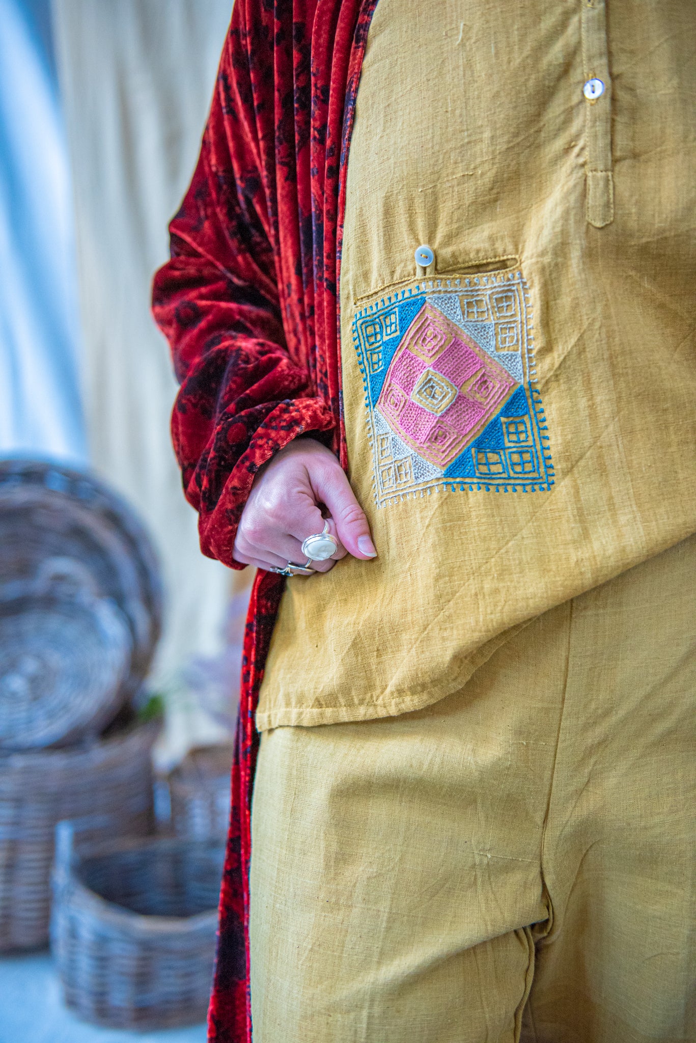 Embrace the beauty of sustainable fashion with our Front Embroidered Pocket Shirt from the Porgai Artisan Collection. Infused with the rich, warm tones of turmeric and adorned with intricate embroidery, this shirt is a perfect blend of traditional techniques and contemporary style.