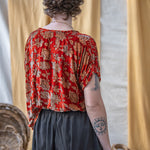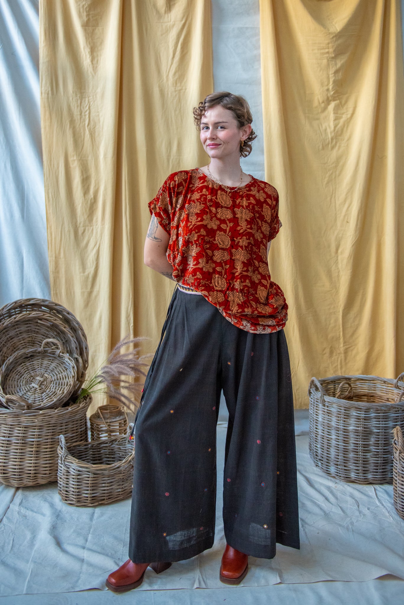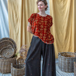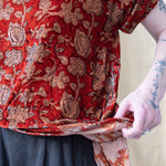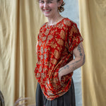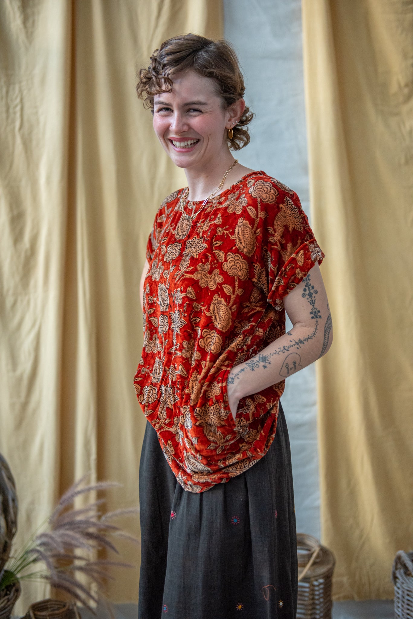 Introducing our Velvet Short Sleeve Top, a stunning piece from our Ajrakh Collection, meticulously crafted by the esteemed artisan Suffyian Kathri in Kutch, India. This top beautifully marries contemporary design with the rich heritage of traditional Ajrakh craftsmanship, making it a must-have addition to your wardrobe.