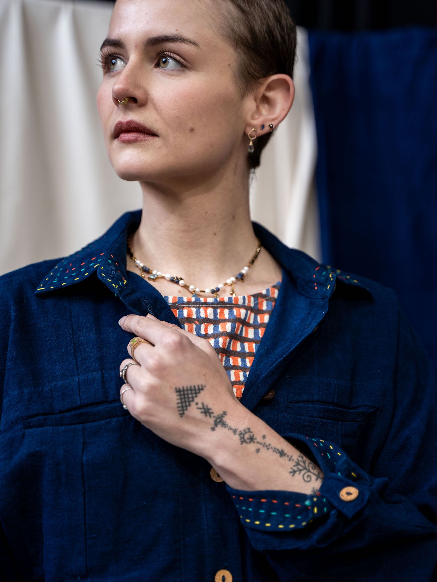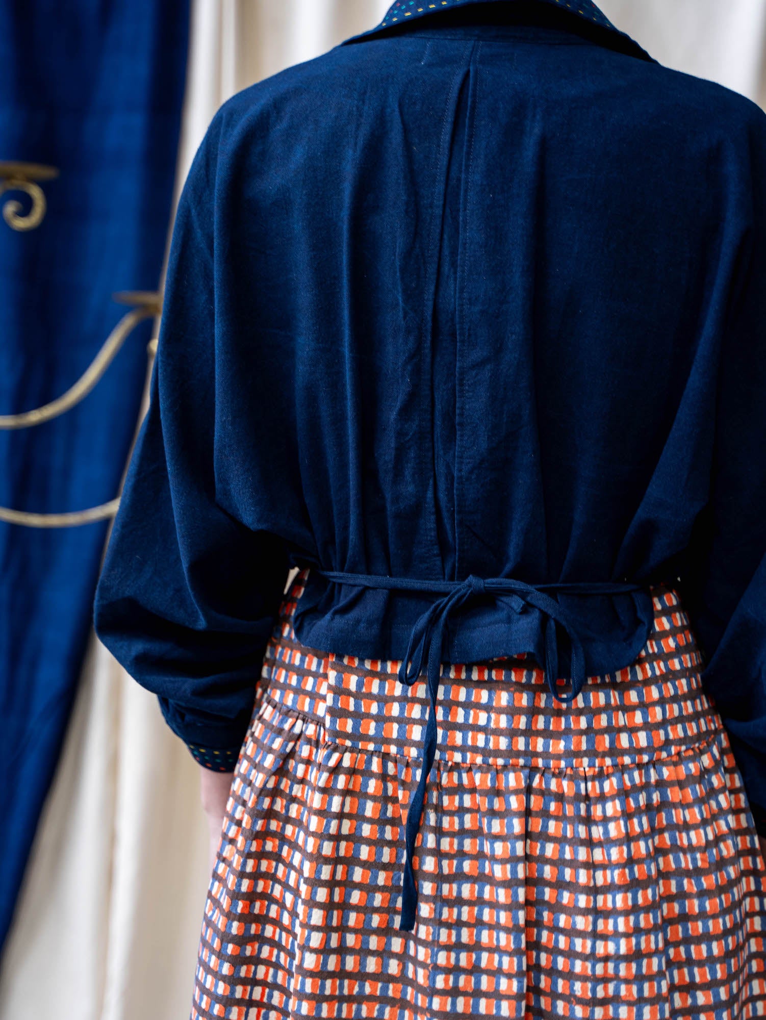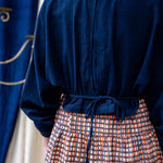 This season, the cropped Shirt Jacket is a testament to the craftsmanship of the team at The Stitching Project. Our true Indigo colourway is a classic staple colour and wears like dark denim, just not as heavy. Hand stitching around the collar in our collection colours – Teal, Yellow and Orange to add a pop of colour in the detailing. Pair this with our bold orange and blue stripe Tailored pants to create a strong silhouette, or with a pair of white jeans for that timeless French look.