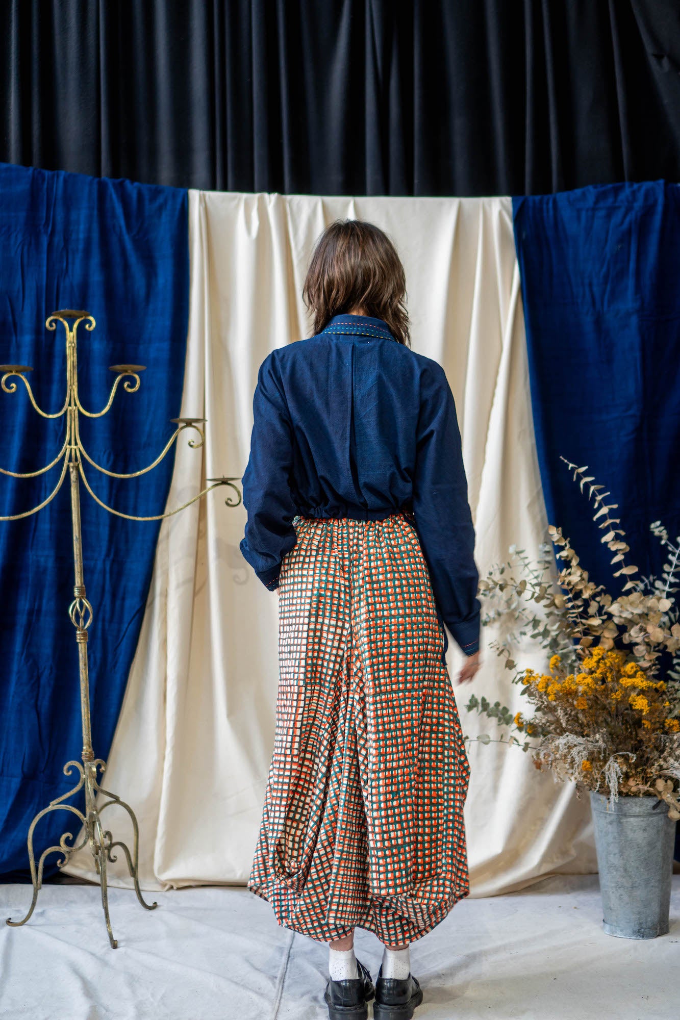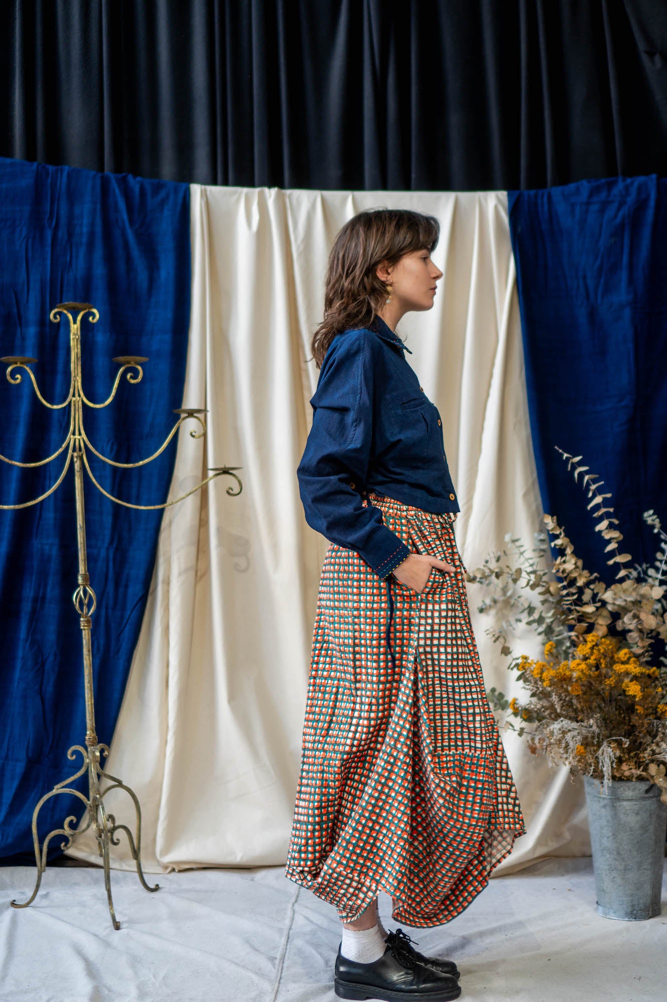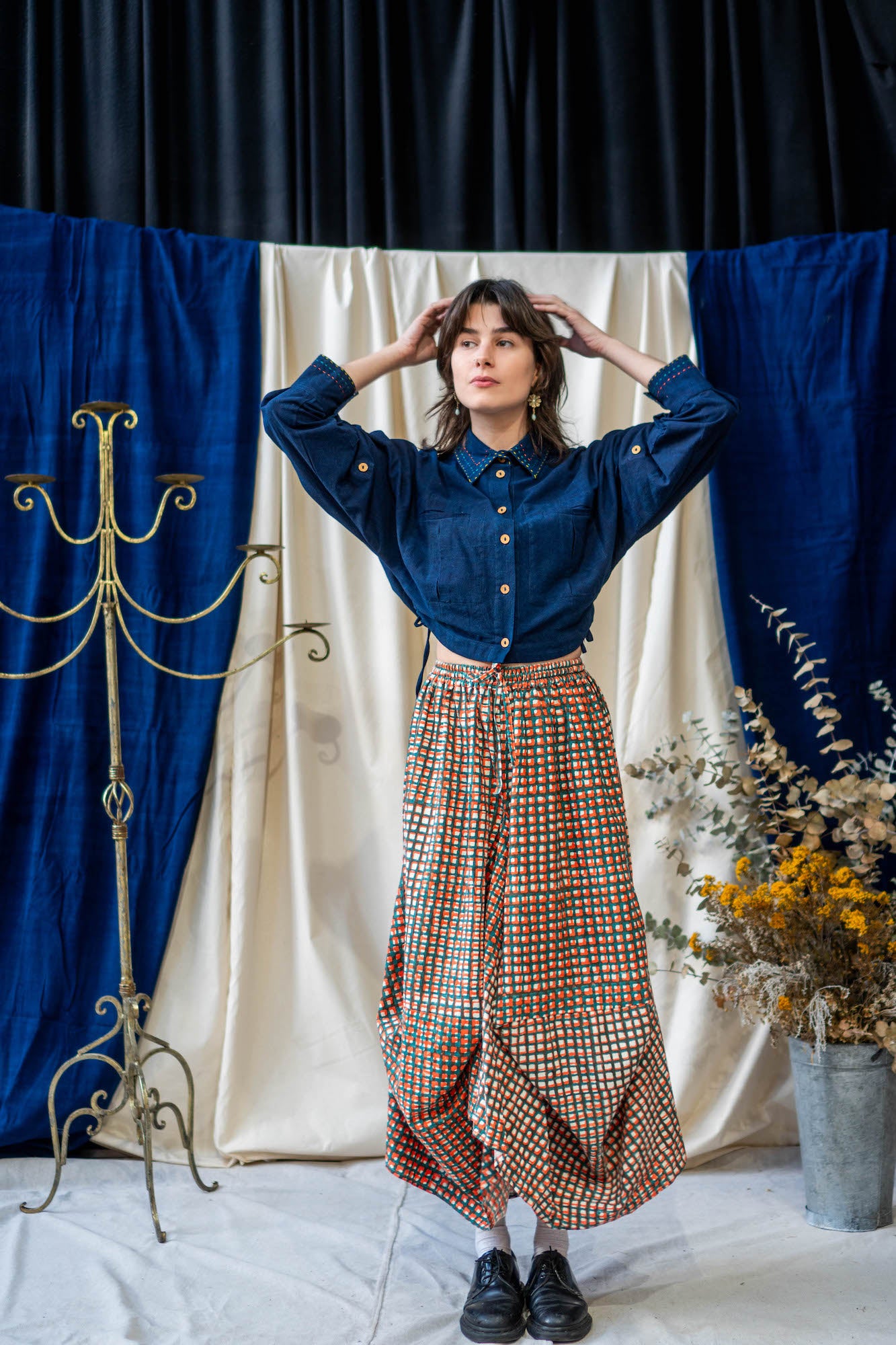 Based on the block for our classic Unisex Button Up Shirt, this new classic is a cropped version that falls perfectly on the waistline to pair with a high-waisted pair of pants or low rise to show off a bit of skin. The Cropped Shirt doubles as a jacket – made from midweight Khadi Cotton, so it is heavy enough to provide warmth as a layering piece on slightly cooler days, while still being stylish and versatile.