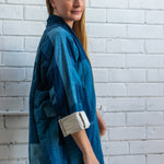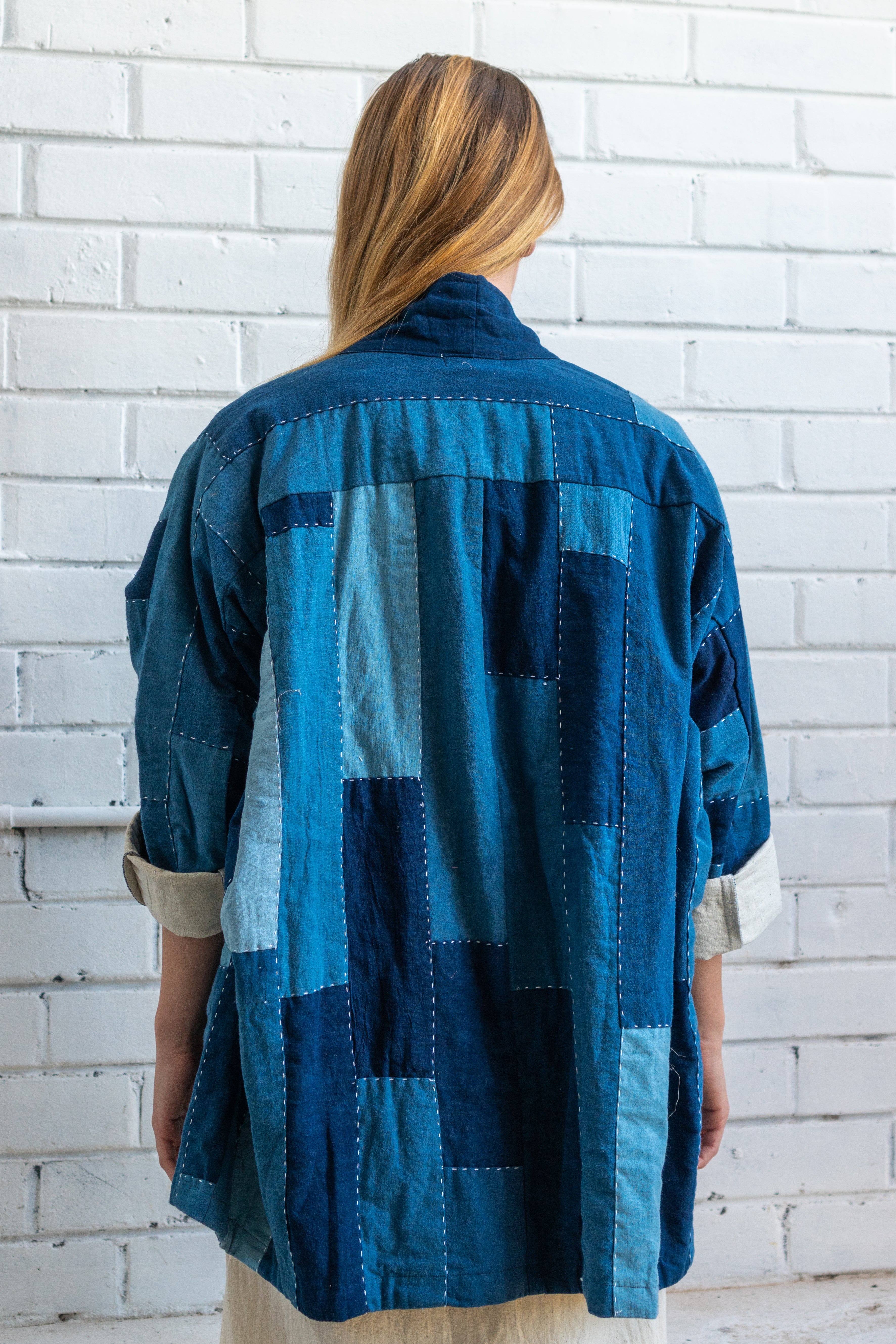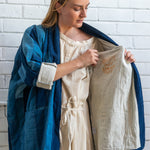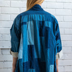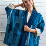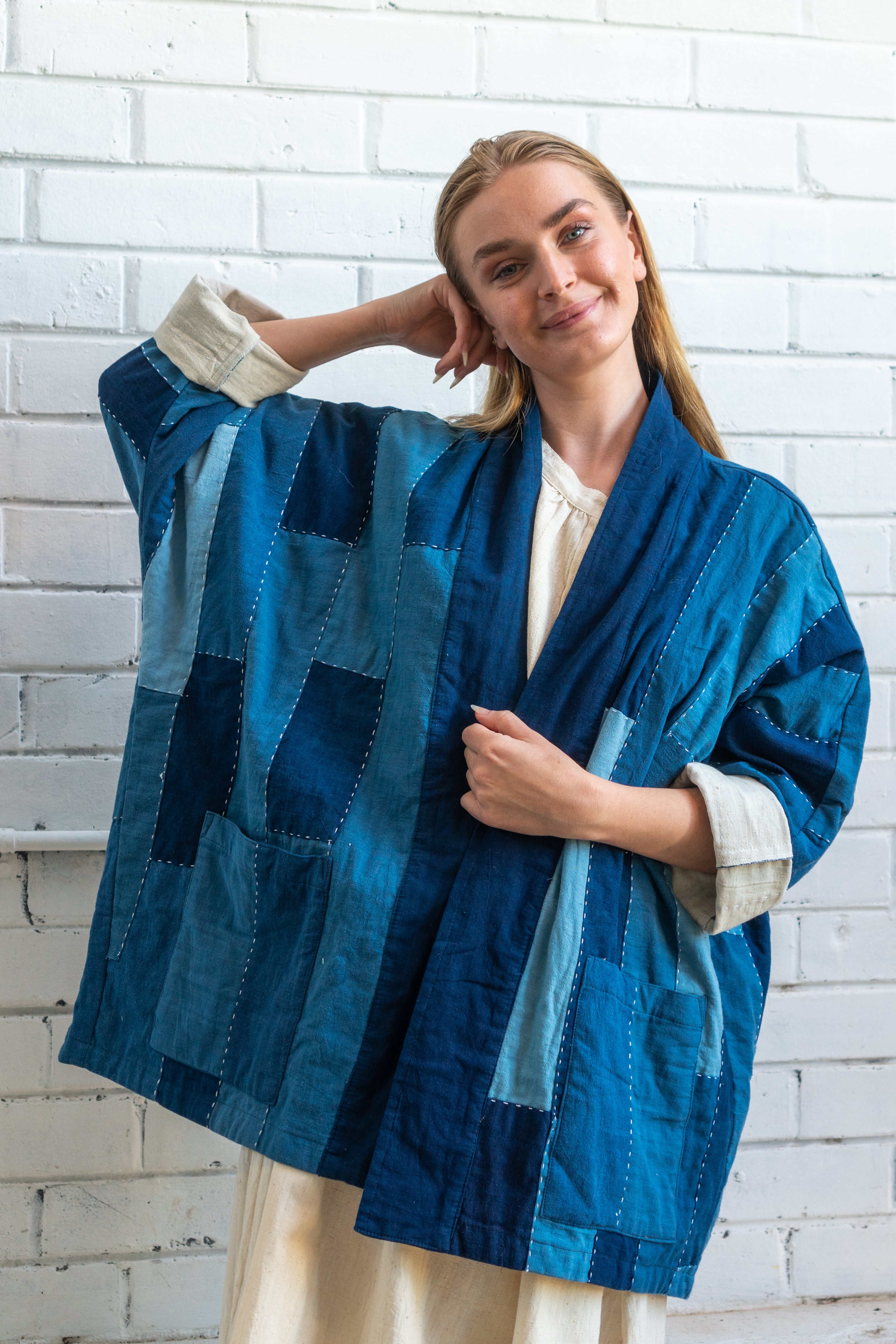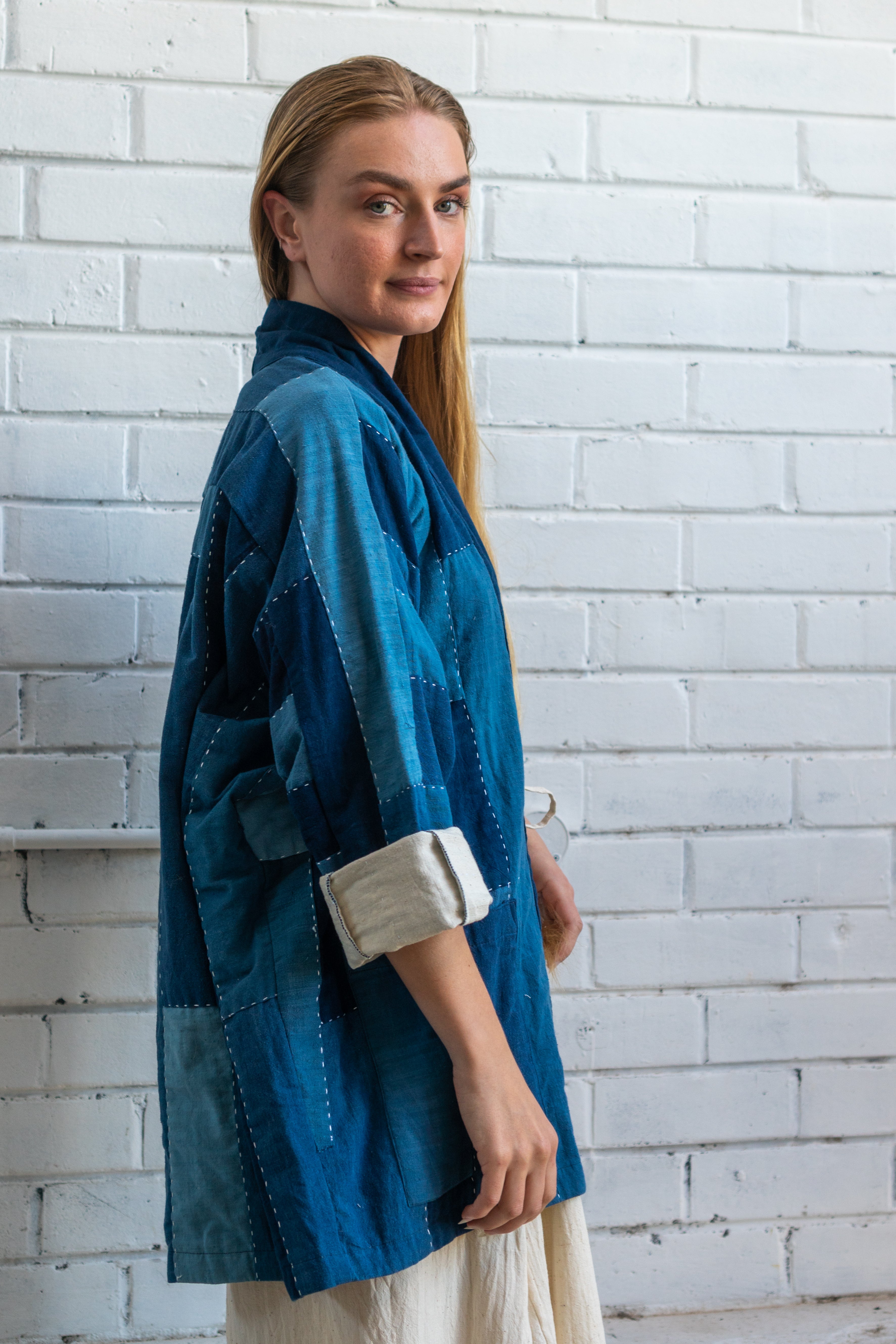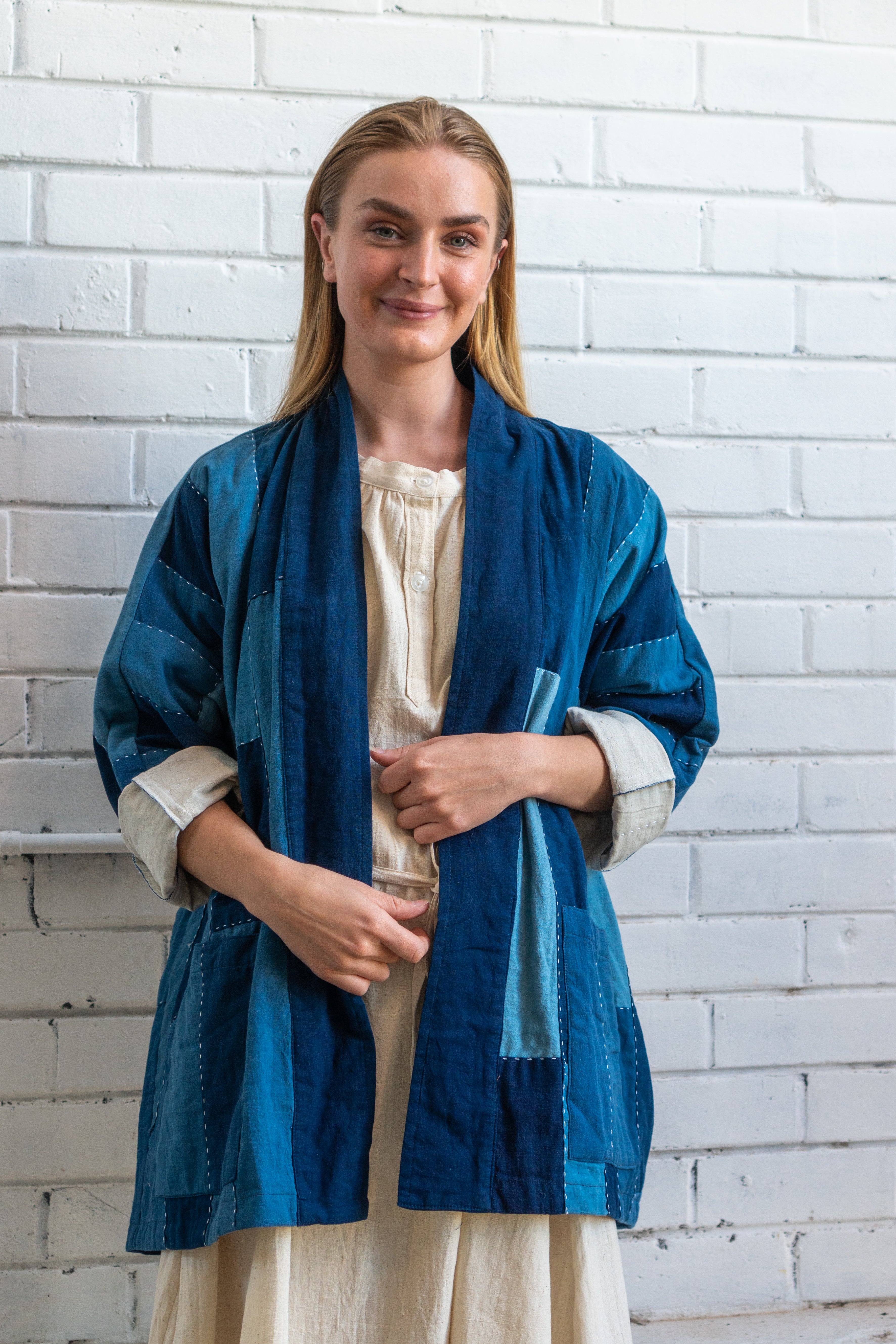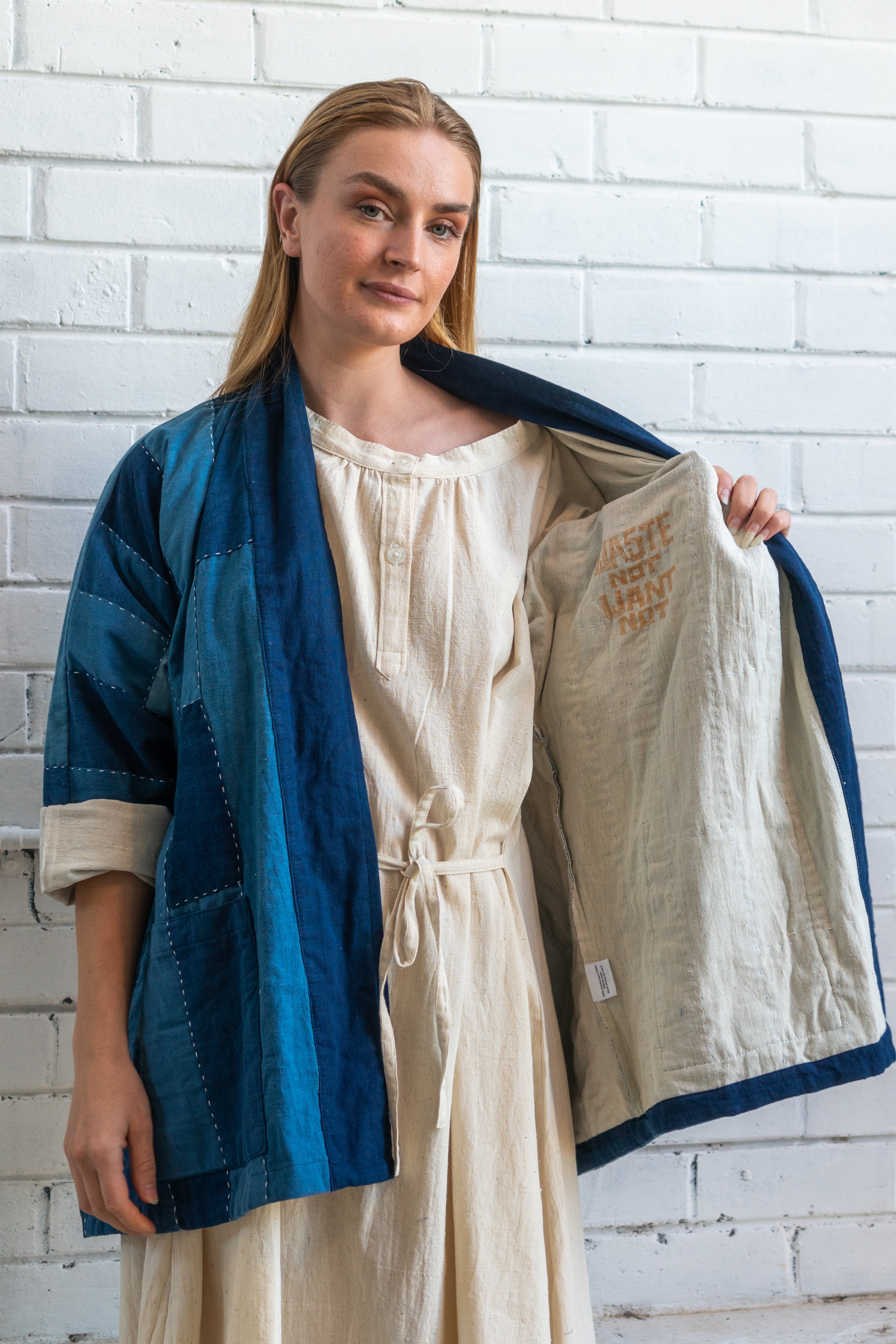 This Waste Not Want Not kimono is made from mid to dark shade indigo offcut strips patchworked together expertly by the team at The Stitching Project. With two deep pocket details and lined with our lightweight khadi cotton, the sleeves roll beautifully to create a seamless contrast look. Stitched with white thread and complete with deep indigo lapel band, this piece makes for a staple in everyone’s ethical wardrobe.