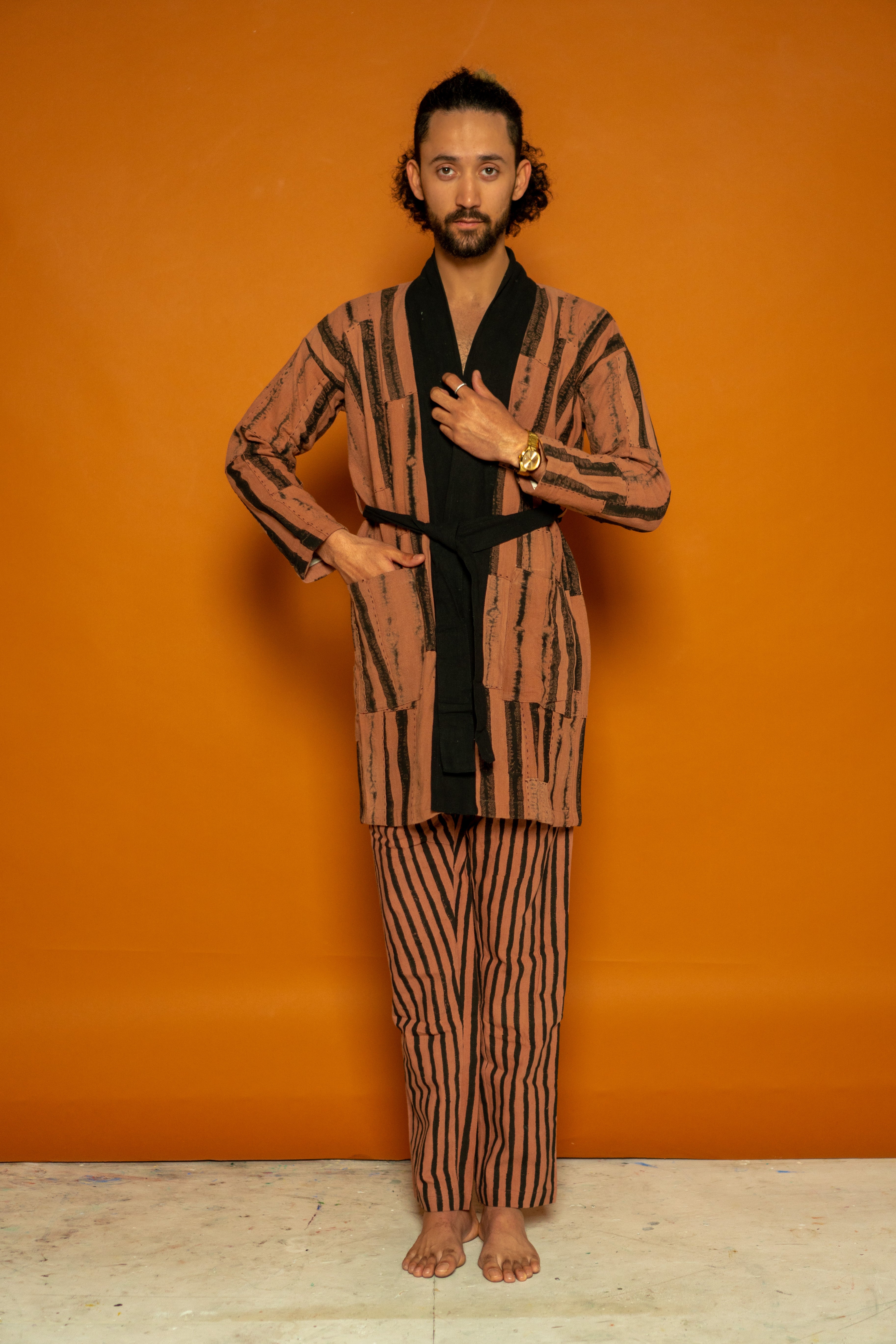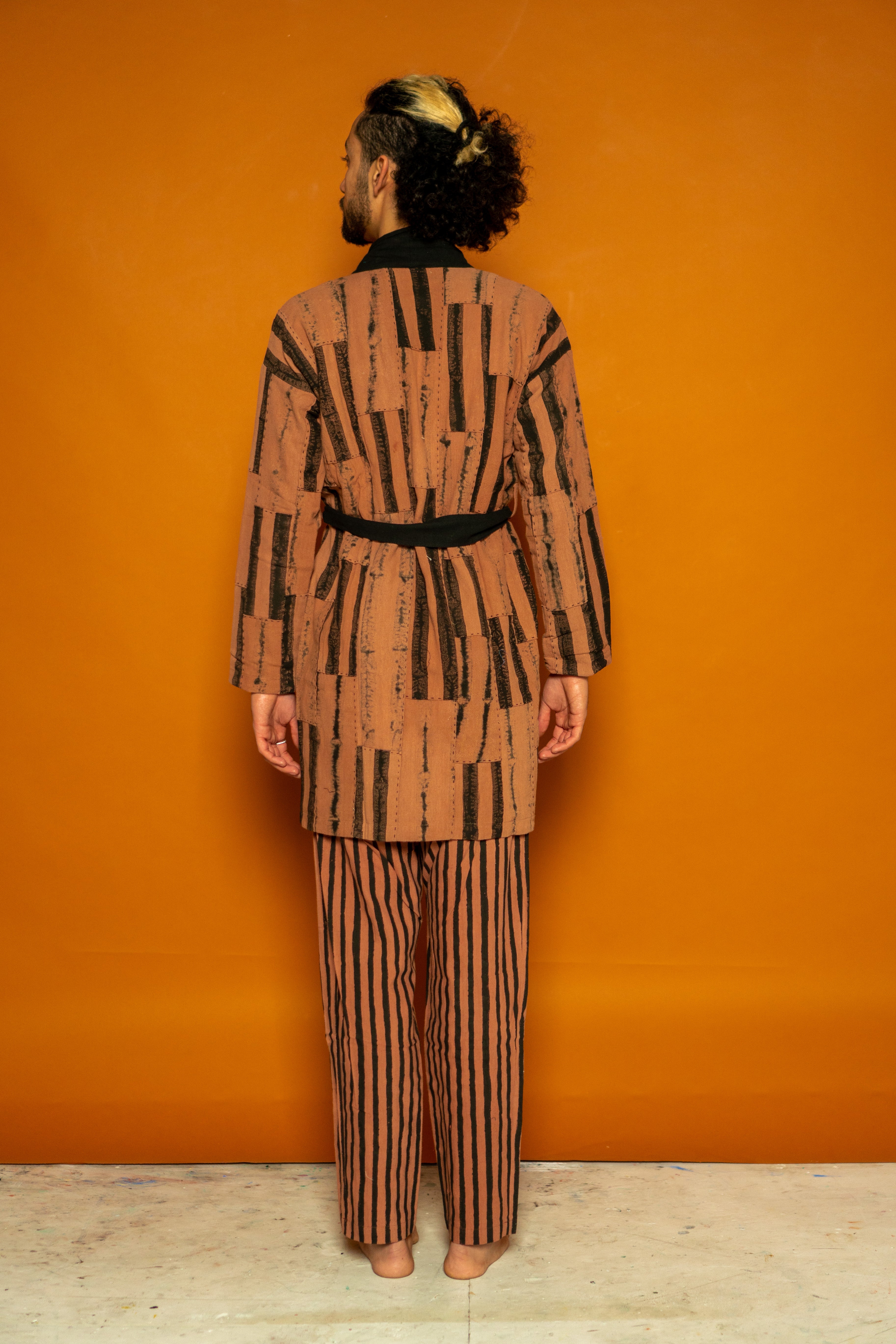 With this in mind, all of our kimonos and jackets are therefore made from different weights of khadi cotton. As a hand spun and handwoven textile, each length of fabric has a slightly different quality and weight to it and may contain small blemishes (which we love and think adds character to the garment). From light dhoti (very light cotton) to LH, medium weight and KK20, medium/heavyweight cotton hand-weave. We have also used some of our luxurious slow machine woven silk cotton to offer you some unique textures in our jackets. All with ‘Waste Not, Want Not’ hand block printed over the left side of the chest, you can always have ethical living at heart.