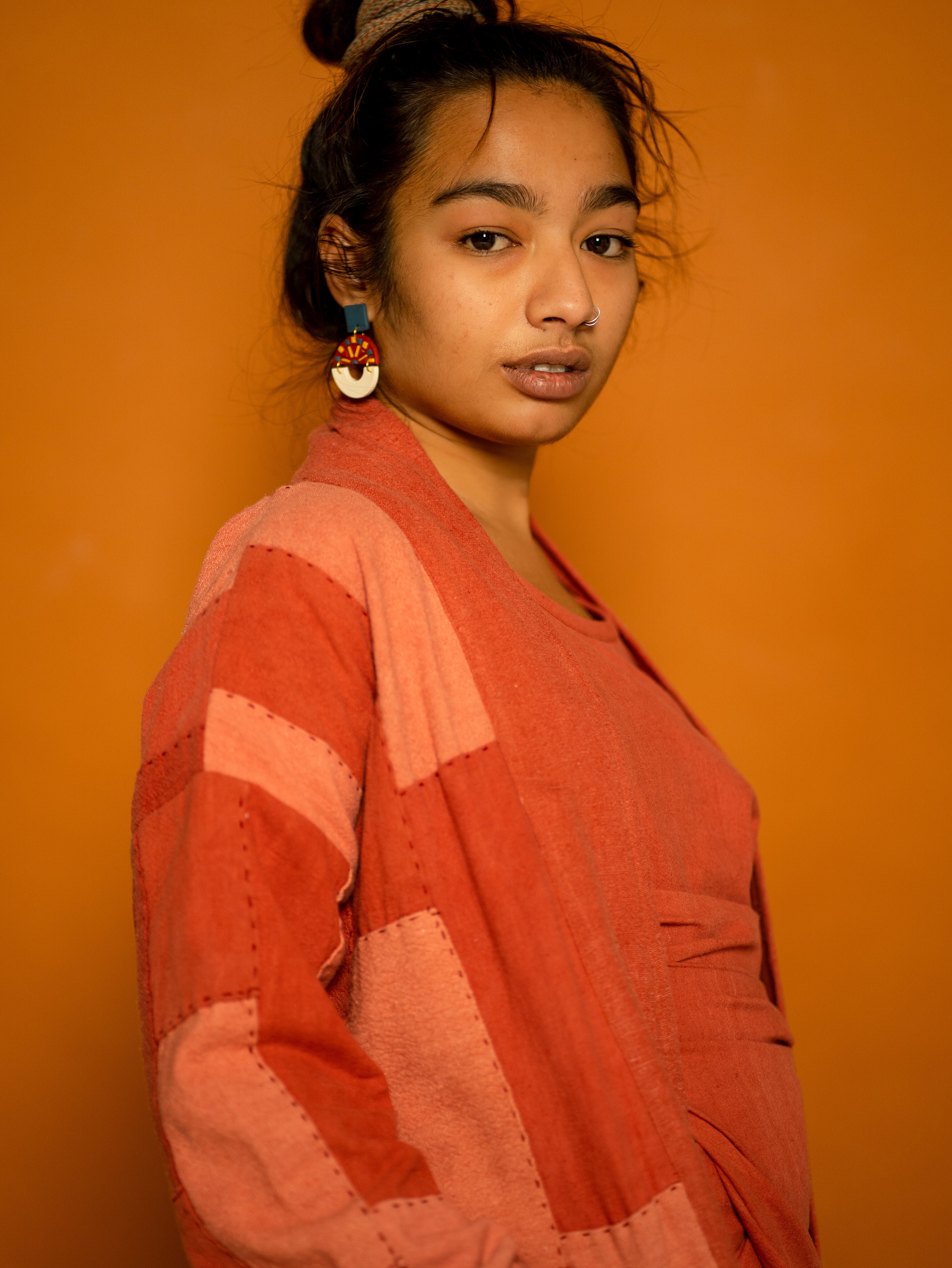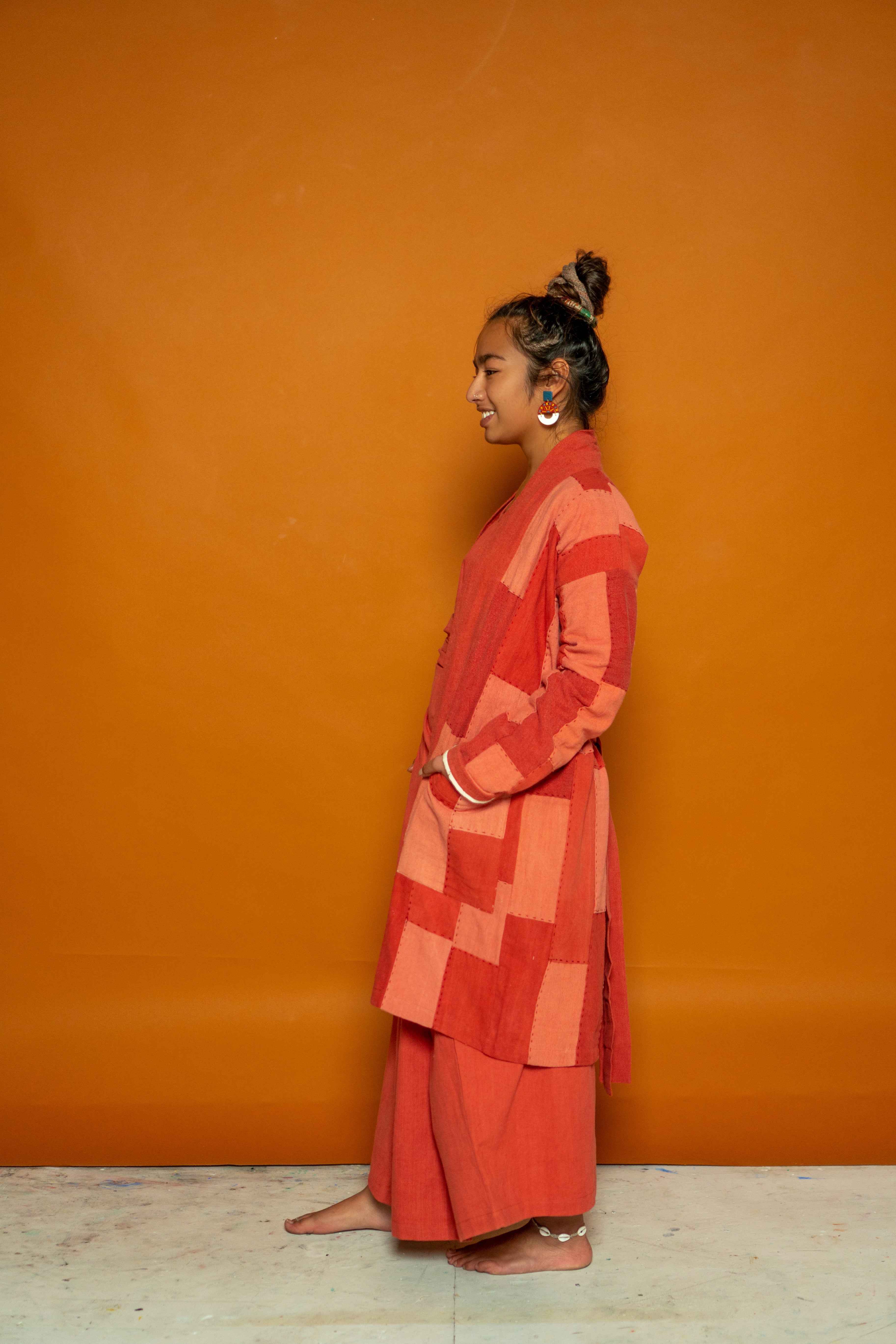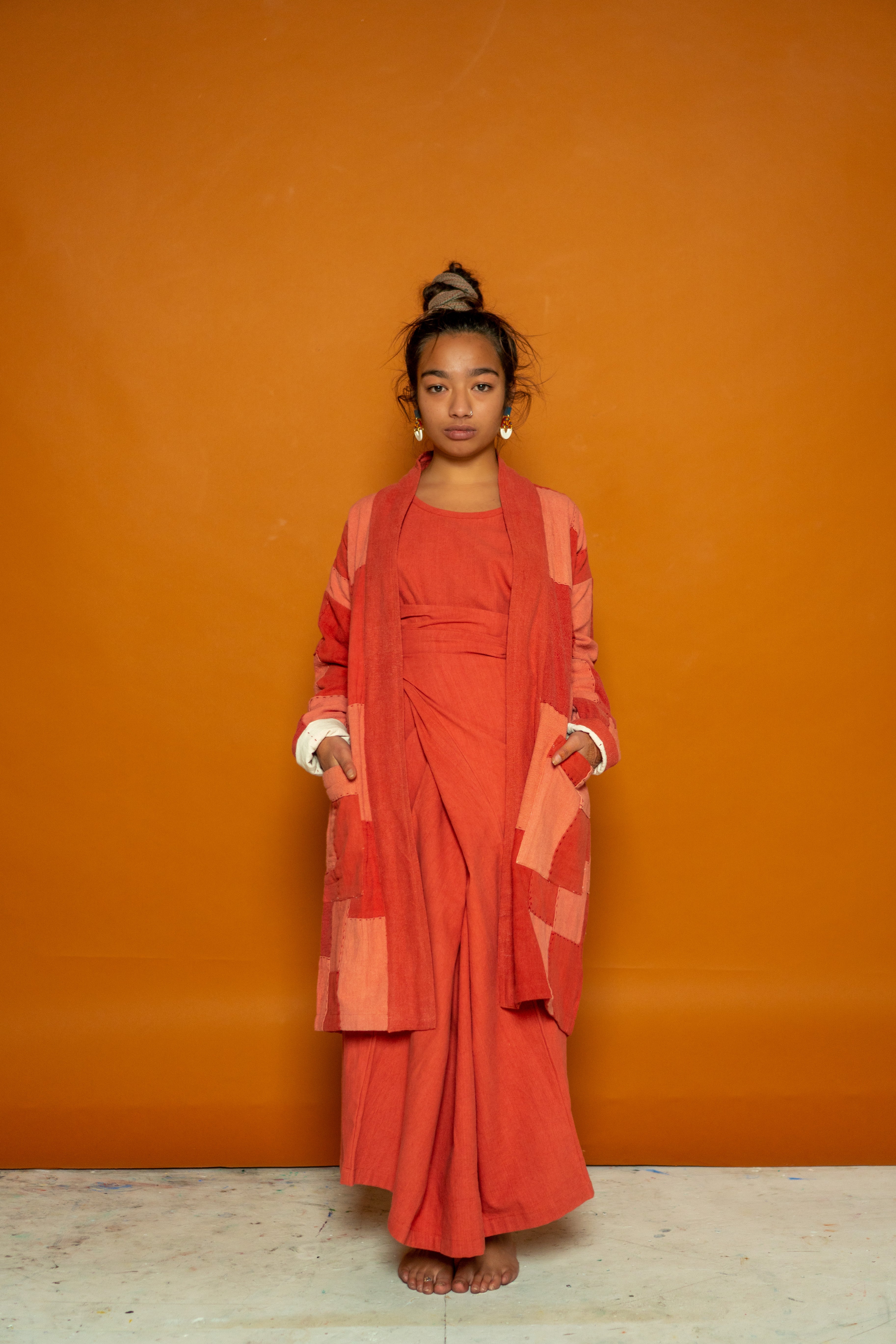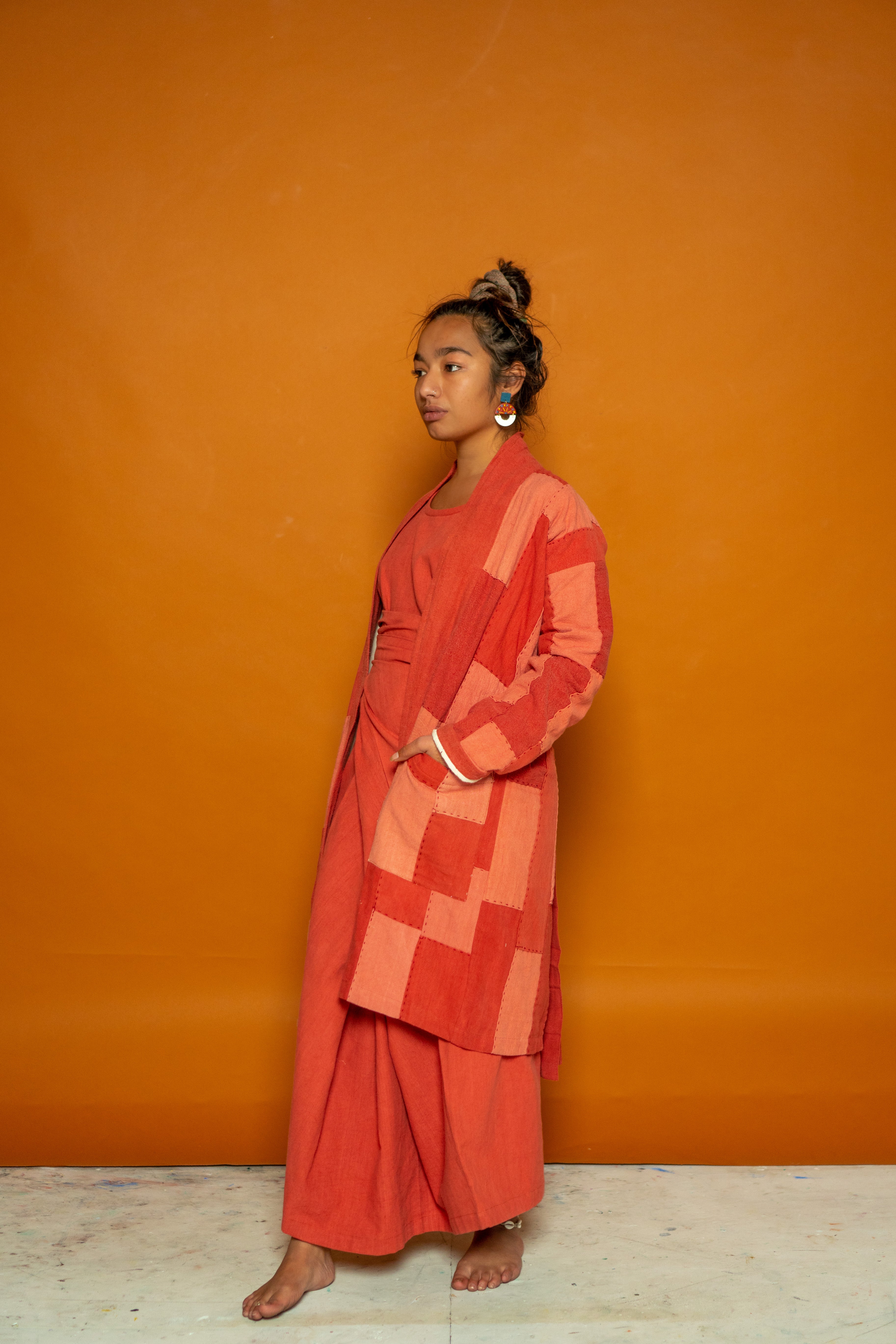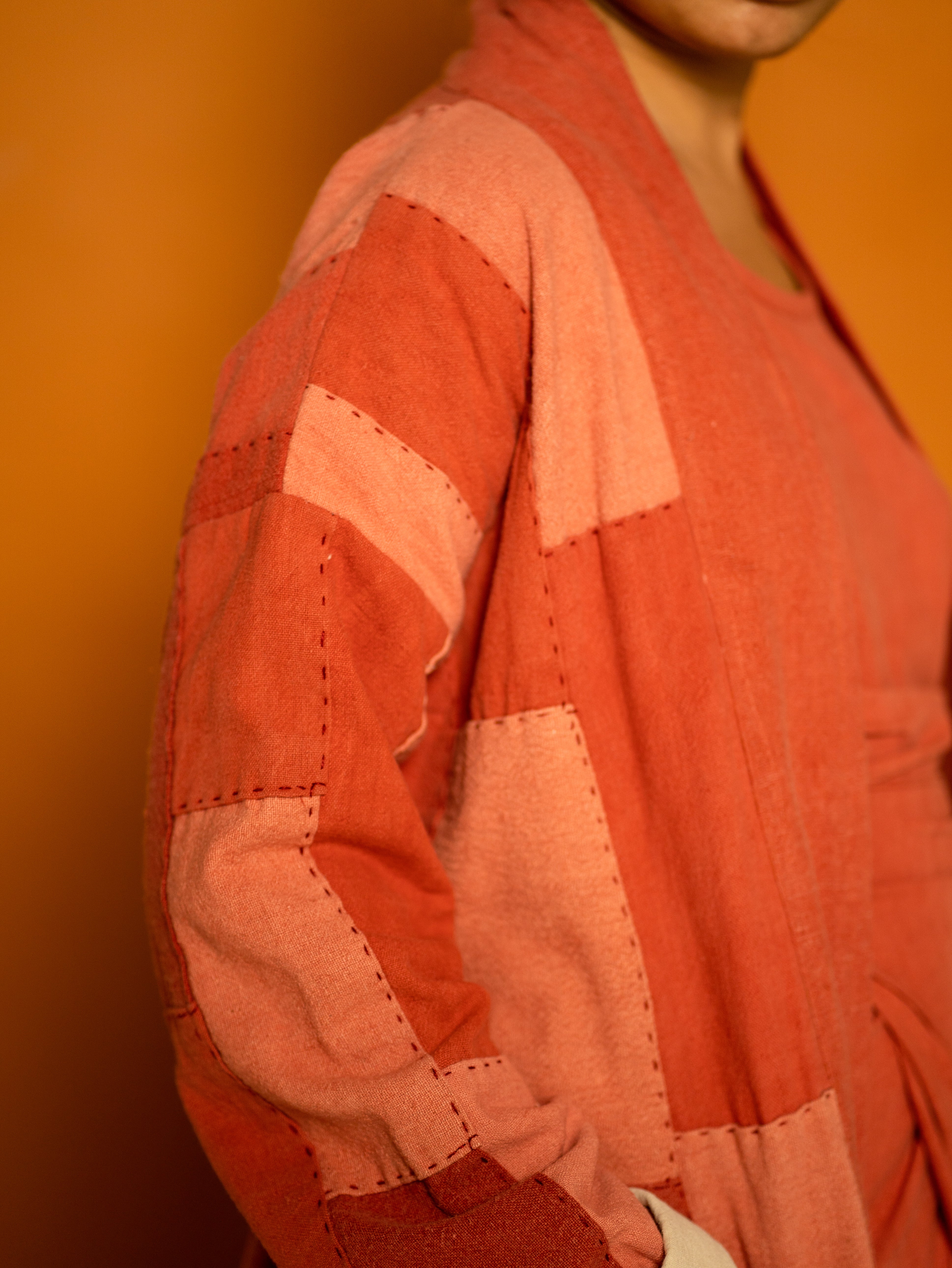 This Waste Not Want Not kimono is made from light to dark madder offcut strips patchworked together expertly by the team at The Stitching Project. With two deep pocket details and lined with our lightweight khadi cotton, the sleeves roll beautifully to create a seamless contrast look. Stitched with white thread and complete with a lapel band, this piece makes for a staple in everyone’s ethical wardrobe.