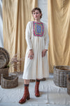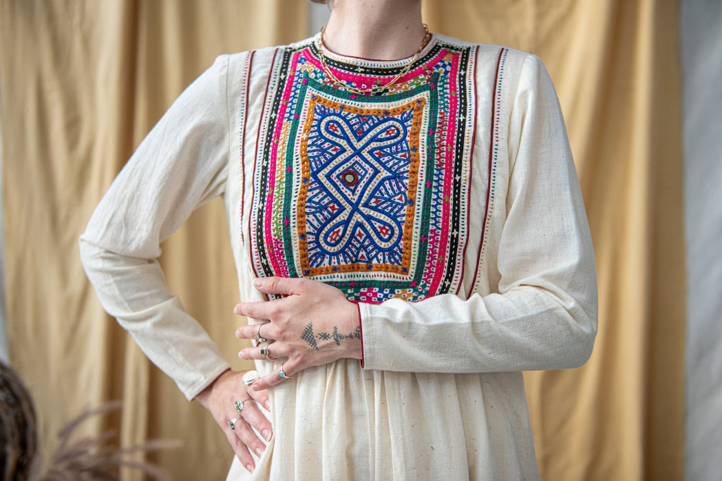Introducing the Round Neck Yoke Cotton Dress, a beautiful addition to our Rabari Collection that celebrates the exquisite artistry of the Rabari community in Kutch, Gujarat. Meticulously crafted and adorned with a stunning hand-embroidered chest panel by the skilled Rabari artisans, this dress blends comfort with traditional craftsmanship, making it a versatile choice for any occasion.
