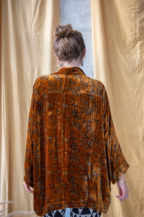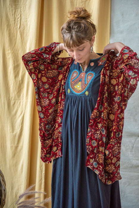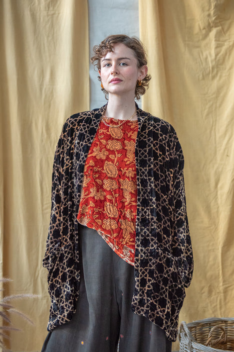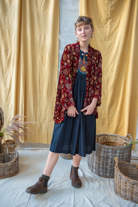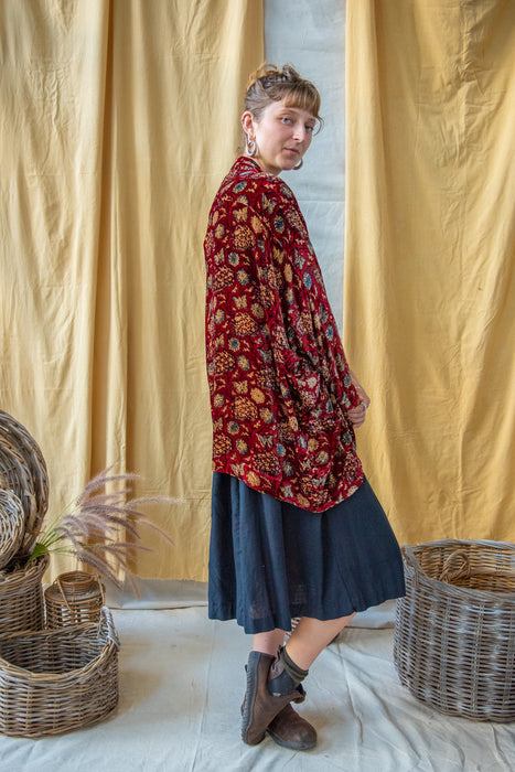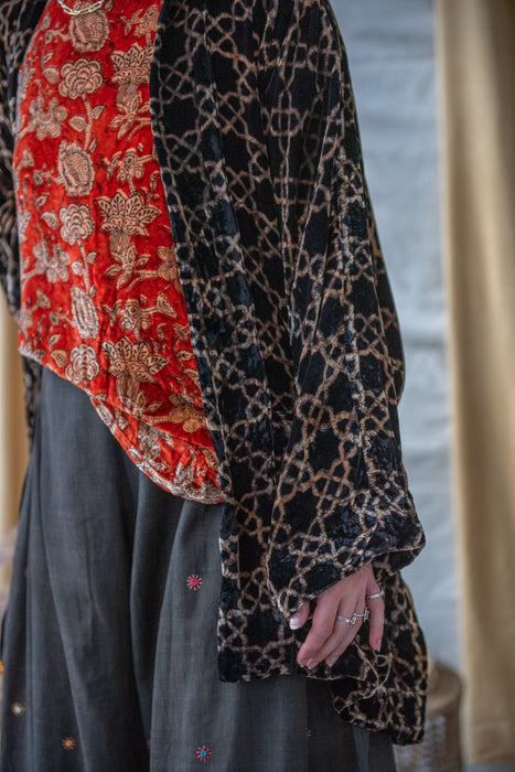 Embrace the elegance and artistry of our Silk Velvet Jacket, a perfect blend of tradition and modern style. Elevate your wardrobe with this unique piece that tells a story of craftsmanship and cultural significance. Featuring a stylish belt and long silhouette, this coat allows for adjustable fit and versatility, accentuating a flattering appearance while adding a chic touch to your overall look.