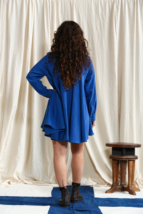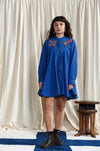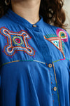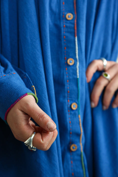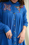 Elevate your wardrobe with our stunning Embroidered Shirt Dress by the talented artisan Geeta Bhavesh Rabari, showcasing traditional motifs of authentic Rabari hand embroidery in a dazzling array of colorful threads that beautifully contrast against the high-quality handwoven cotton fabric.