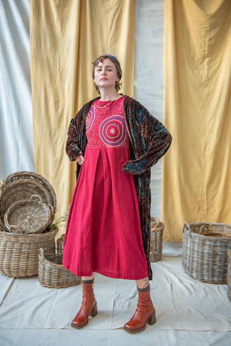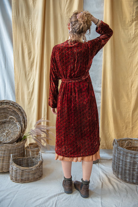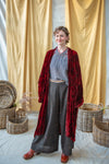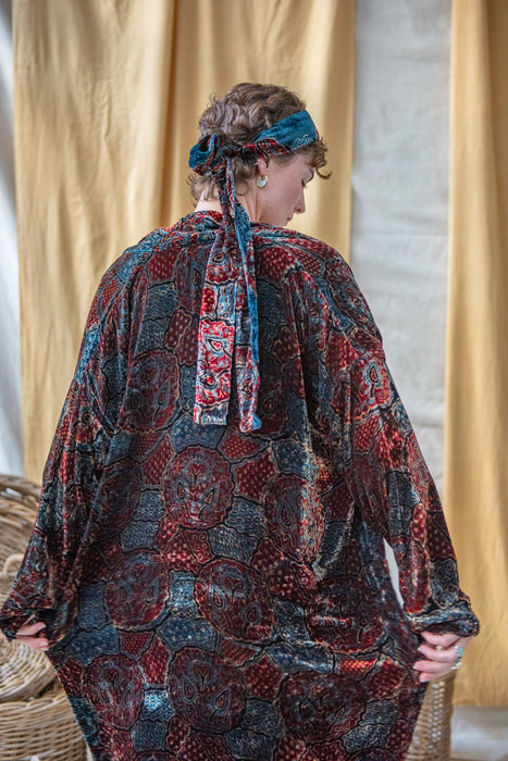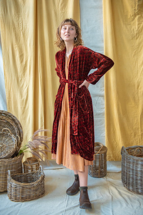 Embrace the elegance and artistry of our Silk Velvet Long Coat, a perfect blend of tradition and modern style. Elevate your wardrobe with this unique piece that tells a story of craftsmanship and cultural significance. Featuring a stylish belt and long silhouette, this coat allows for adjustable fit and versatility, accentuating a flattering appearance while adding a chic touch to your overall look.