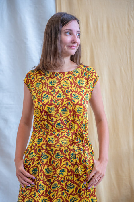 Experience effortless elegance with our Modal Silk Cap Sleeve Long Dress, a beautiful piece from our Ajrakh Collection, crafted by master printer Suffyian Khatri. Equipped with functional pockets, this dress combines comfort and style with added everyday convenience, making it a perfect addition to your essential wardrobe.