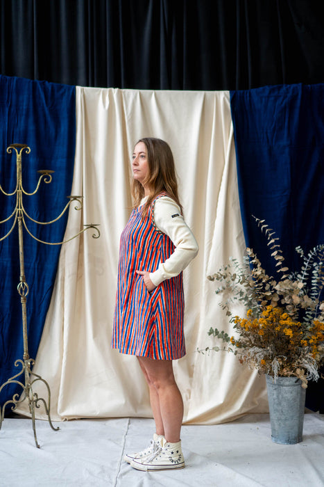 We have a new tunic block at last, after many requests for one! Much like our tunic vest from the Game Changer Collection, our Contrast Pocket Tunic is hand-block printed in our bold Orange and Blue Thick Stripe print. It has beautiful deep pockets with contrast fabric using our orange and teal waffle print. This must be the most versatile tunic of the season, with its rounded neckline and v-cut feature, the straps are thick and sleeveless, so works best to layer with a bold orange skivvy in the winter, or pair with a pair of cord flares and you’re ready to race out the door. Whether you choose to wear this hand-spun and hand-woven textured khadi piece as a dress on its own on a hot summer day or layered with a polo-neck and pants in the colder months.