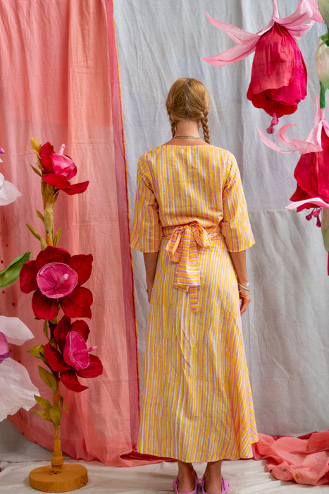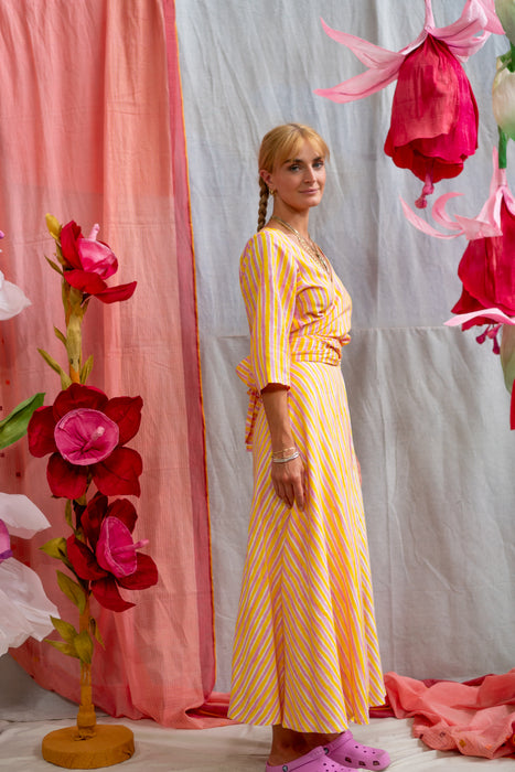 Pink & Yellow Candy Stripes – featuring our bold iconic block printed stripe and Bonnie’s love of playful, bright colours in her work, this motif is hand block printed with GOTS Certified ink on khadi cotton.