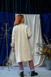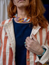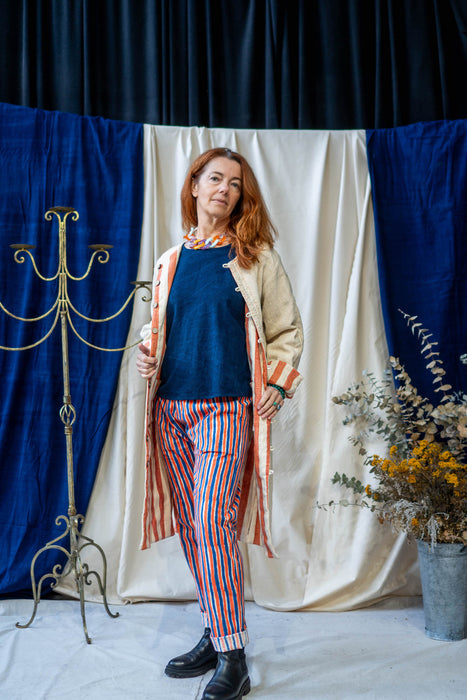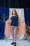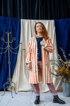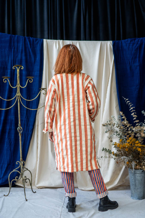 A brand new hero piece in our collection, The Reversible coat features a wide striped soft coral pink and natural coloured cotton and backed with a plain Khadi, both in heavier weight, textured weaves. Hand stitched around the collar and bottom hem on the plain Khadi side of the coat are three lines in orange and purple, for a beautiful, subtle detailing.