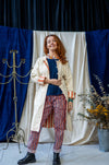 This luxurious modular coat is unique in that there are so many ways to style it. It has no collar, so feels casual enough to wear around the house when entertaining, but it’s texture and bold stripe allows for a more elevated styling as a statement coat for your date night outfit. Style this with a basic white dress underneath, or your favourite pants and band tee for that classic look.