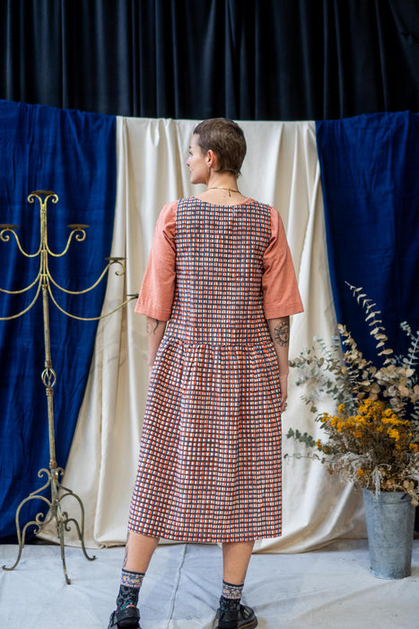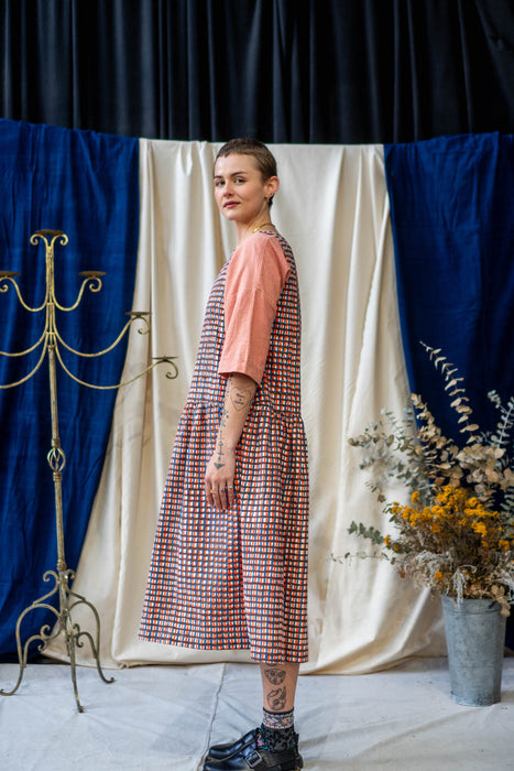Our favourite drop waist dress is back with fun prints! Created by layering the same block over itself in two different colours, and positioned slightly skewed over the previous colour to create an almost 3D shadowed effect.