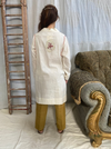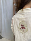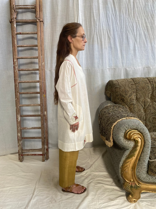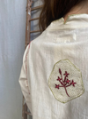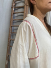The Ixora Tunic in White falls to the knee with hand embroidery appliques in various places, namely the blanket stitch around the collar and underarm panel in contrasting thread, and Ixora flowers (commonly known as the Jungle Flame Plant) that adorn the back panel and right hand sleeve that are native to Sittilingi, where Porgai Artisans live and work.