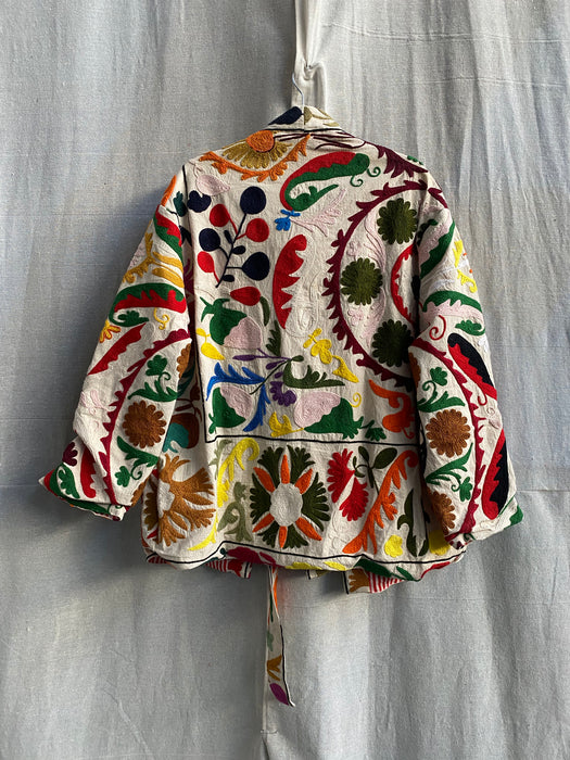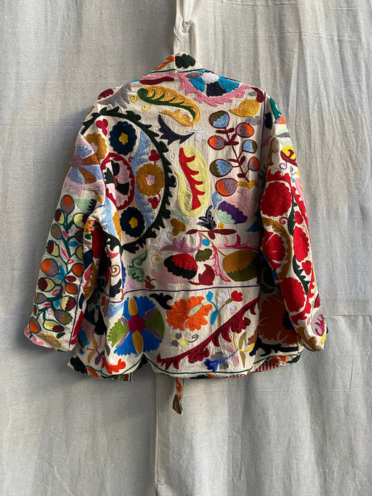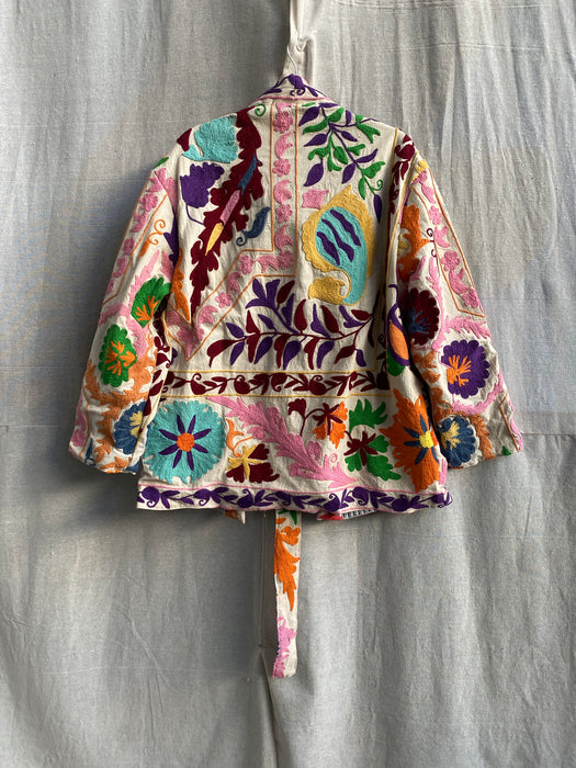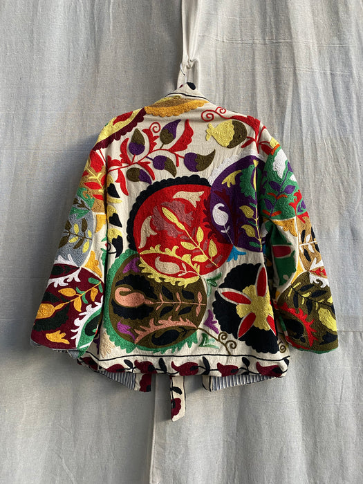 Our upcycled Suzani Coats are a one-of-a-kind treasure for textile lovers. Hand-embroidered and fully lined, each jacket is thoughtfully crafted with unique placement of traditional Suzani textiles—featuring the original border on the lapel and a central motif on the back. With practical details like pockets, a tie waist, and adjustable cuffs, these jackets blend heritage craftsmanship with modern wearability.